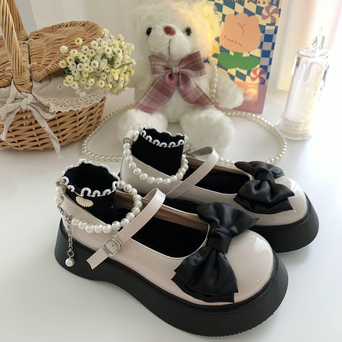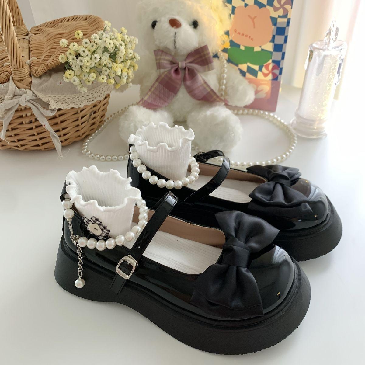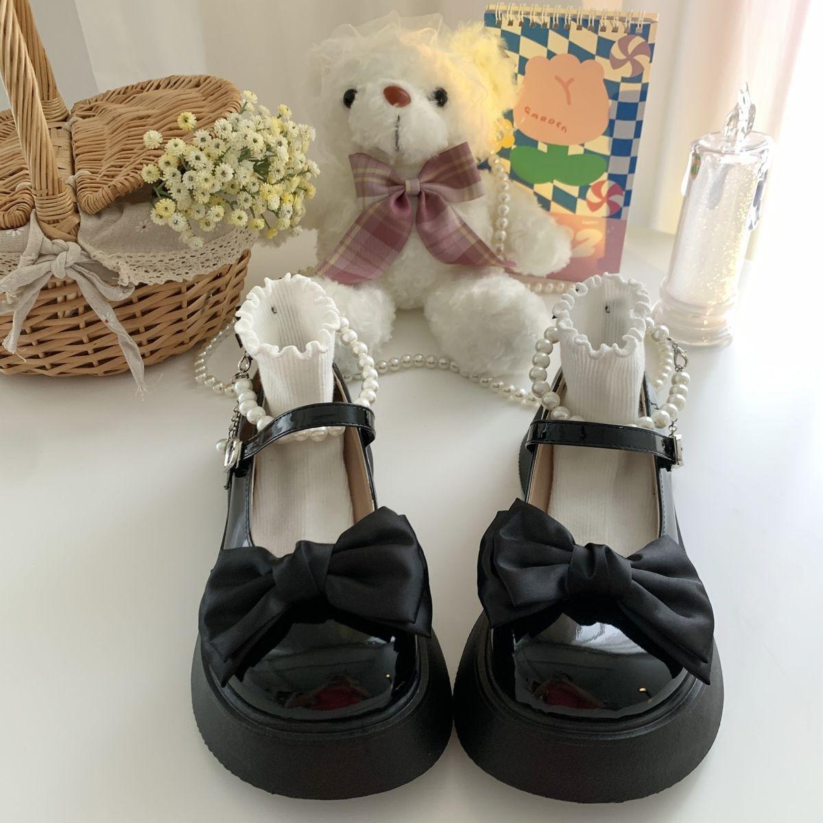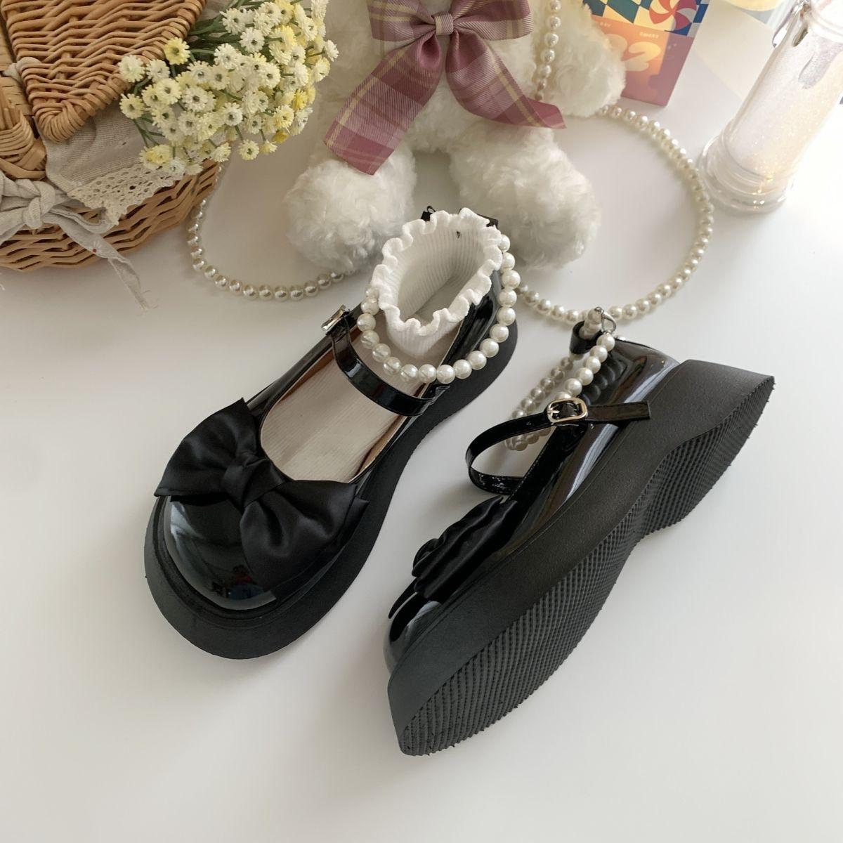 Zapatos Mary Jane de una sola capa con lazo de perla, zapatos japoneses JK de cuero pequeños con suela gruesa para mujer, zapatos de punta redonda con aumento de altura para estudiantes, lindos zapatos de punta grande.