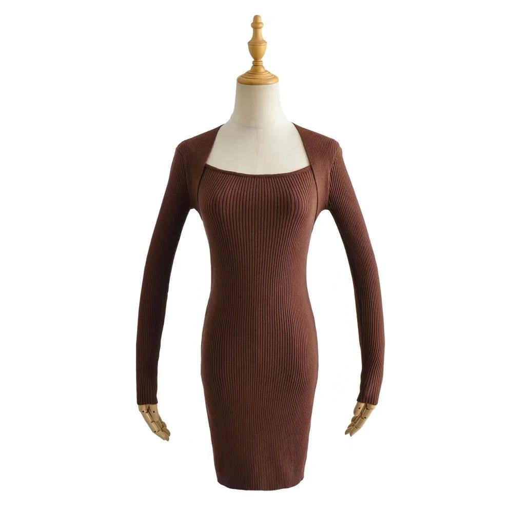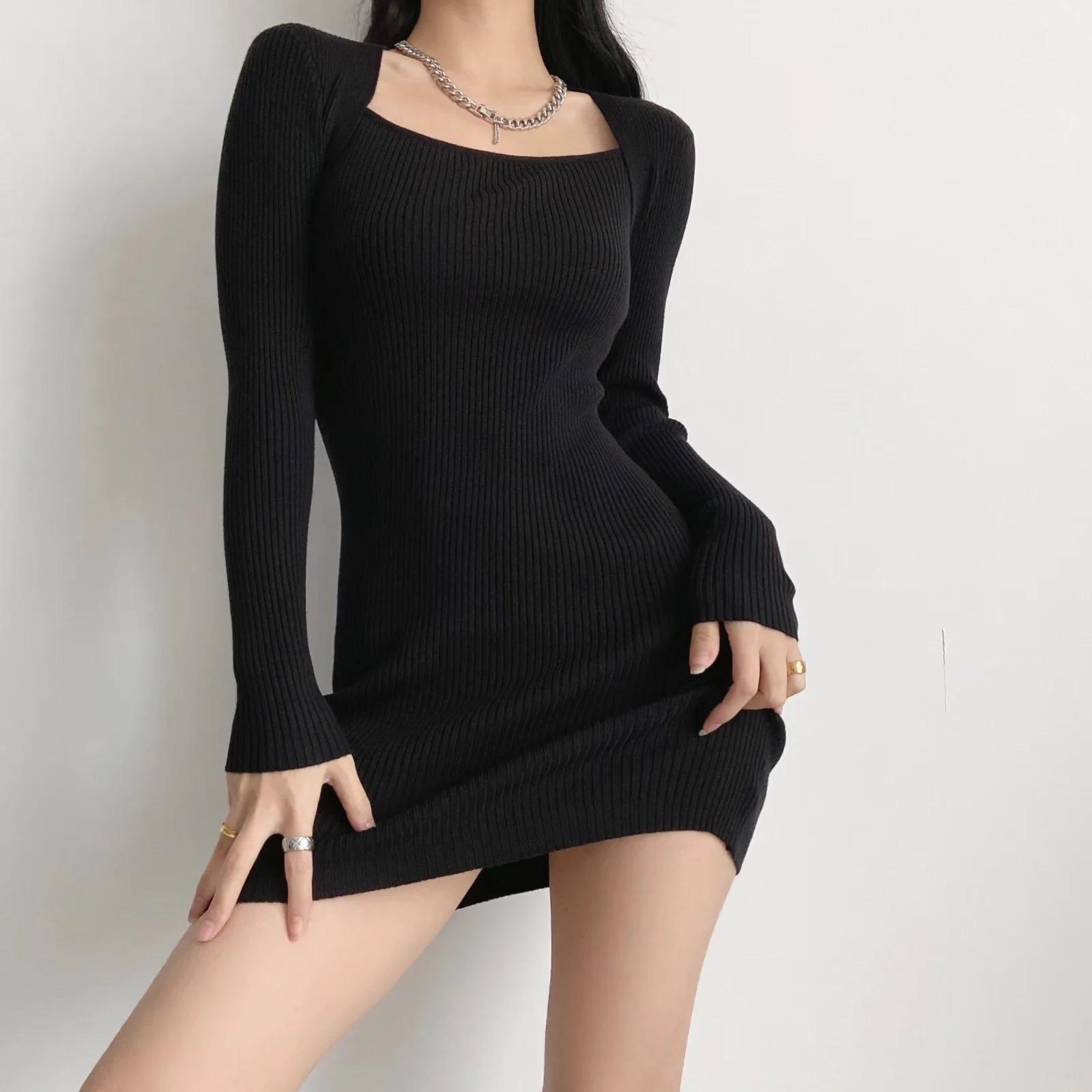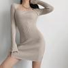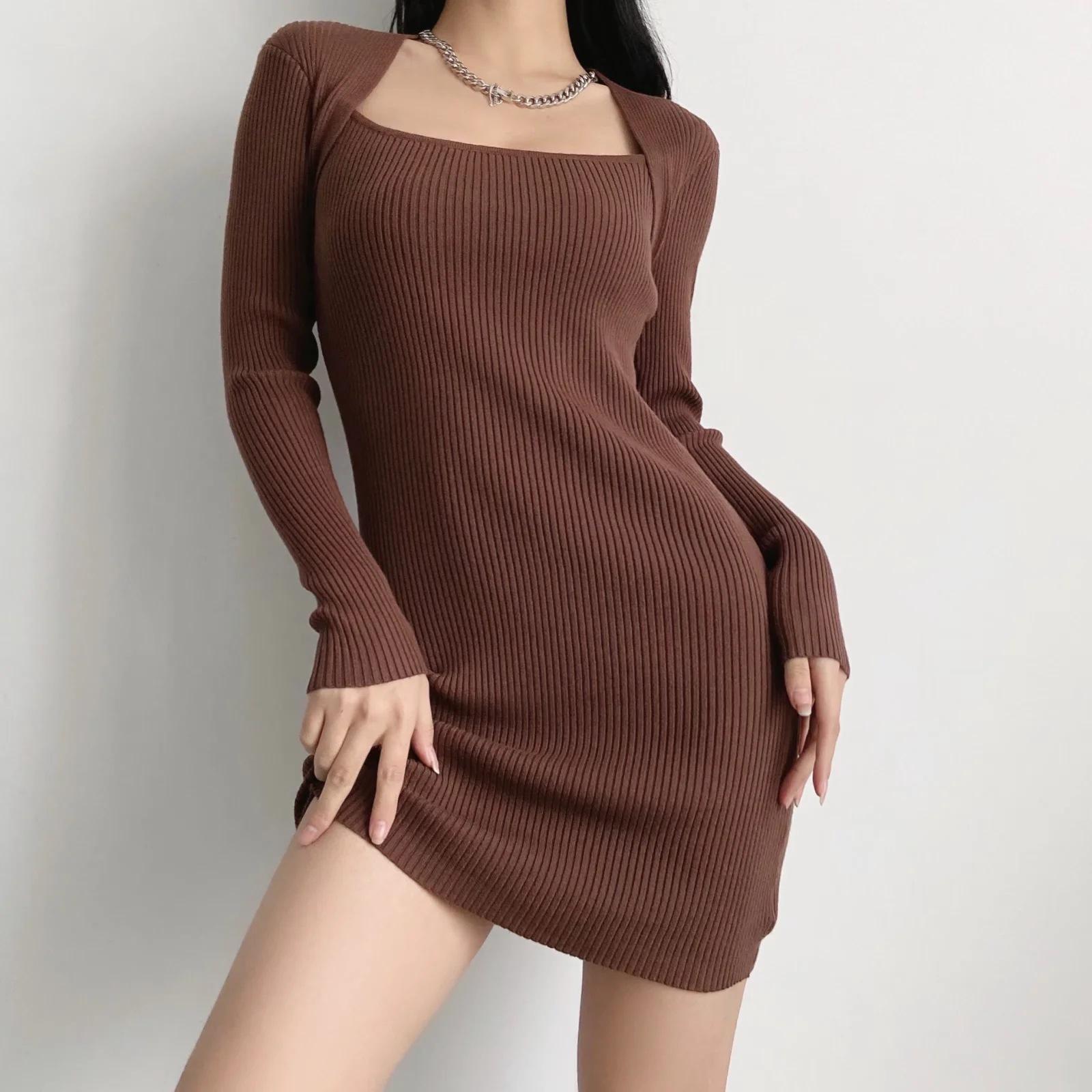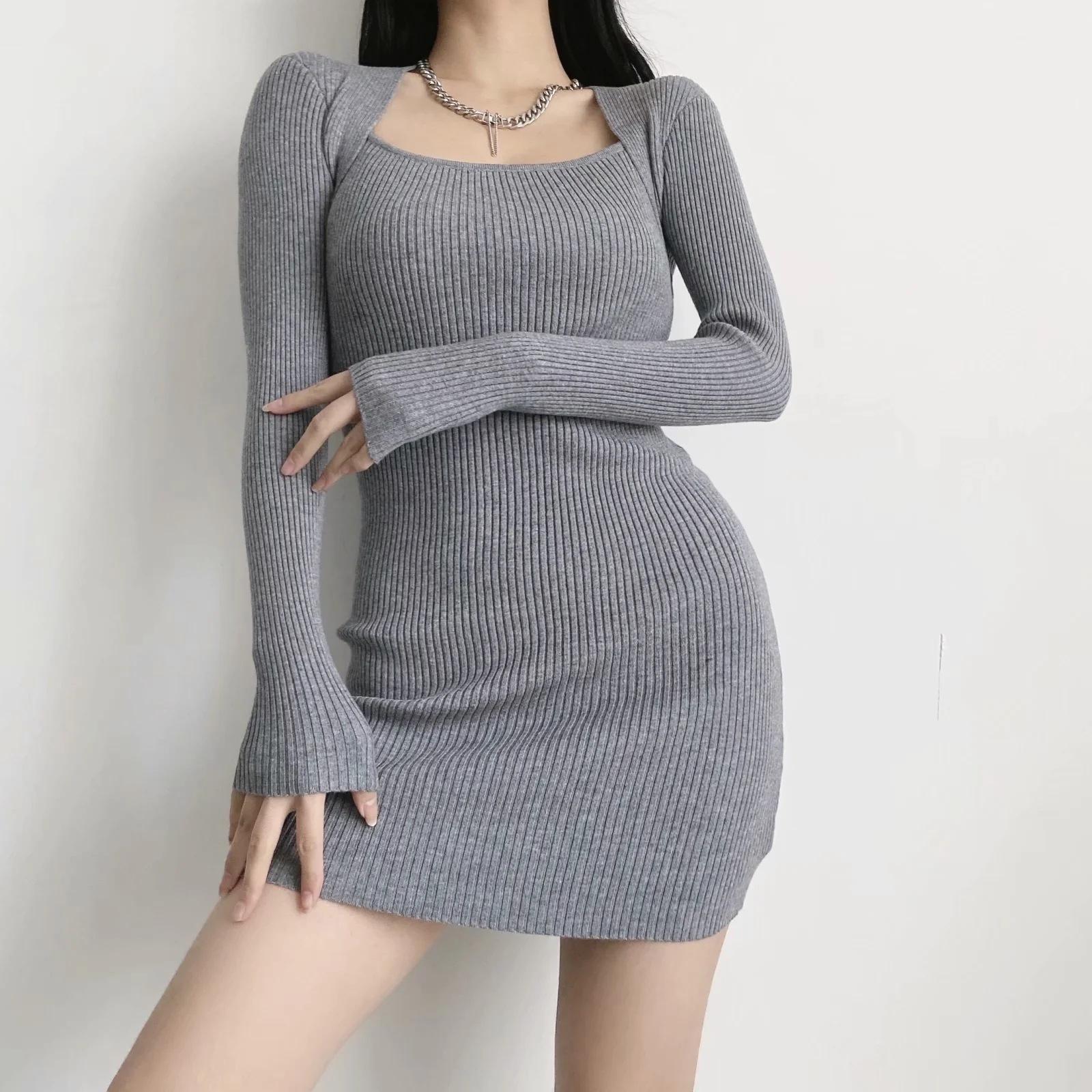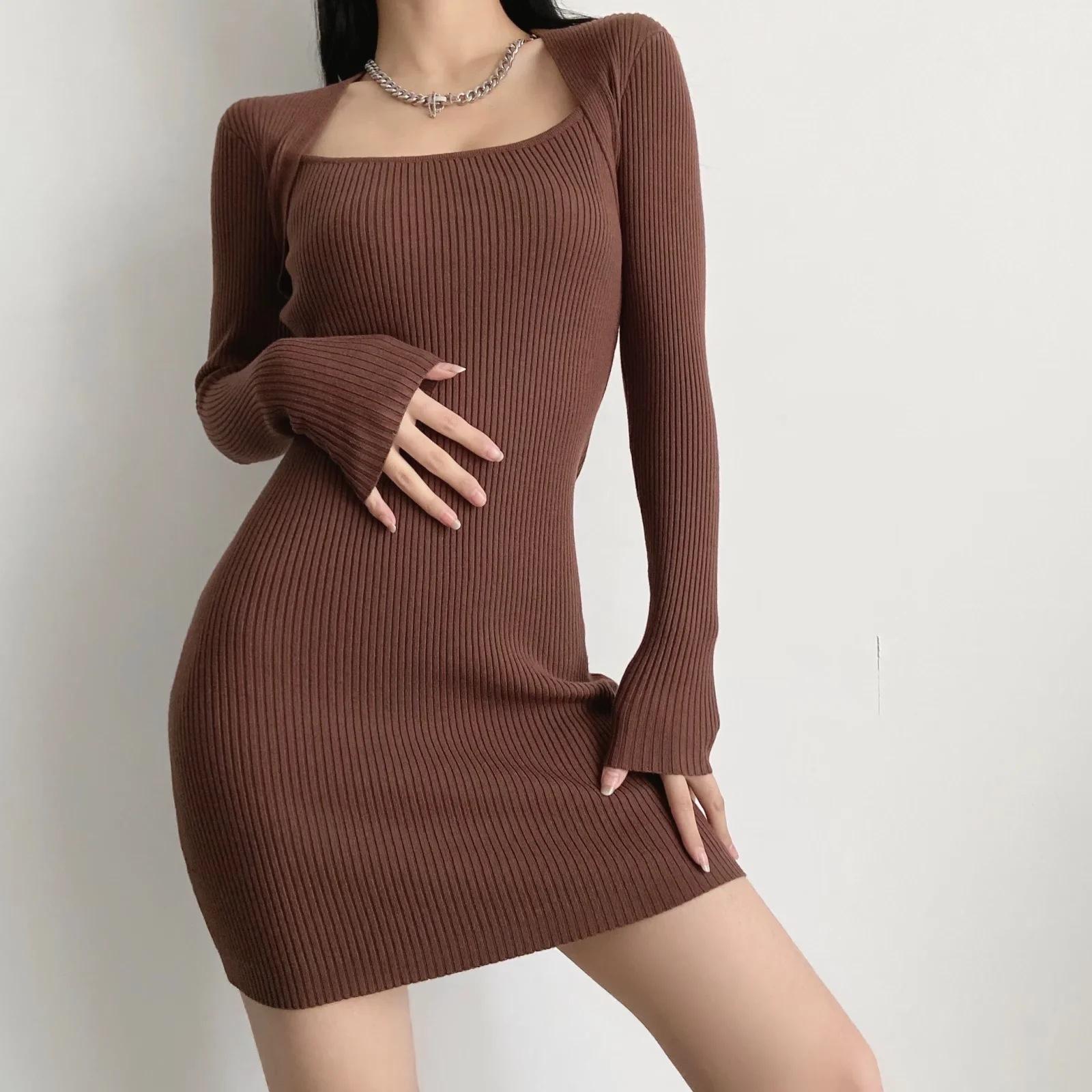 Vestido Tejido Sexy Adelgazante de Otoño e Invierno de Manga Larga Femenino Ceñido a las Caderas Ins Falda Corta para Mujeres
