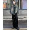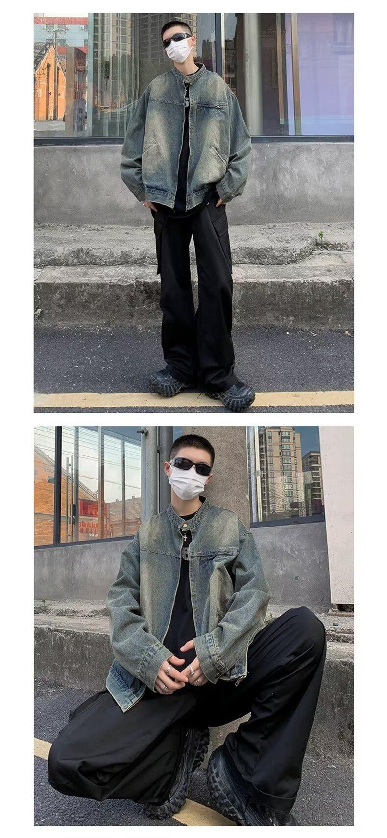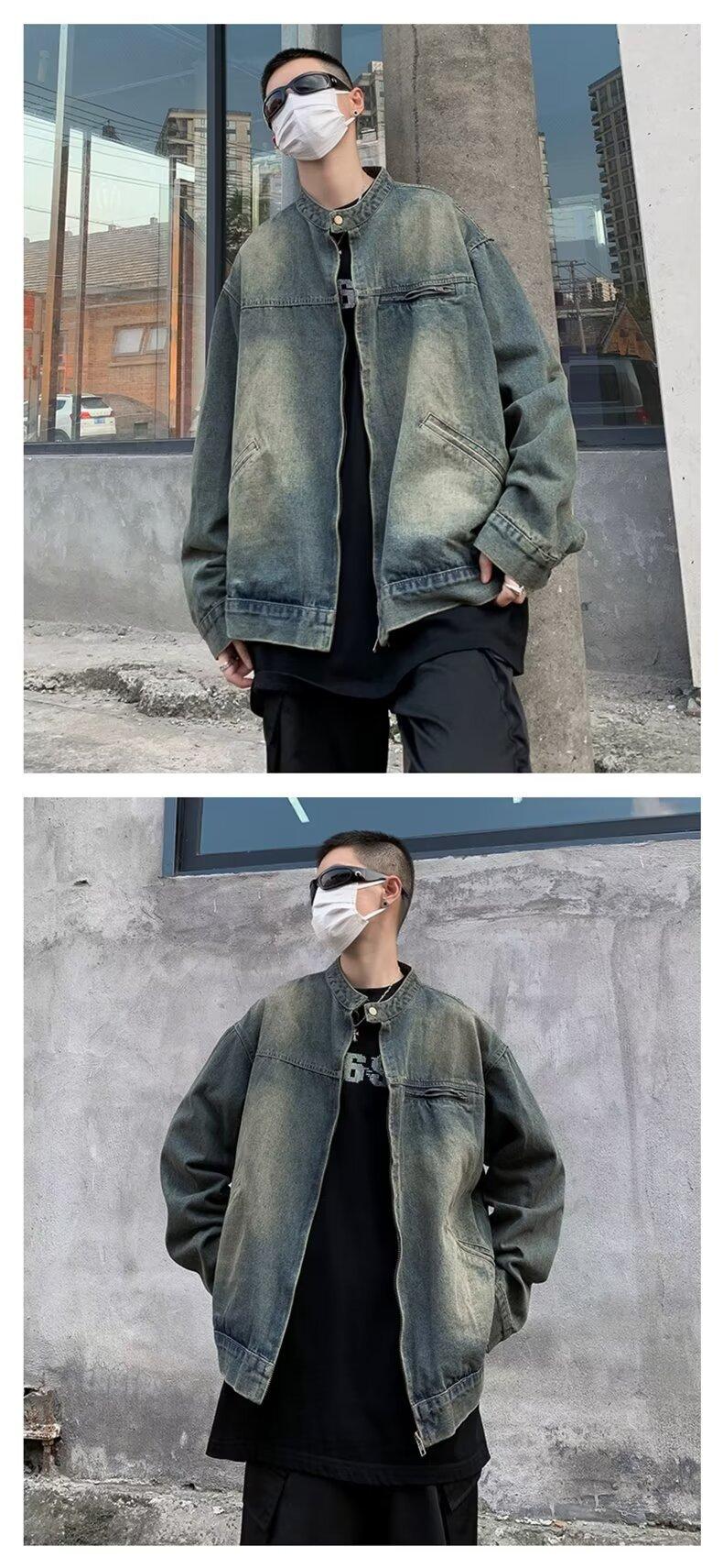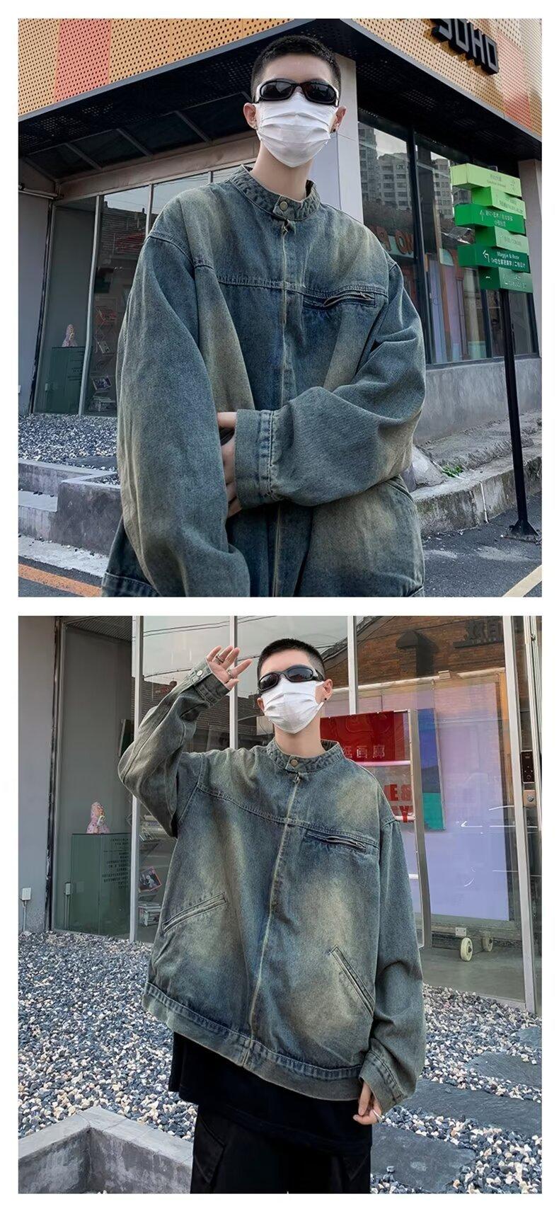 2025 Primavera y Otoño Azul Nostálgico Retro Suelto Bolsillo Grande Cuello Mao Chaqueta de Mezclilla Casual para Hombre con Cierre Superior Trendy