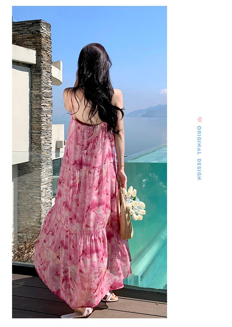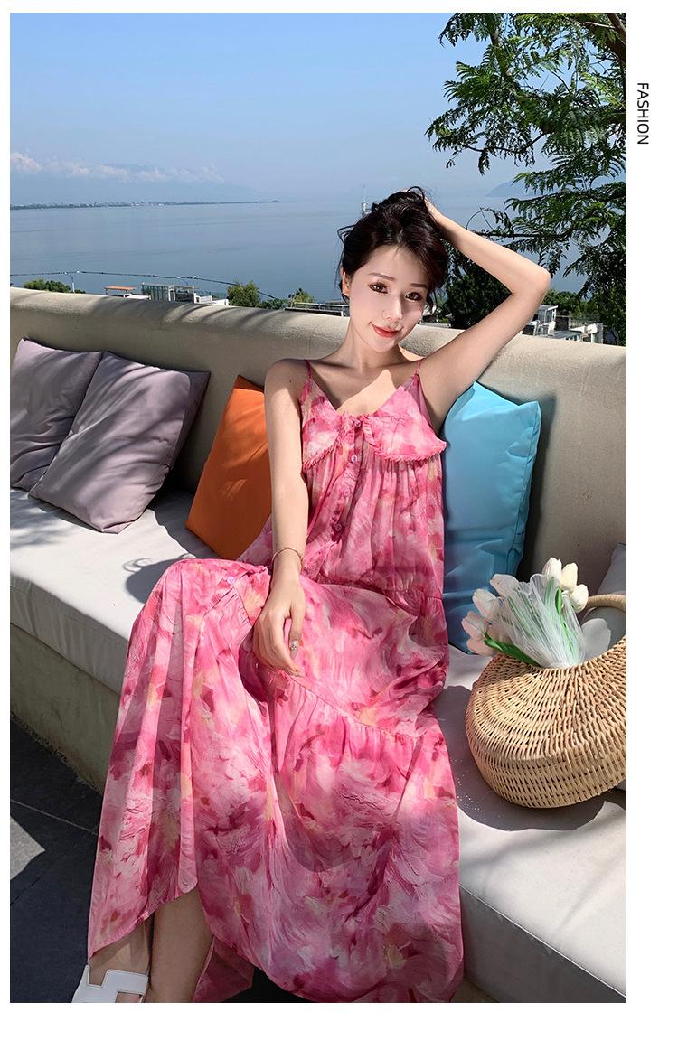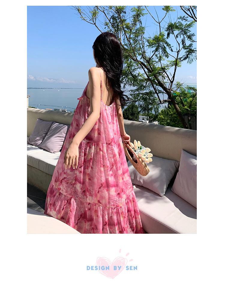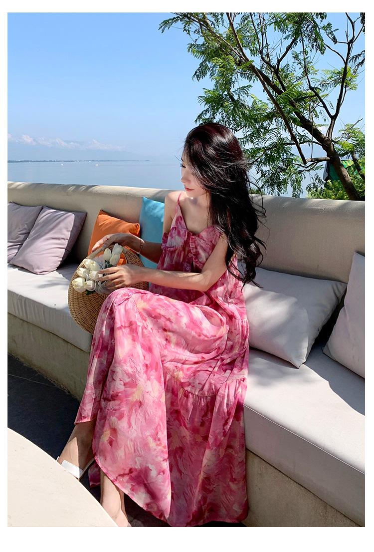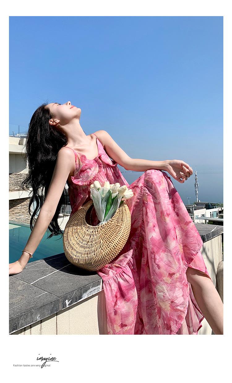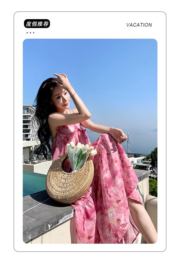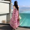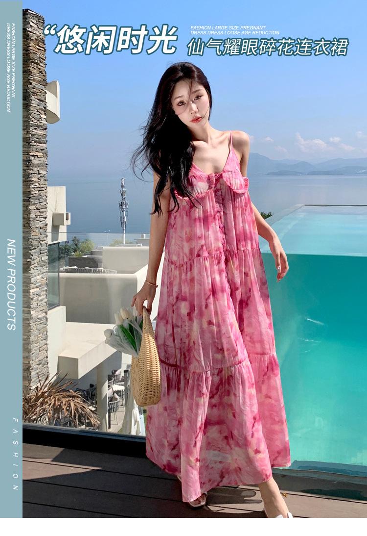 Vacaciones de Verano Sanya Vestido Largo Suelto Bohemio con Estampado Floral, Tirantes Espagueti, Hada Princesa, con un Ambiente Moderno y Elegante
