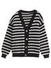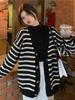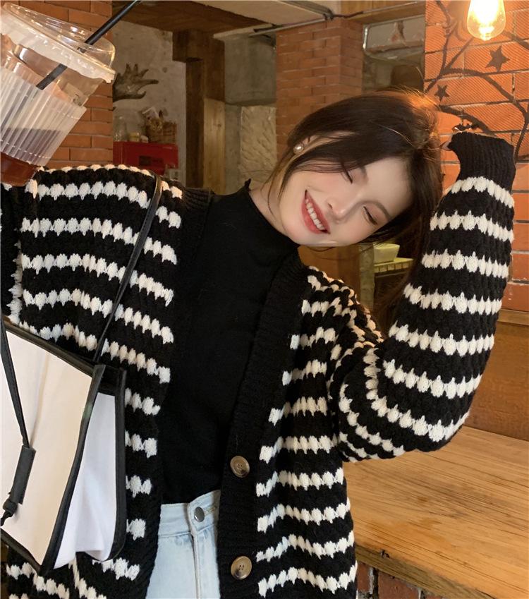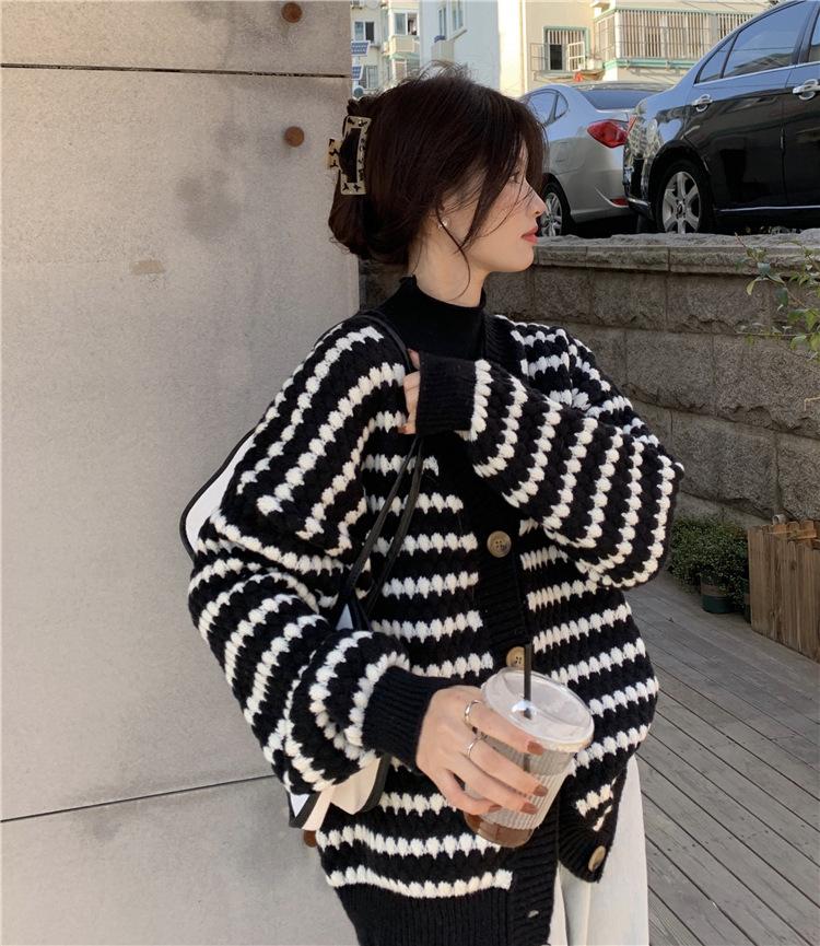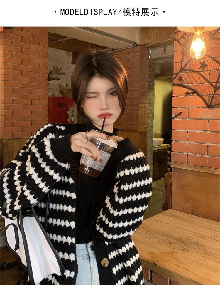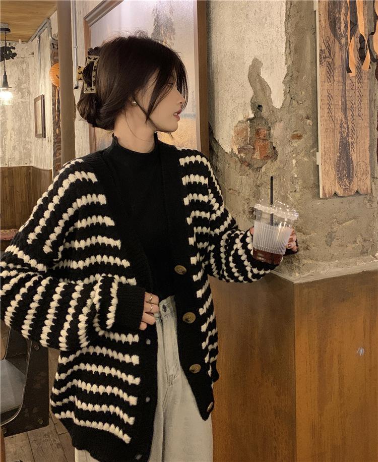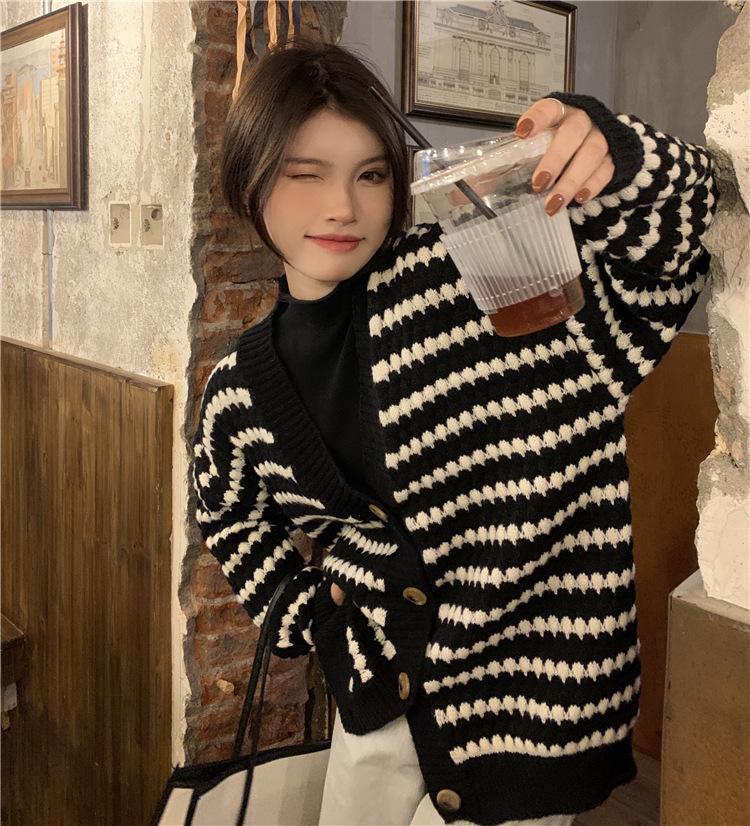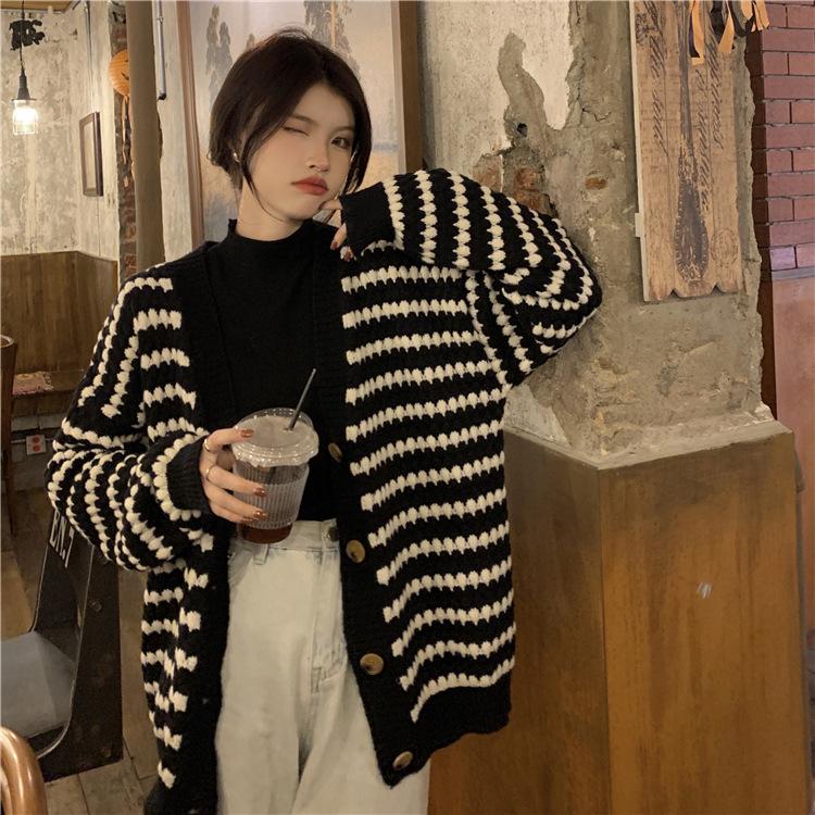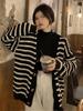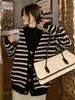 Cárdigan de punto con cuello en V a rayas estilo Chanel de primavera y otoño para mujer, ropa exterior de moda, suéter de estilo perezoso, abrigo informal holgado para mujer