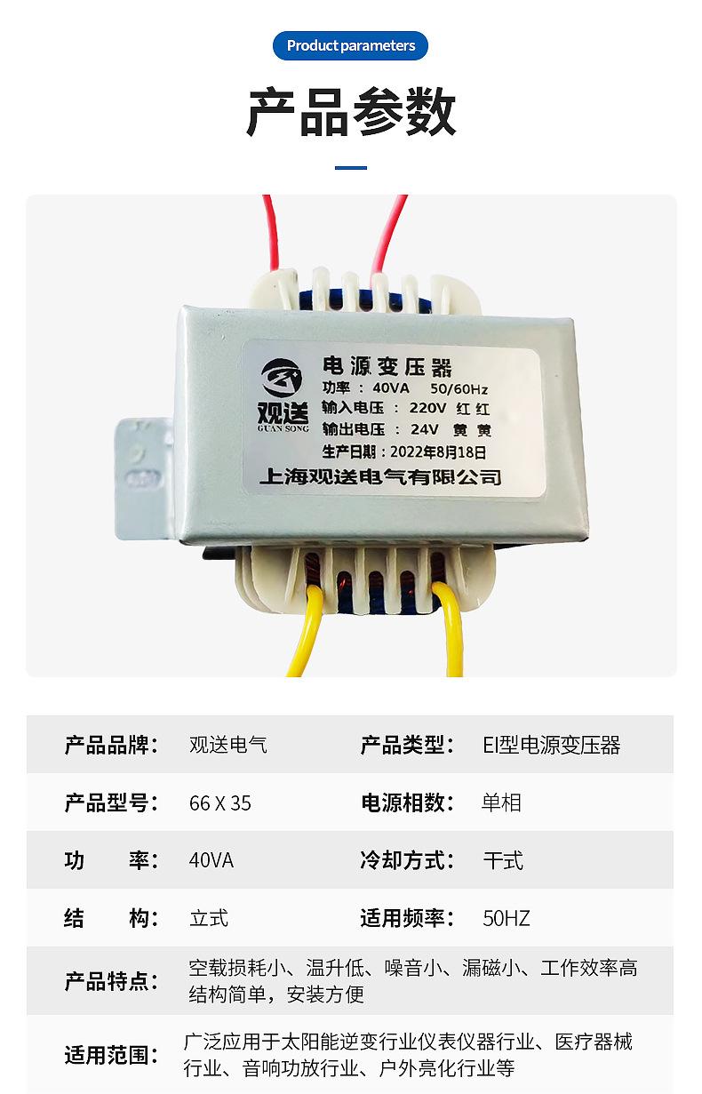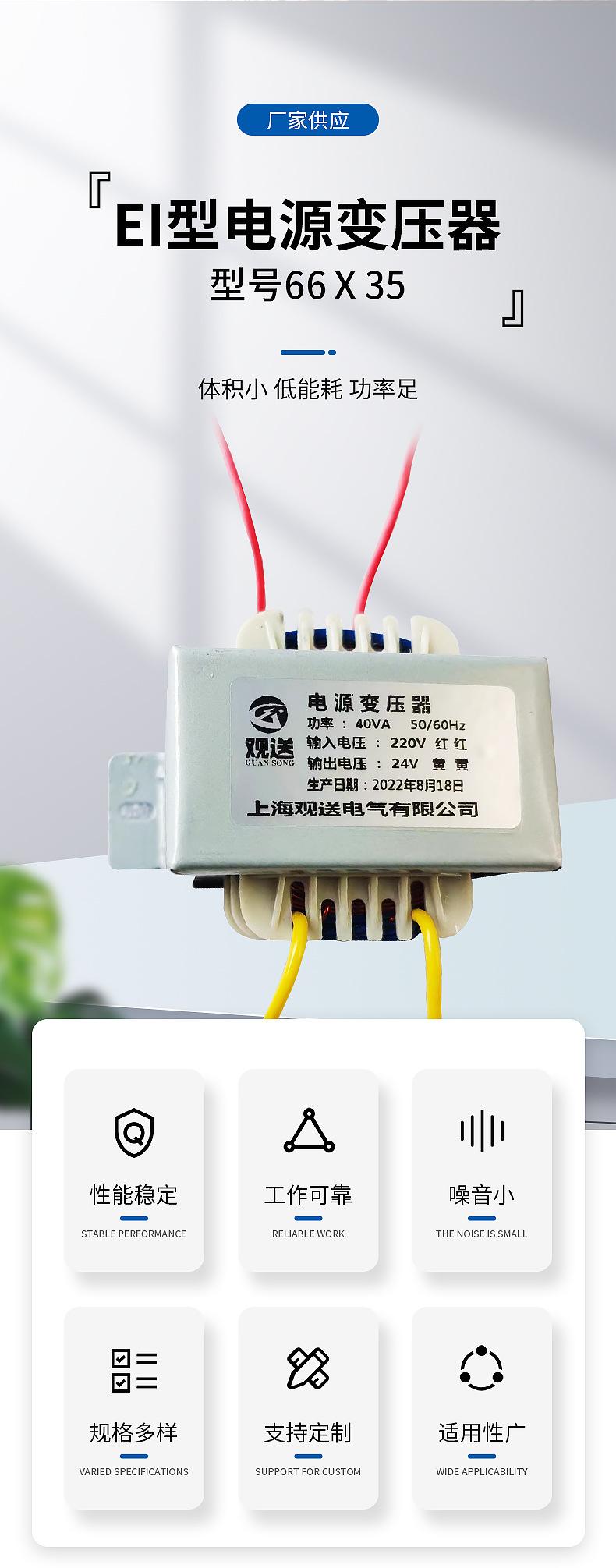Transformador de aislamiento de potencia, tipo 66X35, 40 VA/24 V, con clip de montaje, suministrado por fábrica.
