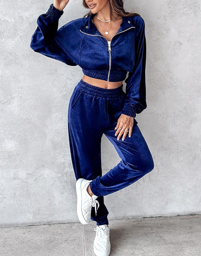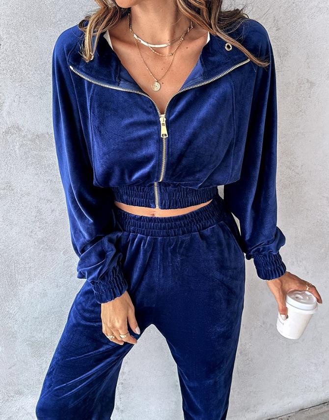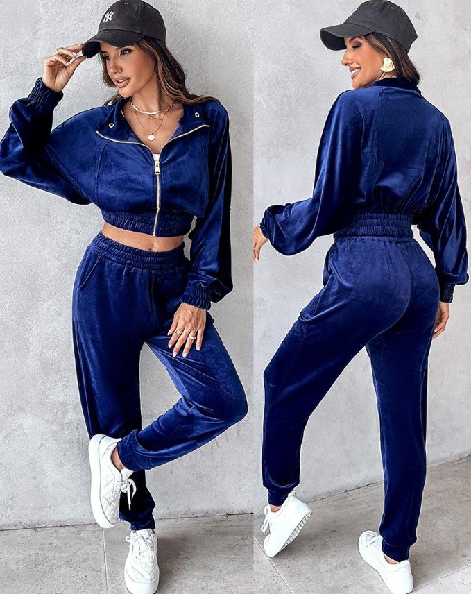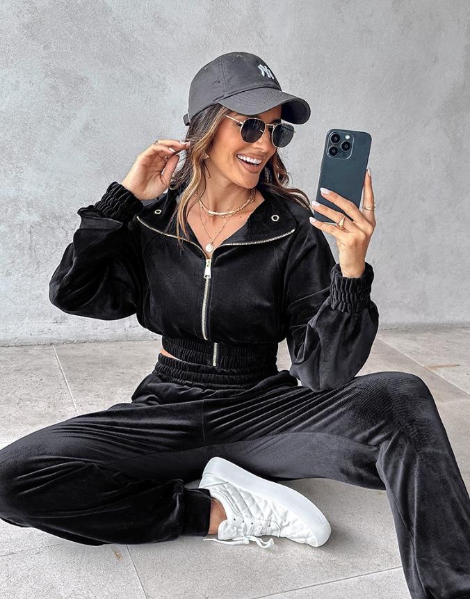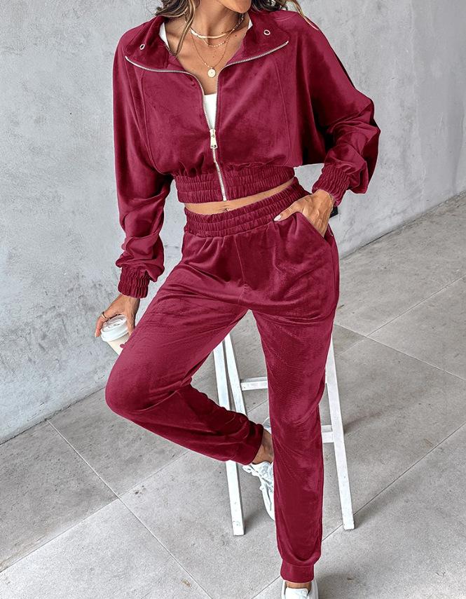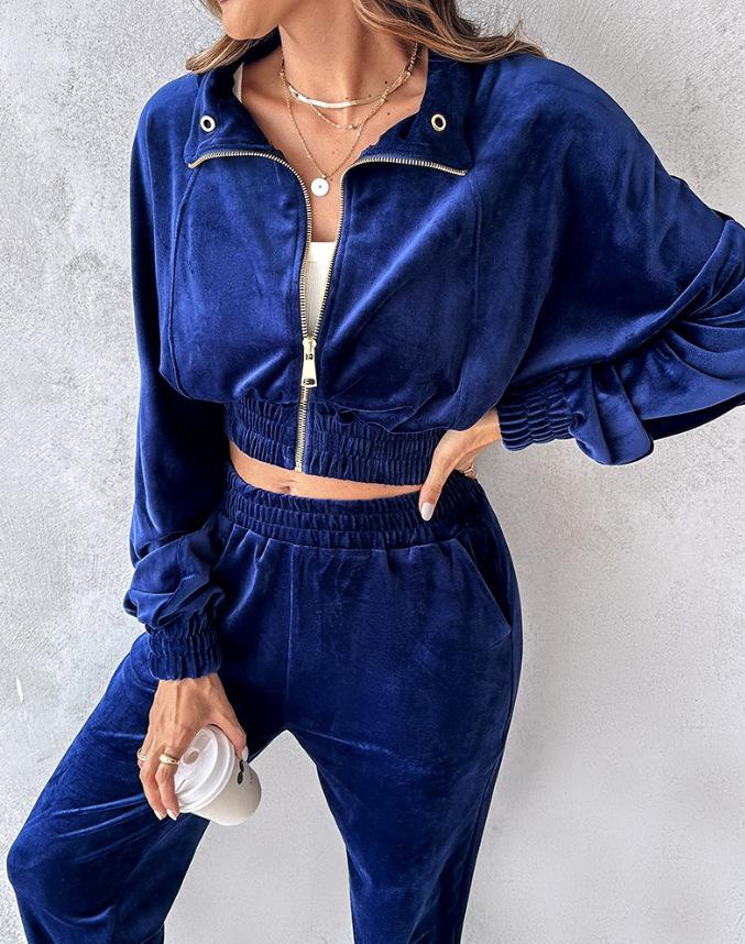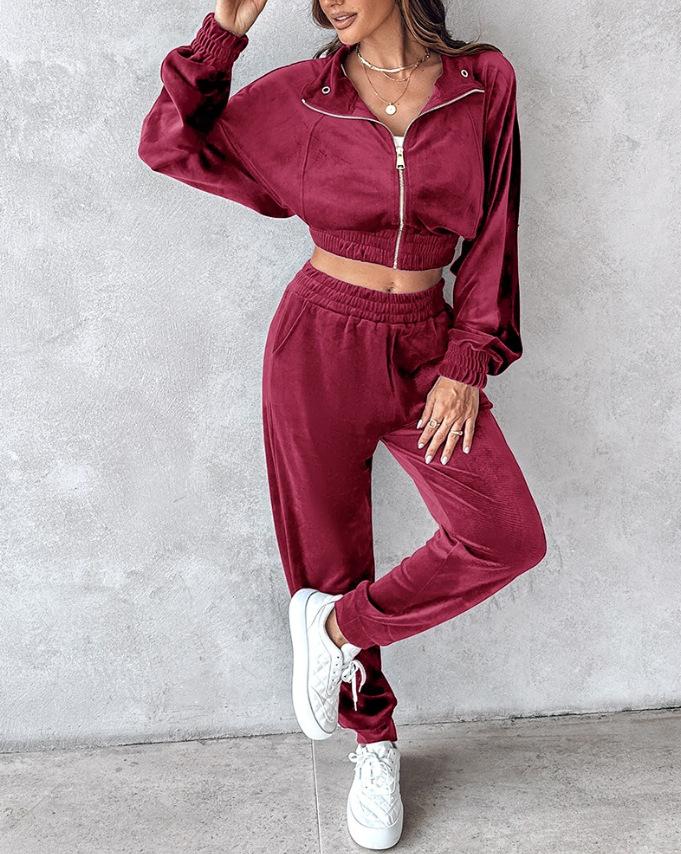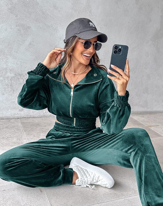 2024 Amazon Estación Independiente Otoño/Invierno Nuevo Traje de Dos Piezas Chaqueta con Cremallera de Terciopelo Dorado Otoño Pantalones