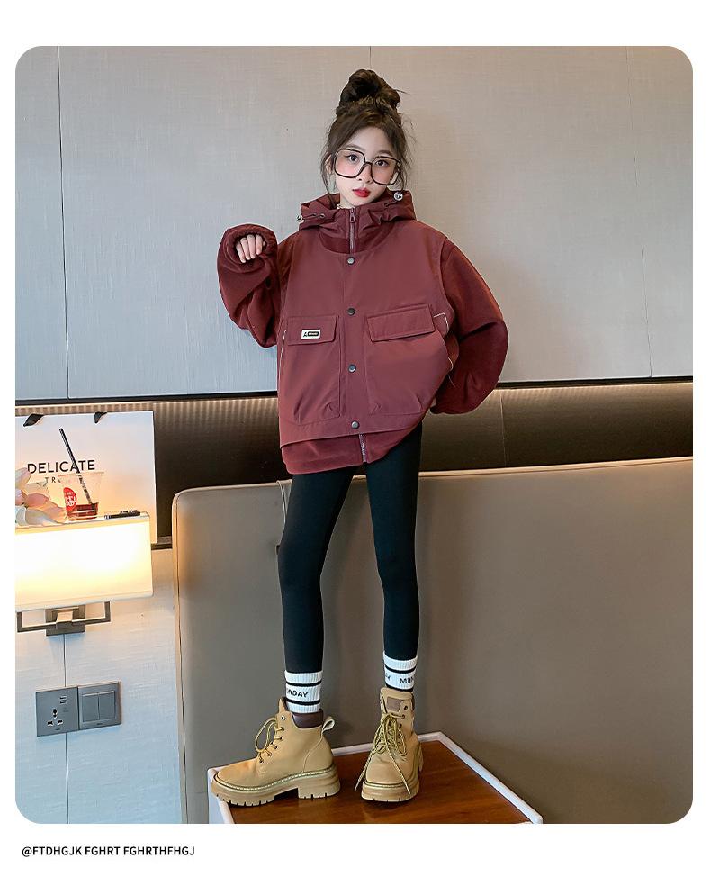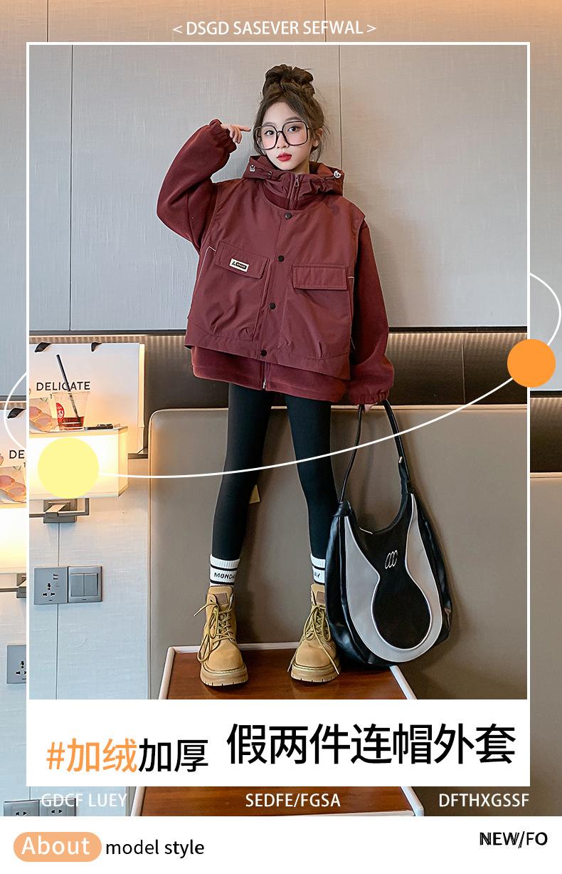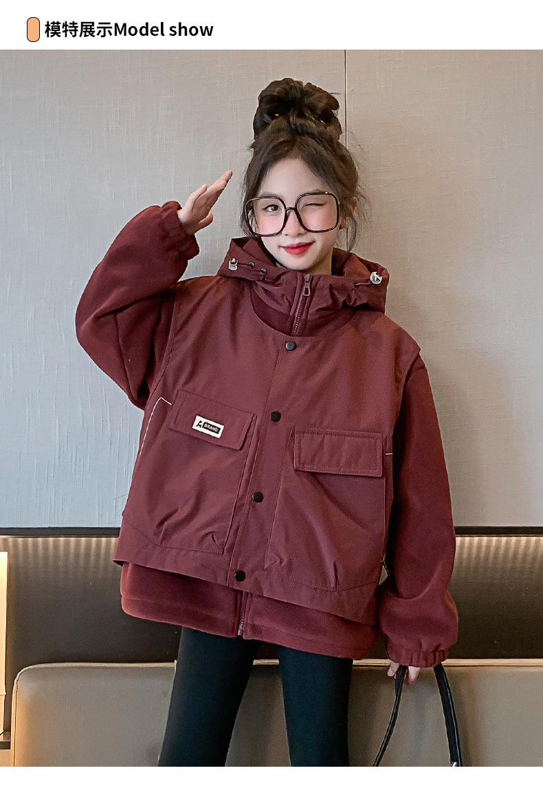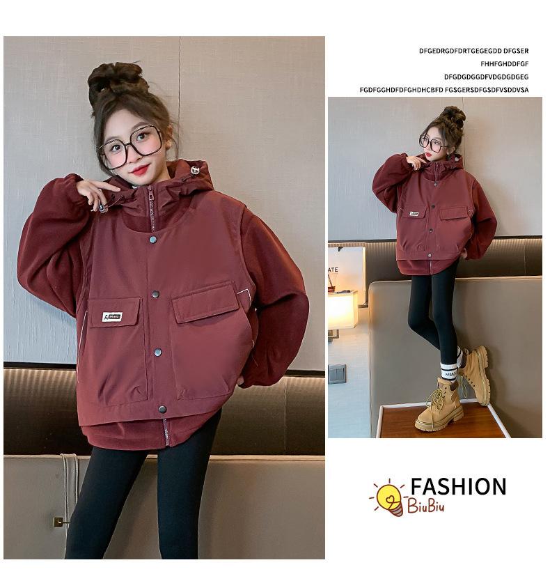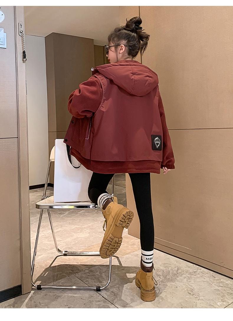 Abrigo de niña con forro polar, ropa de otoño e invierno 2023, nuevo estilo occidental, chaqueta falsa de dos piezas para niños medianos y grandes, chaqueta gruesa informal