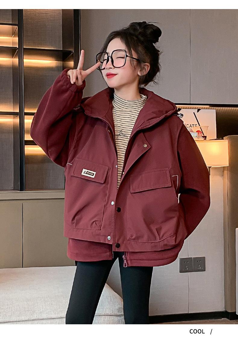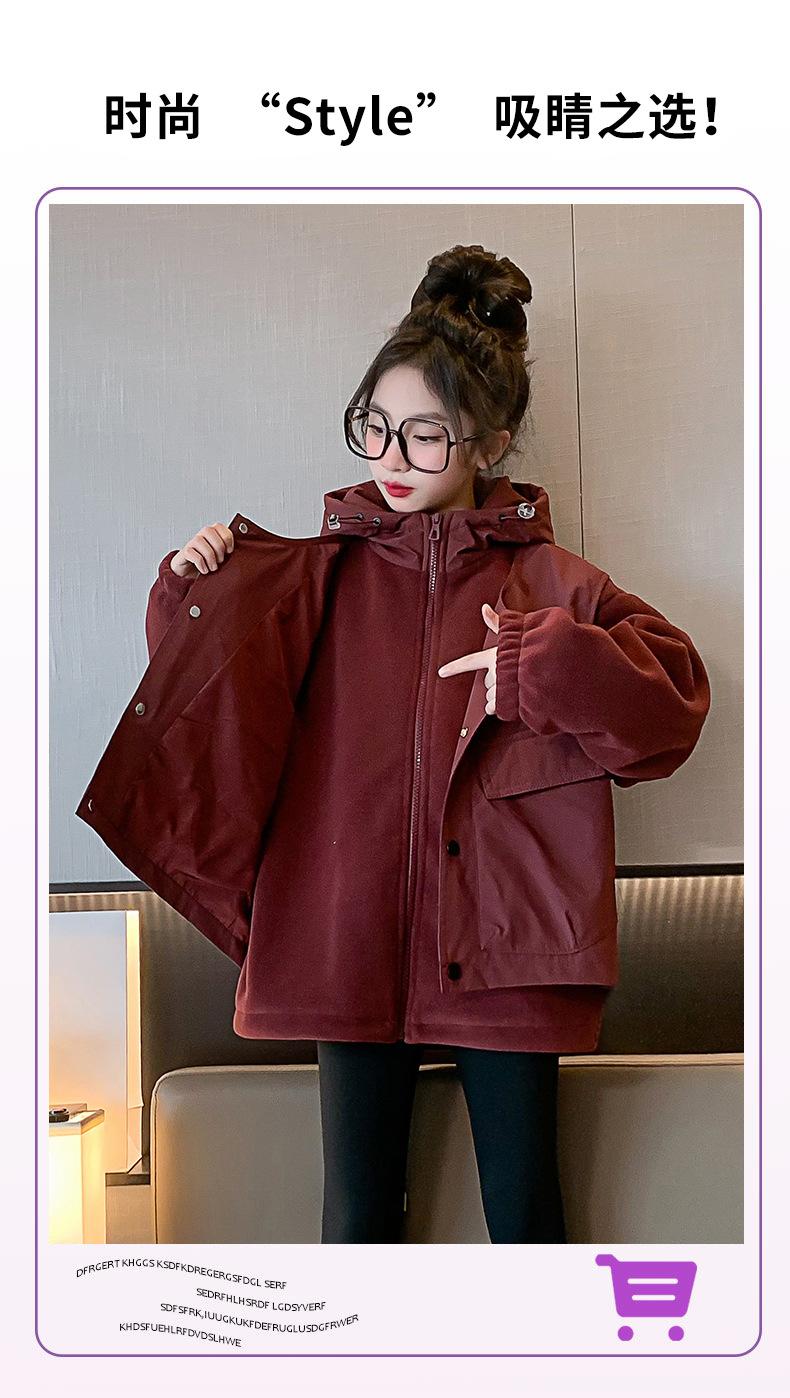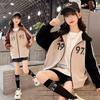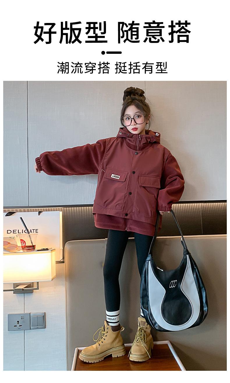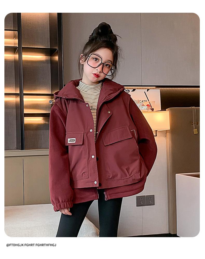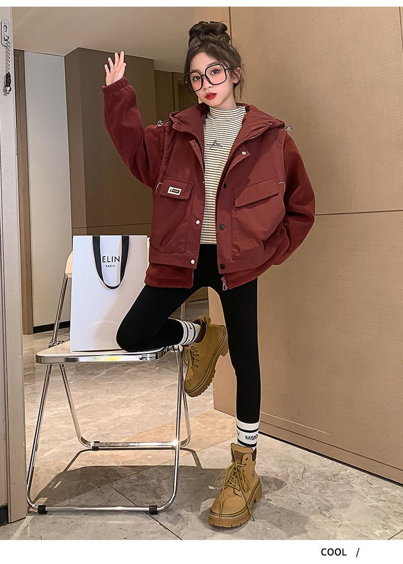 Abrigo de niña con forro polar, ropa de otoño e invierno 2023, nuevo estilo occidental, chaqueta falsa de dos piezas para niños medianos y grandes, chaqueta gruesa informal