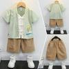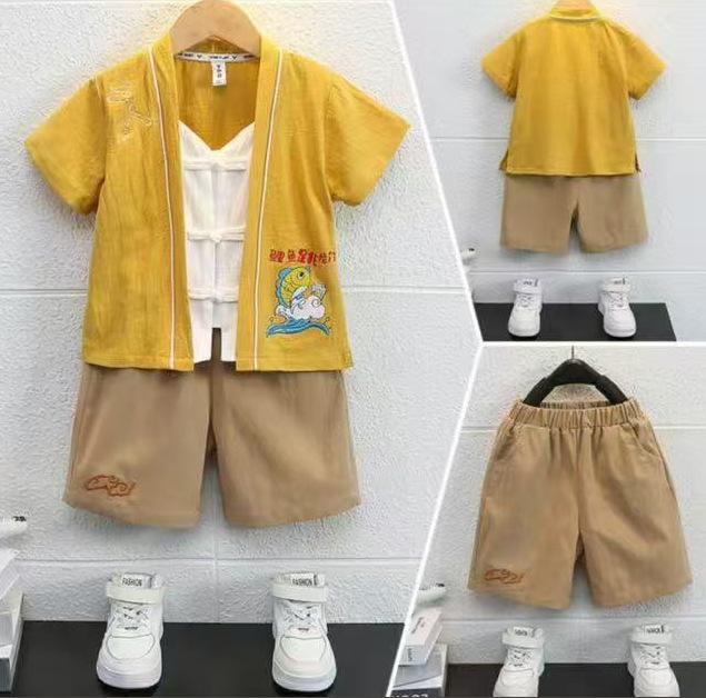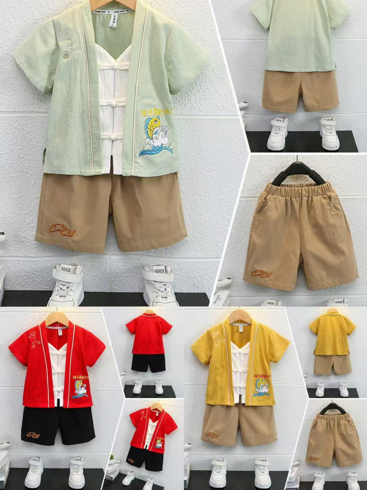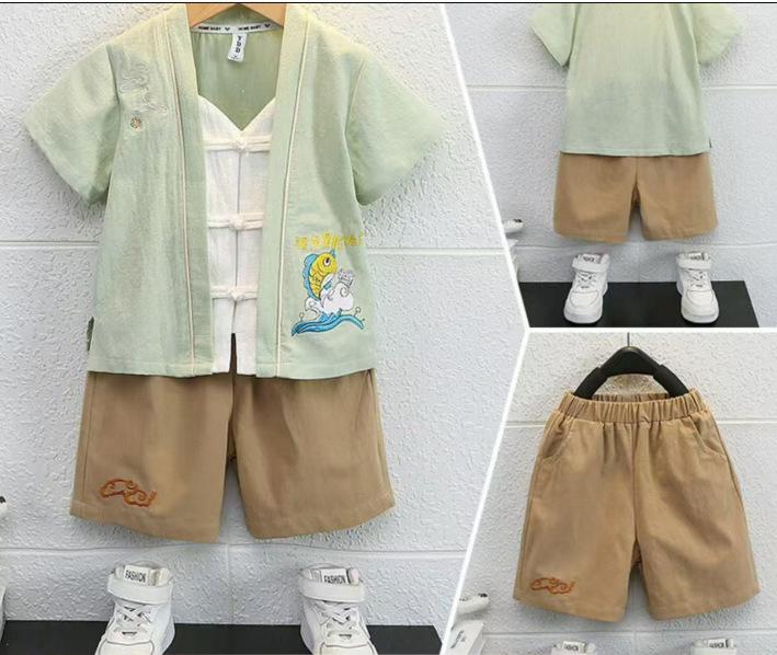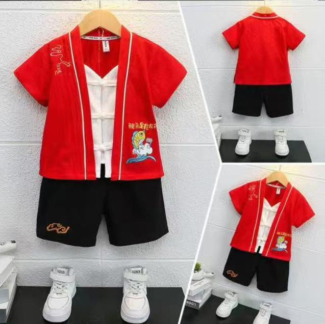 Traje de manga corta de moda 2024, nuevo y atractivo traje nacional para niños, nuevo abrigo Tang vintage chino con pez koi de dos piezas