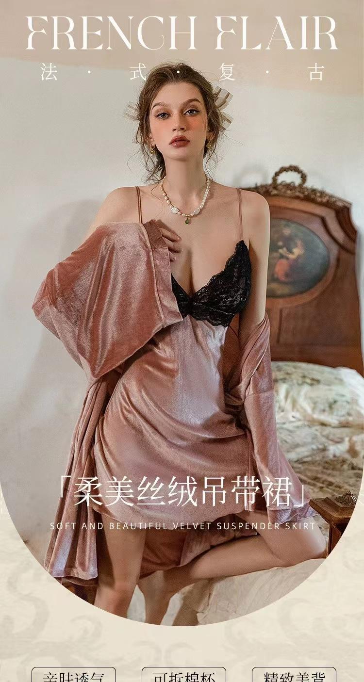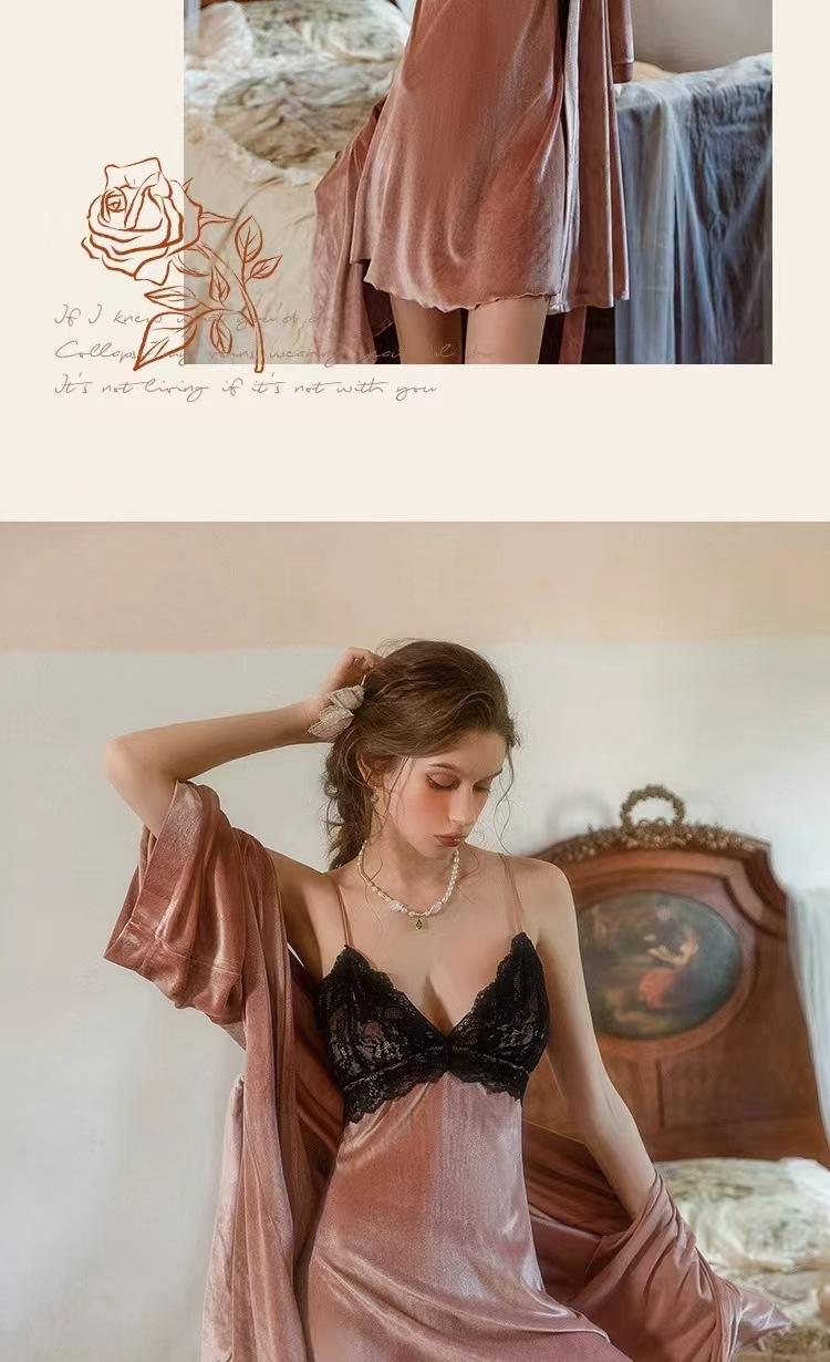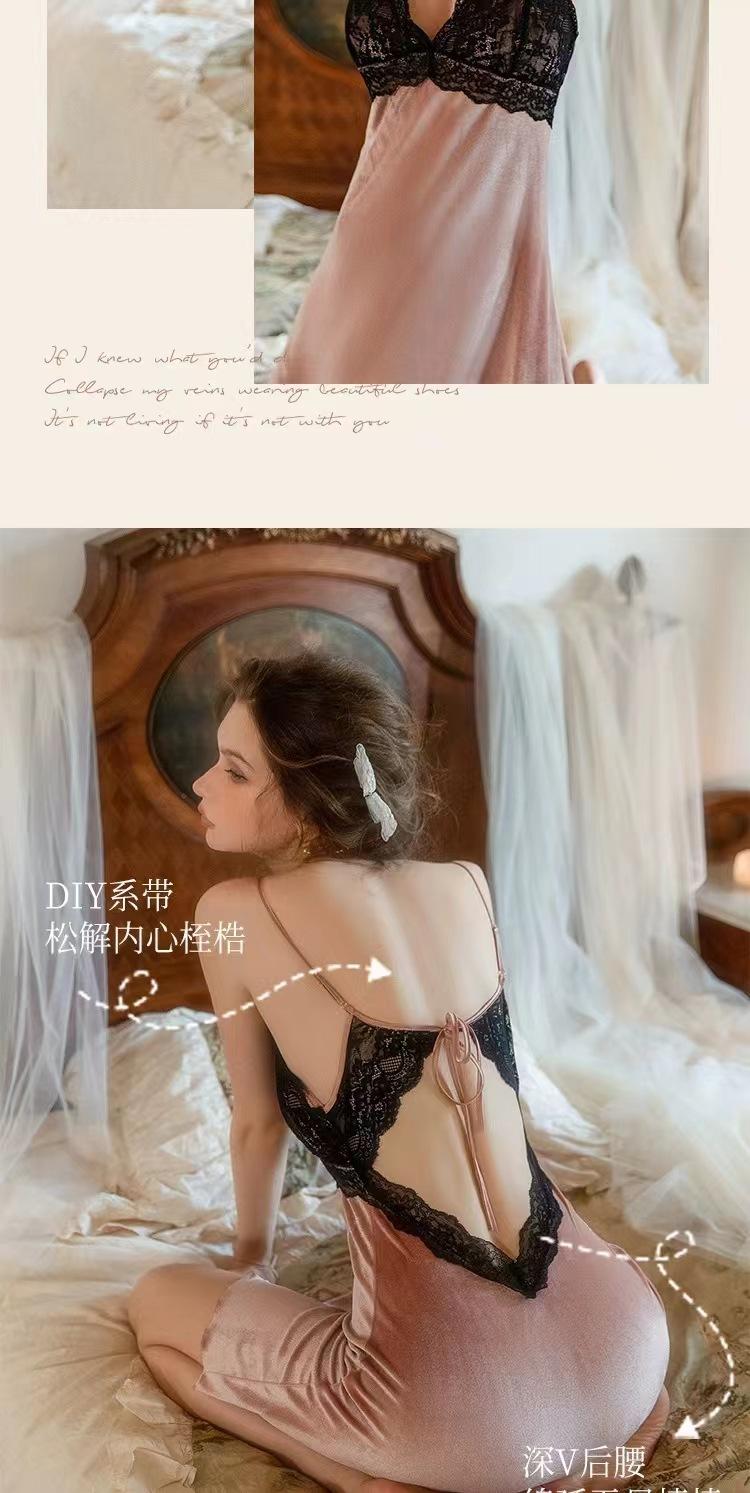 Pijama Sexy de Terciopelo Escote en V Profundo Terciopelo Camisón de Mujer Costuras de Encaje Tirantes Almohadilla en el Pecho Deseo Puro de Niñas Ropa para el Hogar 3037