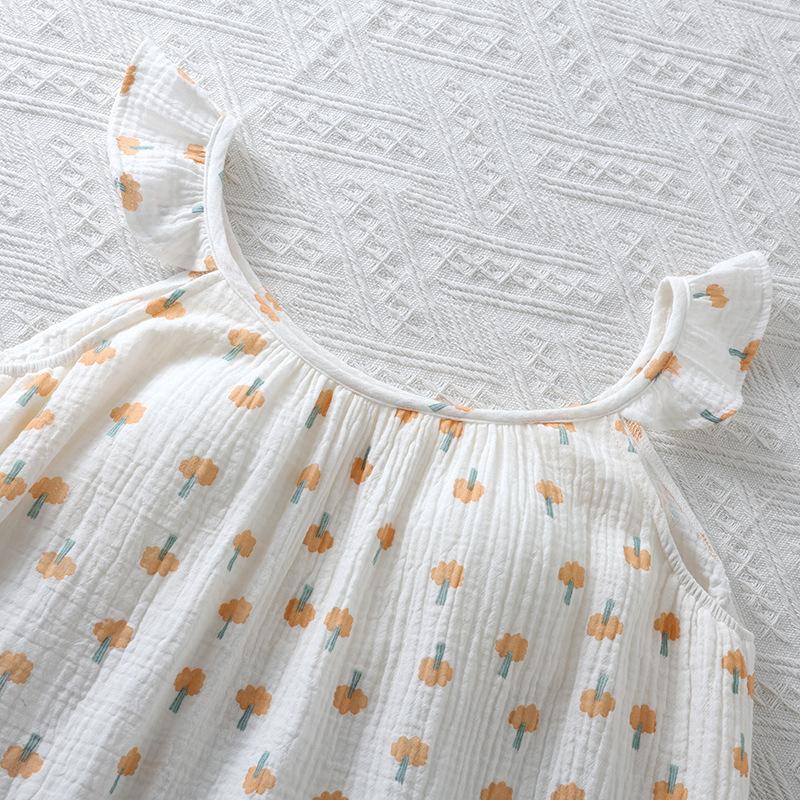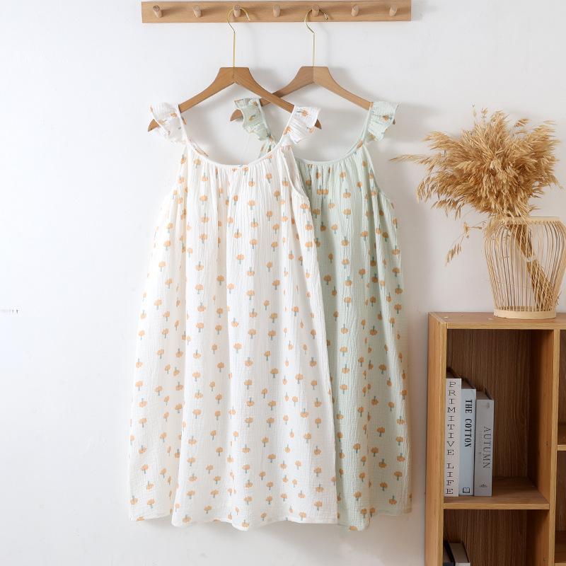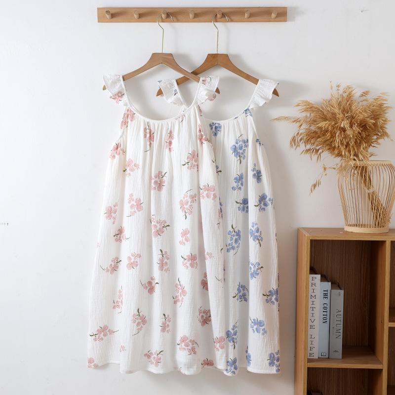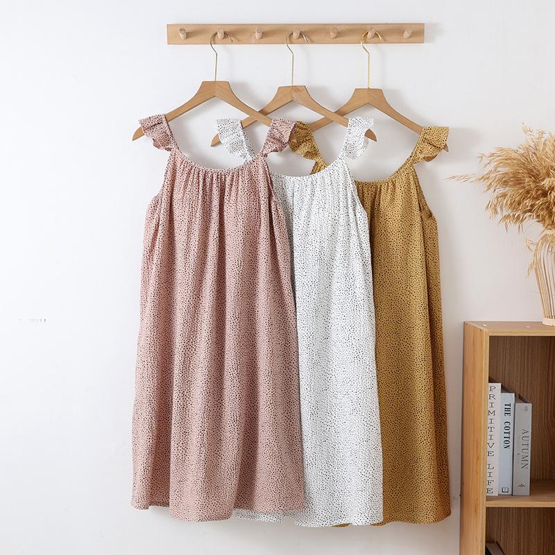 Camisón de Gasa de Doble Capa de Algodón Puro con Tirantes y Manga Volante para Mujer Verano Fino Sin Mangas con Almohadilla en el Pecho Se Puede Usar Afuera Falda Midi Pijama