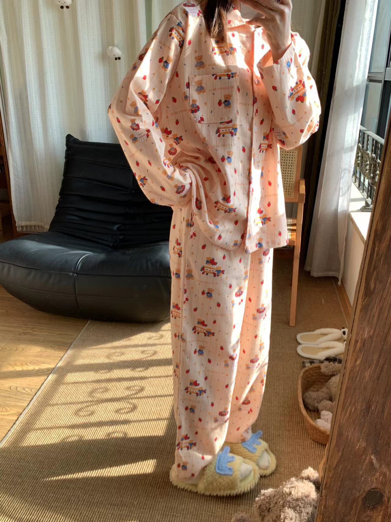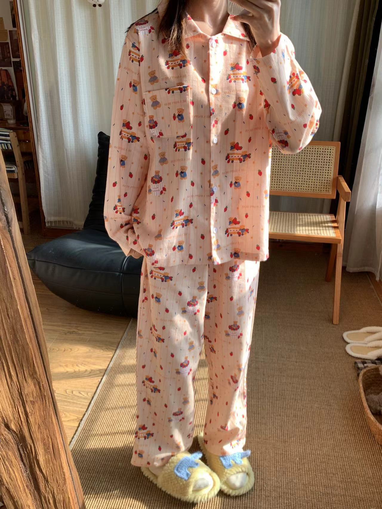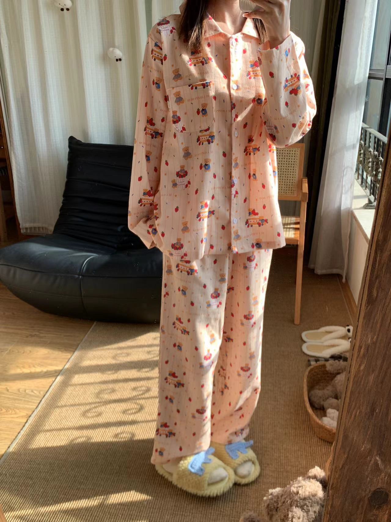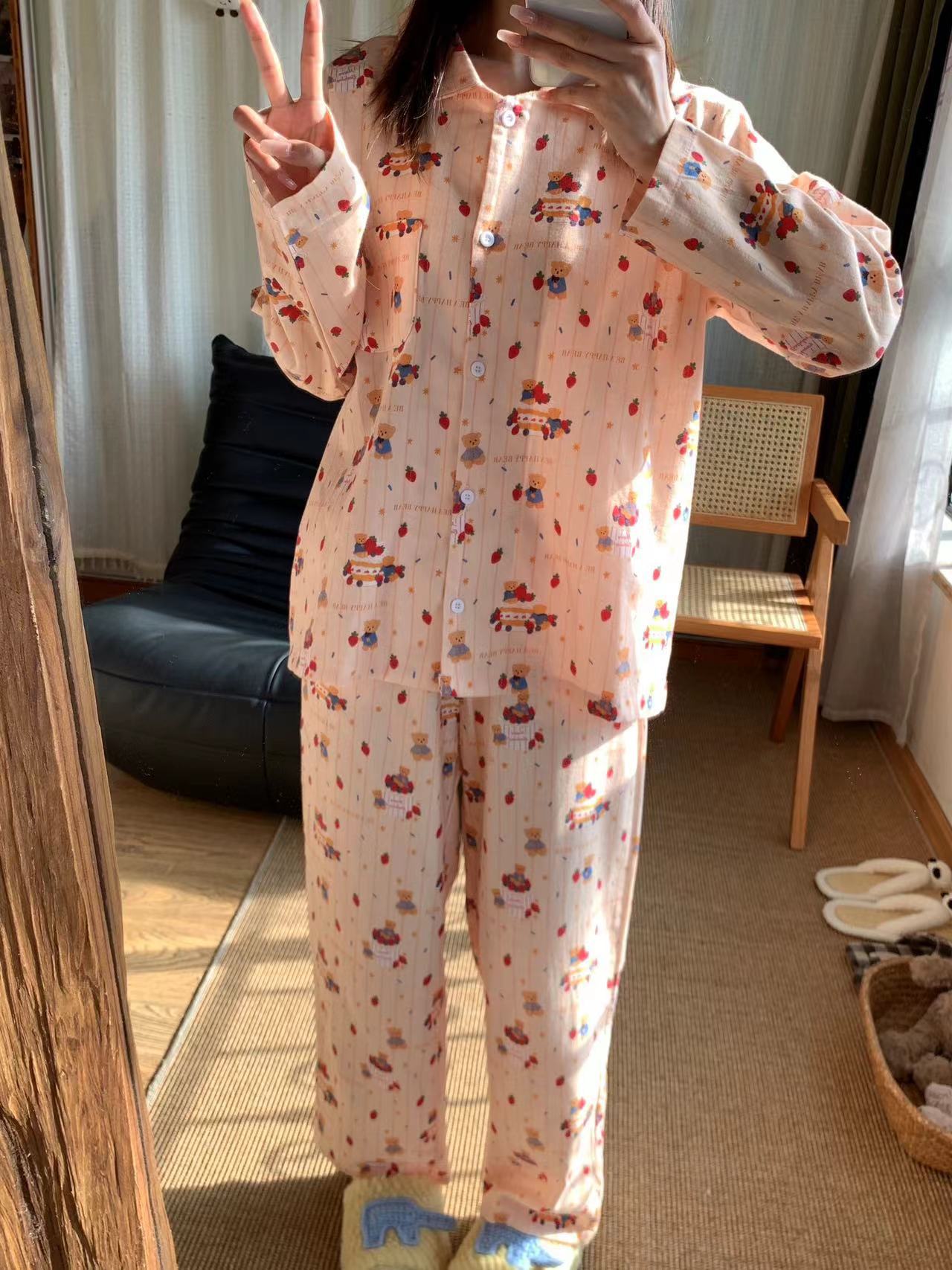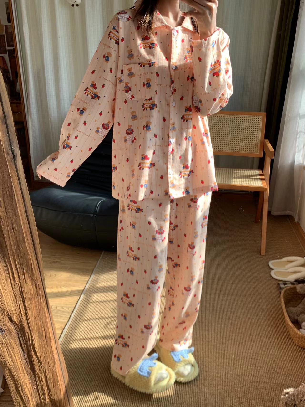 Strawberry dessert bear-brushed lapel long sleeve pants M