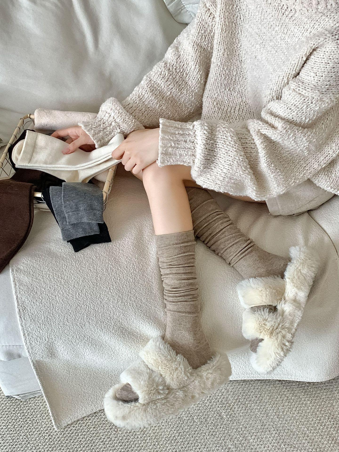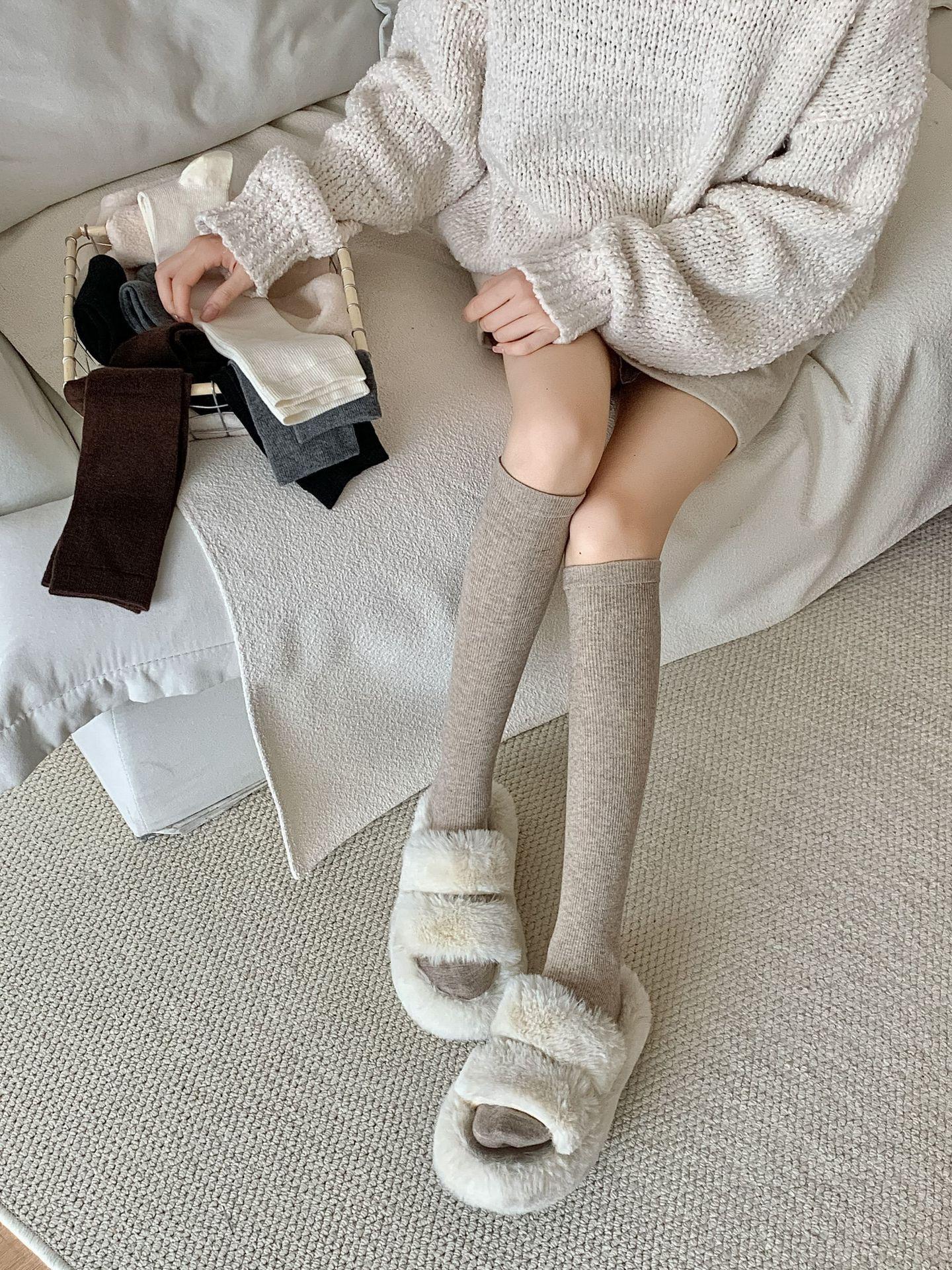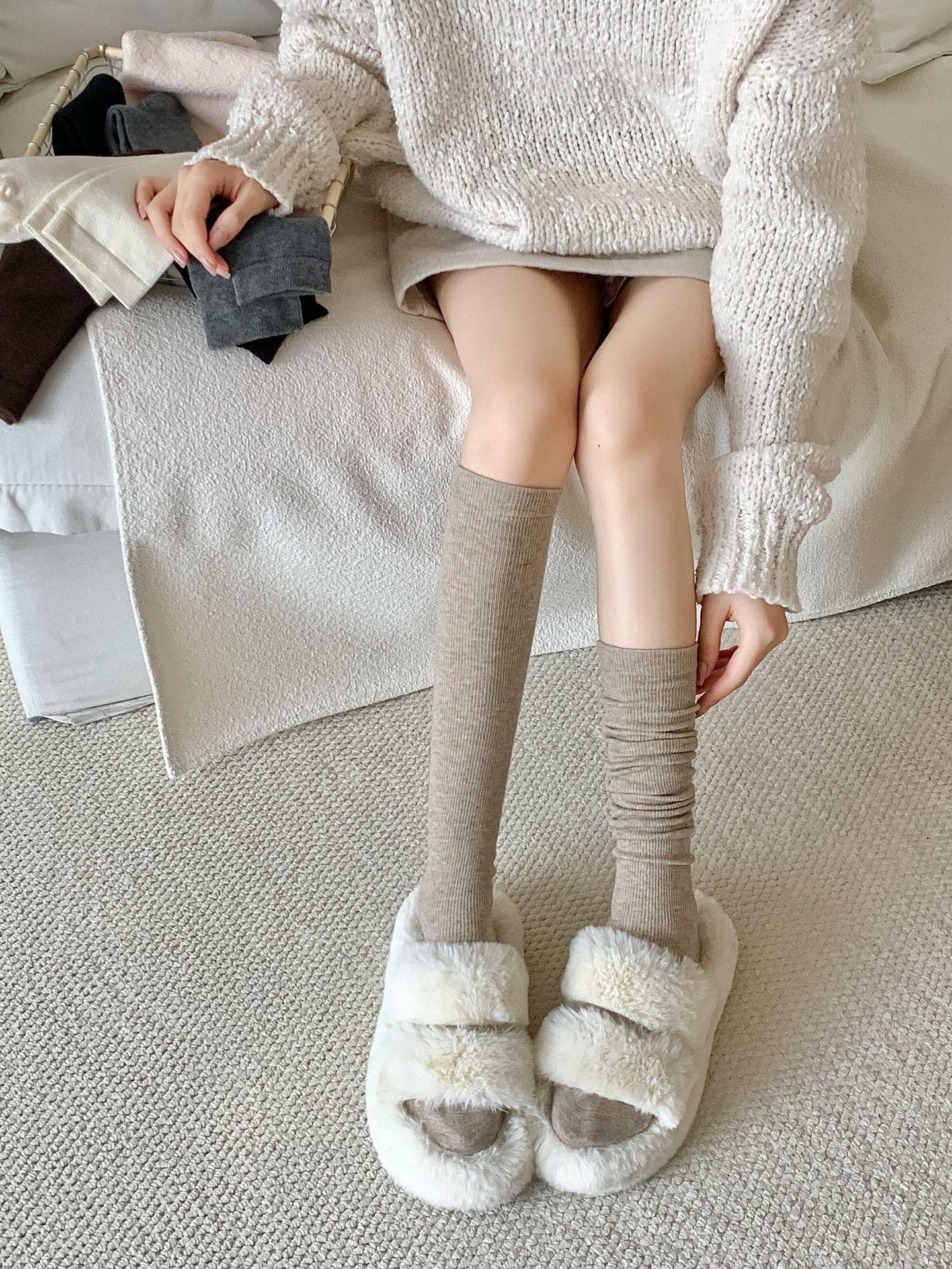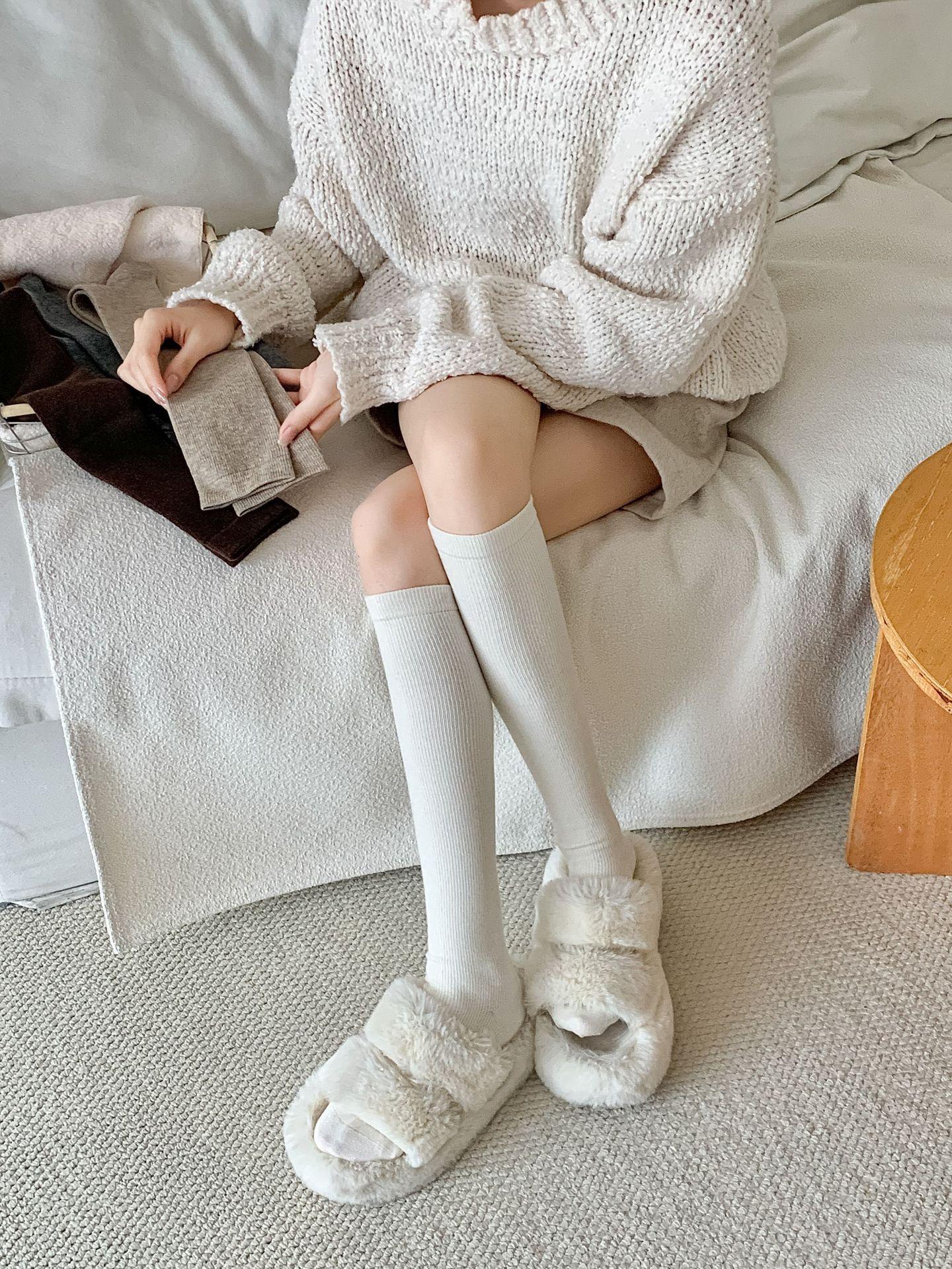Calcetines Bajos de Lana Presión Clásico Color Sólido Combinable Casual Otoño e Invierno Gruesos Cálidos Largos Estilo Universitario Hasta la Rodilla Calcetines de Mujer