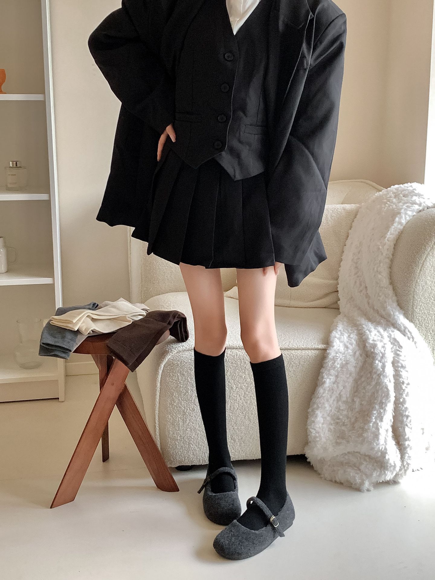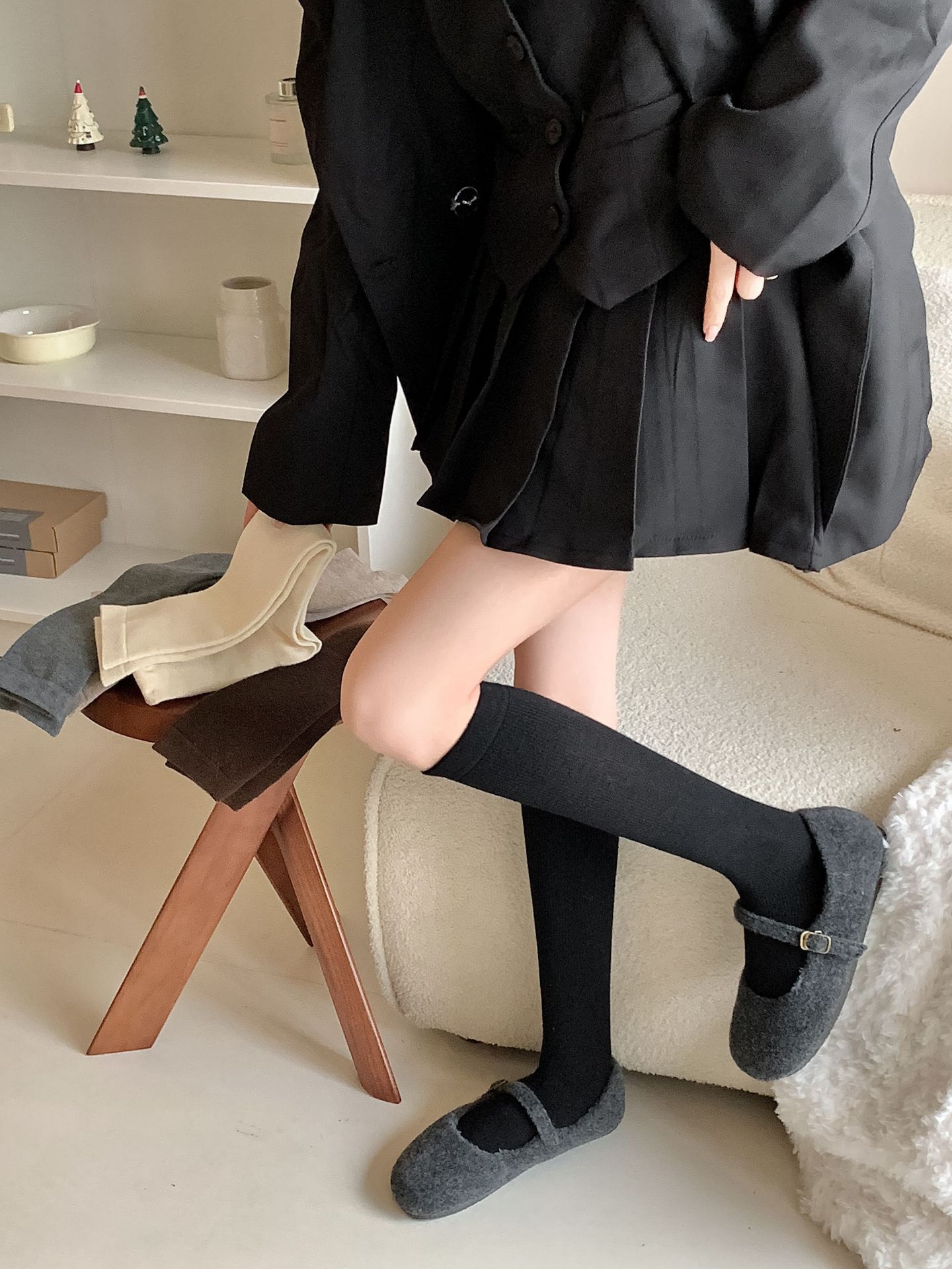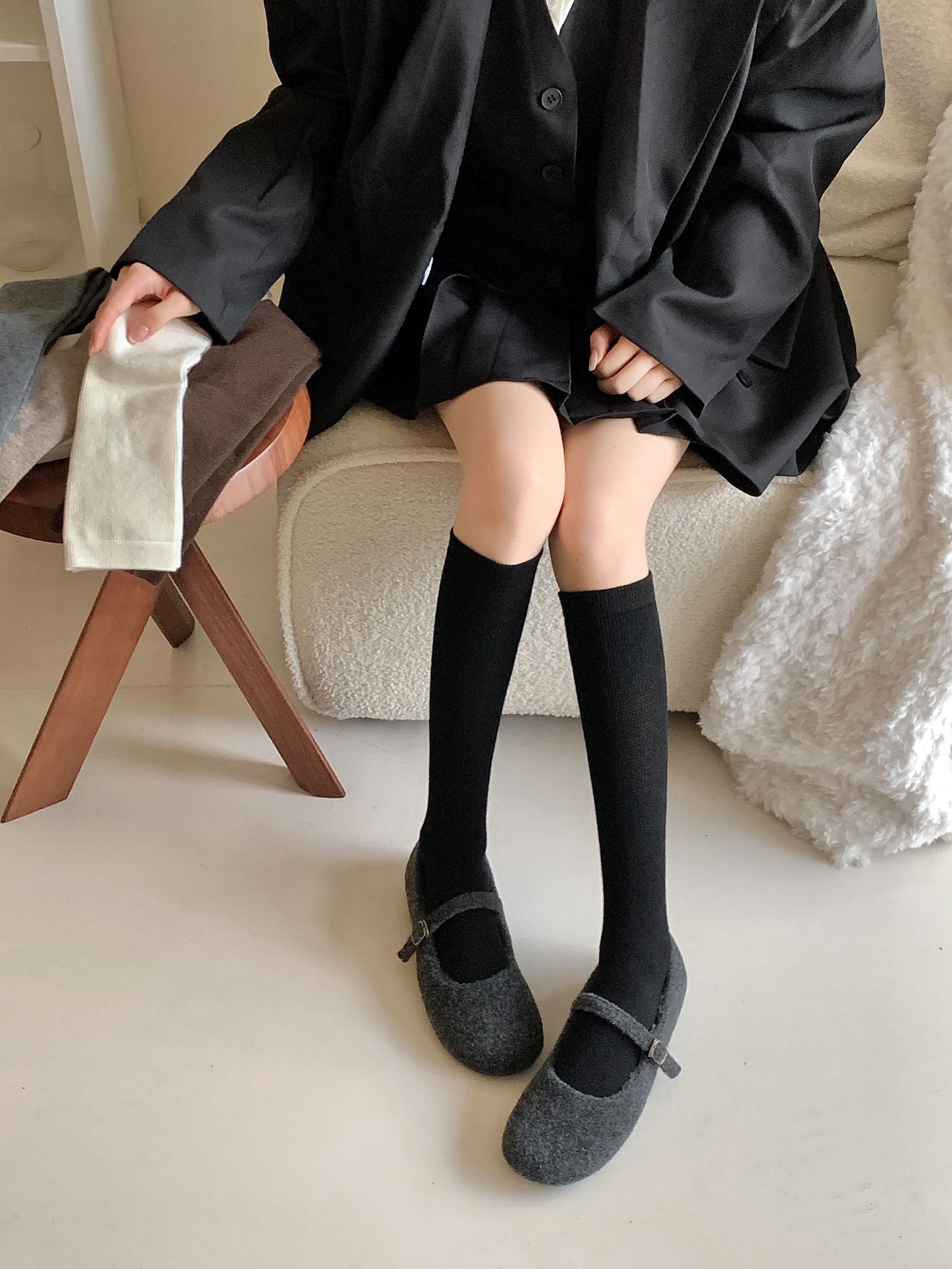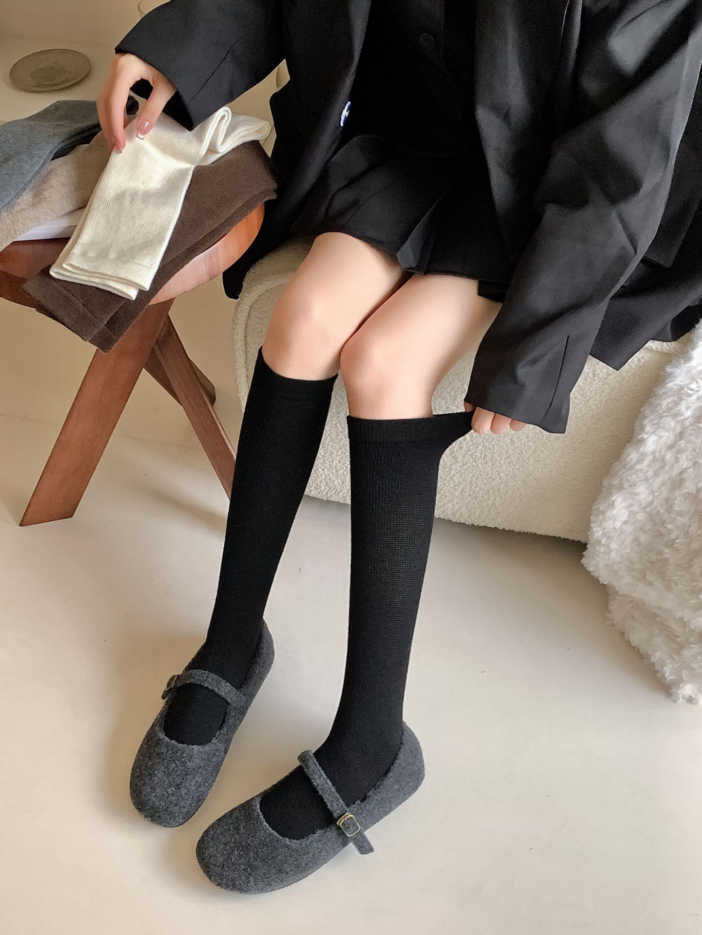 Calcetines Bajos de Lana Presión Clásico Color Sólido Combinable Casual Otoño e Invierno Gruesos Cálidos Largos Estilo Universitario Hasta la Rodilla Calcetines de Mujer