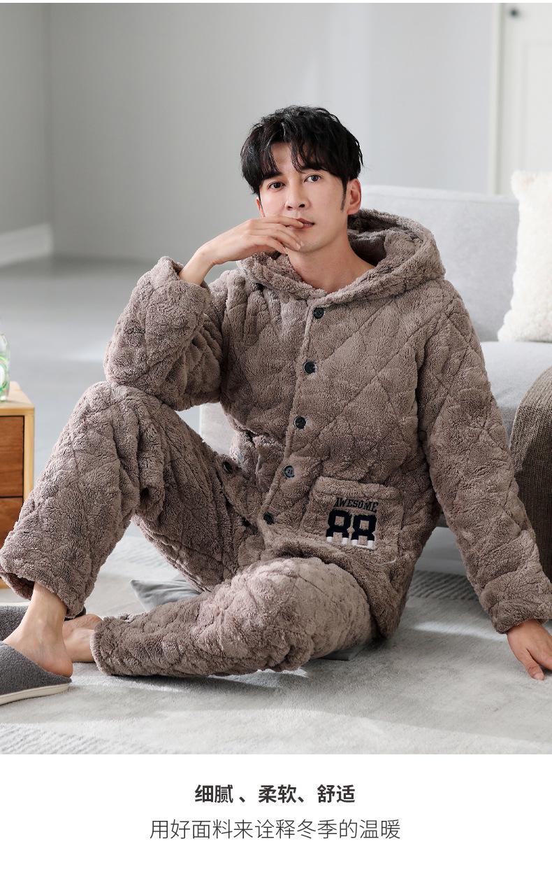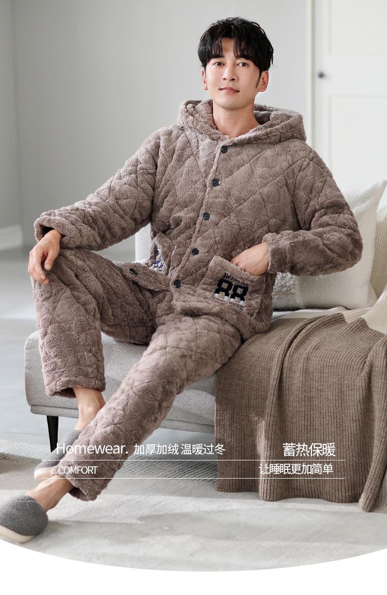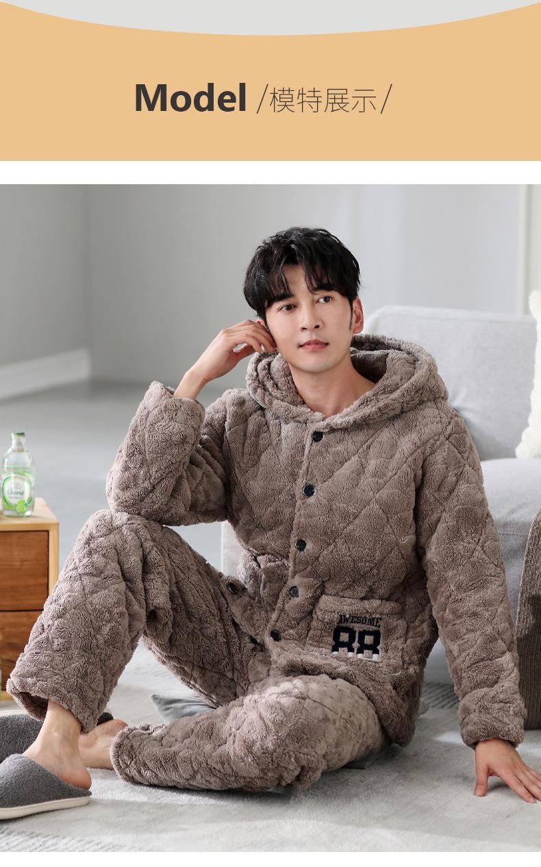 Pijamas de invierno nuevos en stock directos para hombre, ropa de casa de algodón con capucha gruesa cálida y cómoda que se puede usar al aire libre