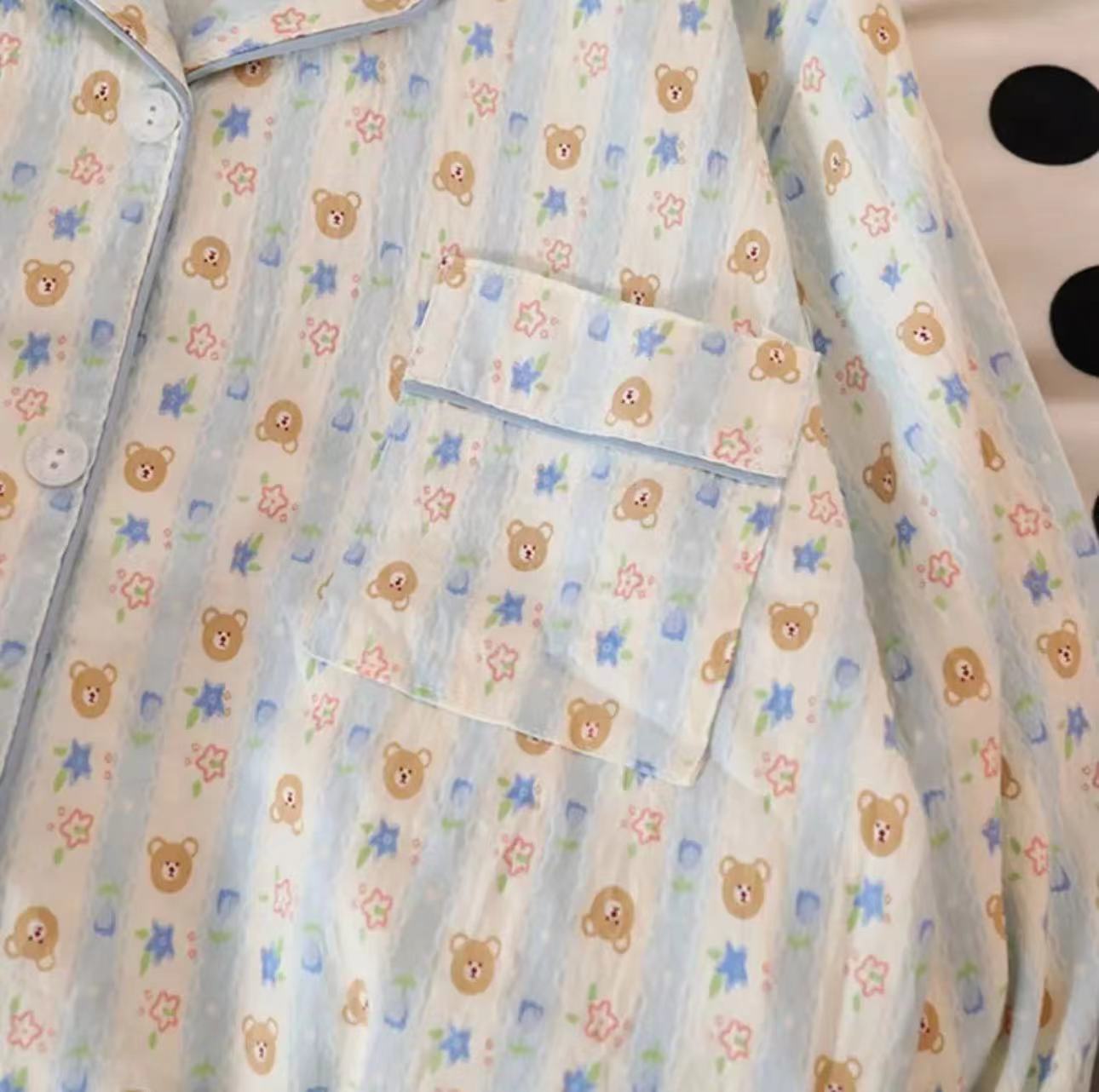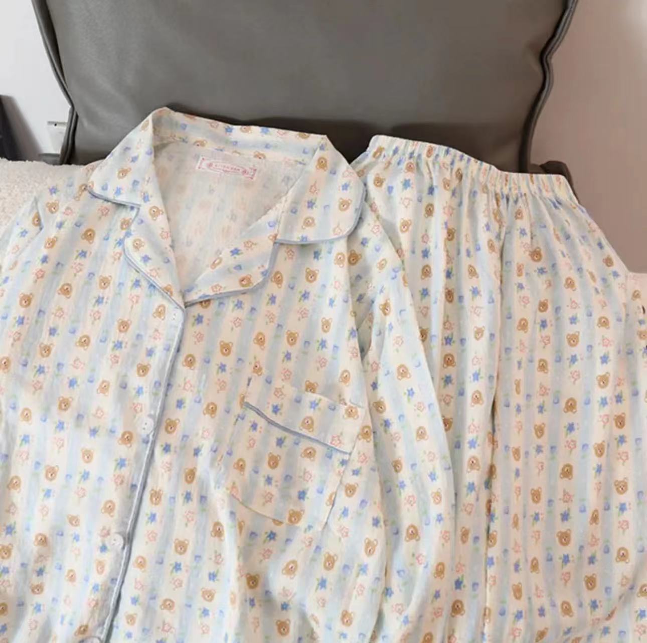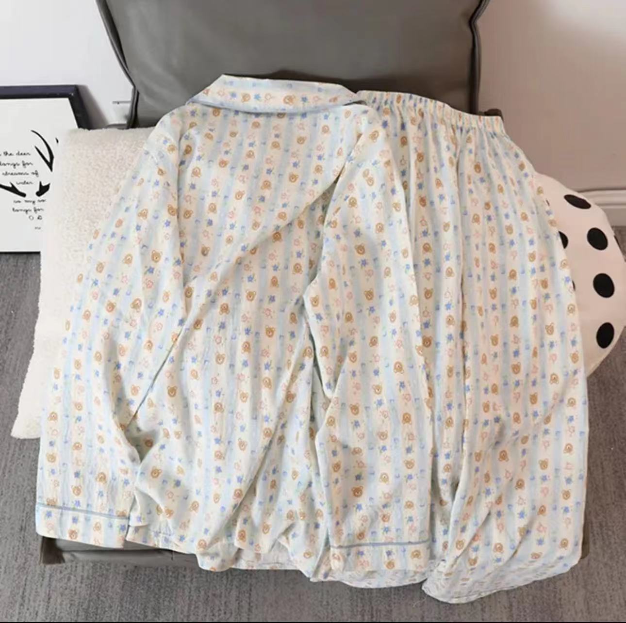 Pijama de algodón de nube para mujer, primavera y otoño, nuevo traje de dos piezas de manga larga, estilo coreano, talla grande, ropa de casa con oso azul de dibujos animados.