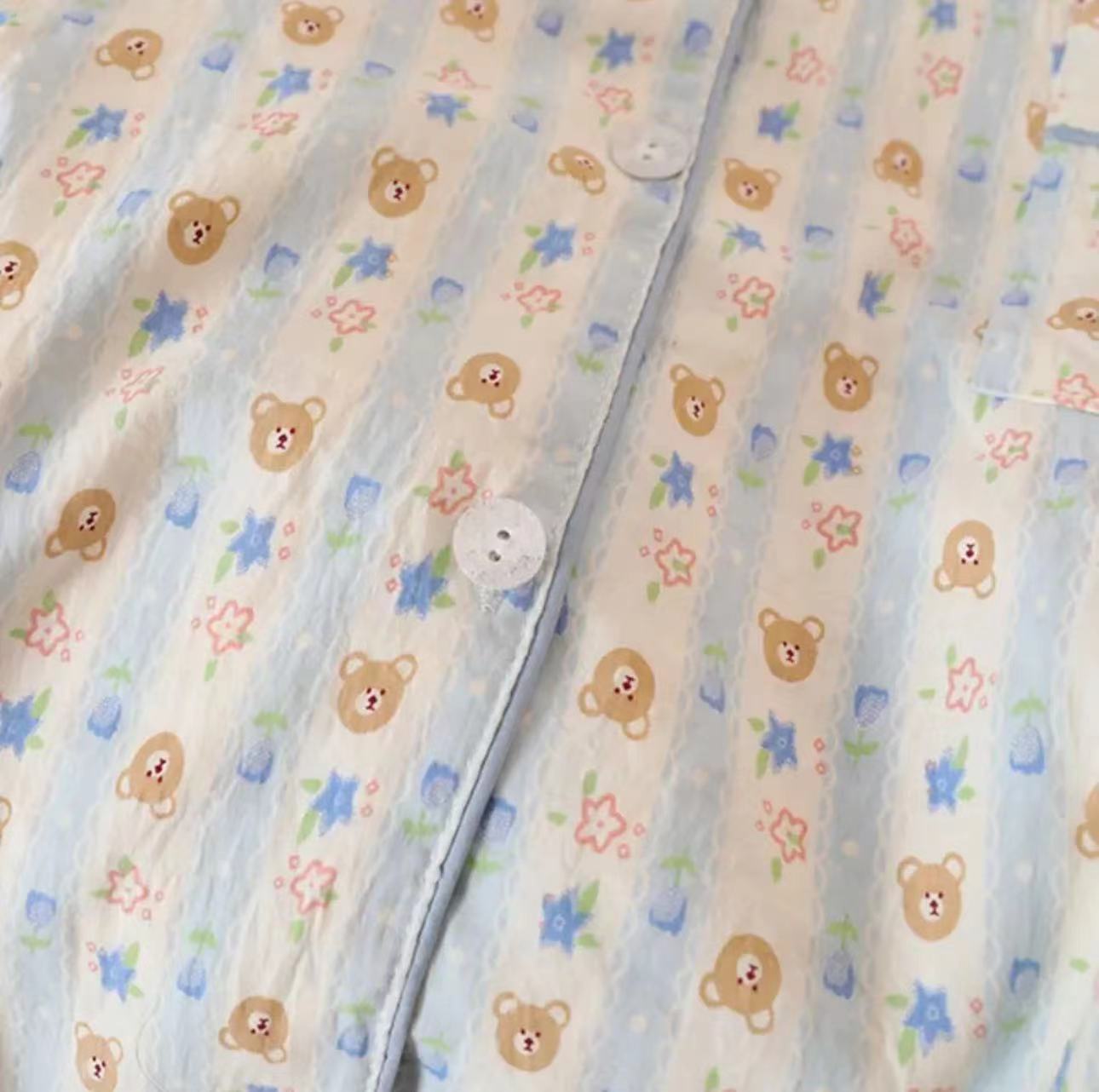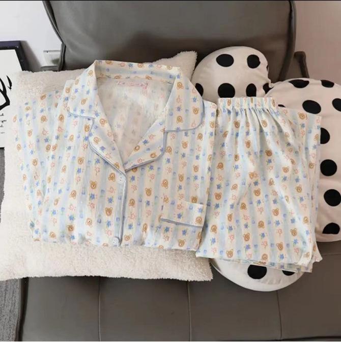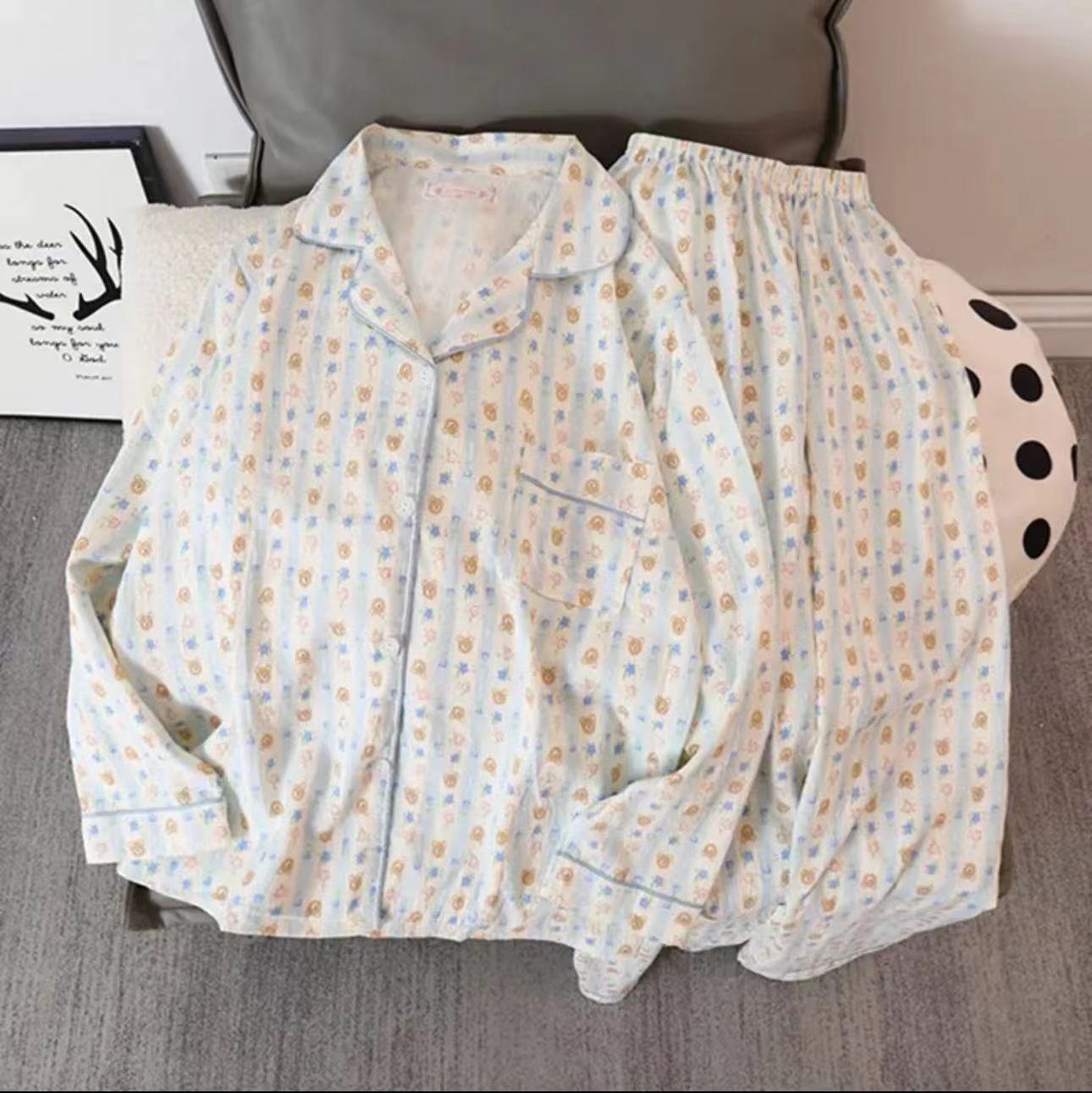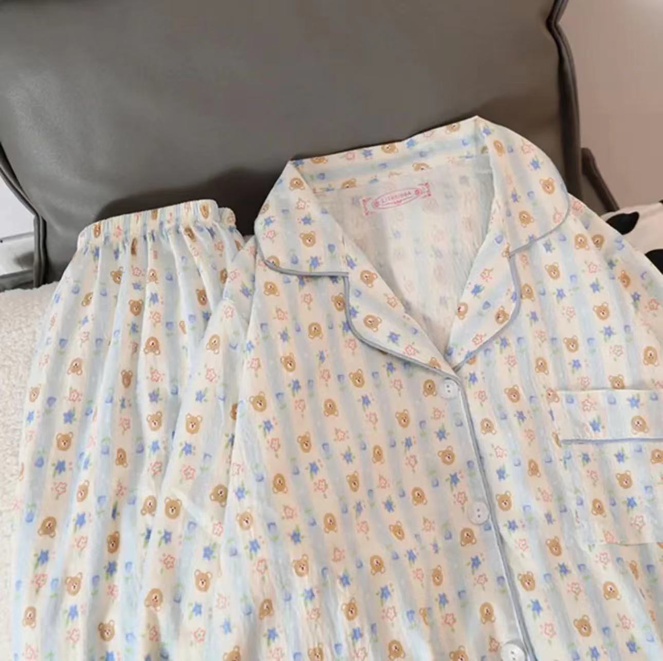 Pijama de algodón de nube para mujer, primavera y otoño, nuevo traje de dos piezas de manga larga, estilo coreano, talla grande, ropa de casa con oso azul de dibujos animados.