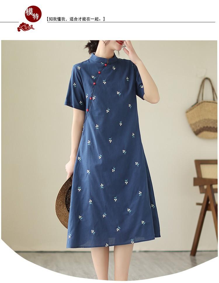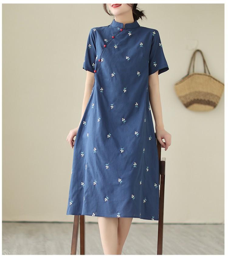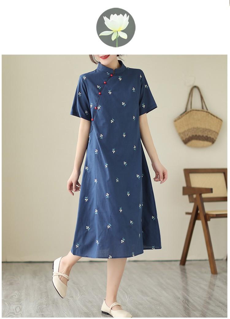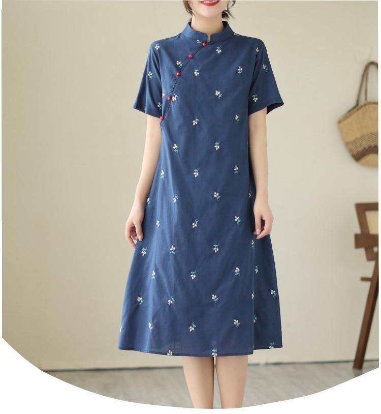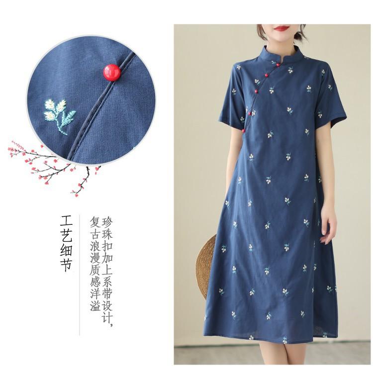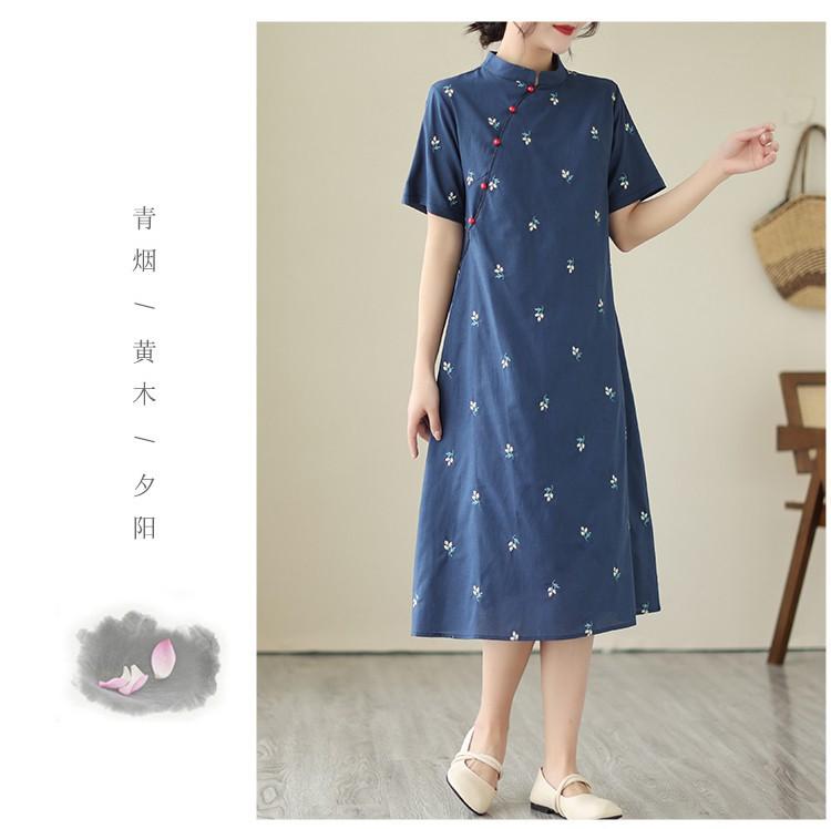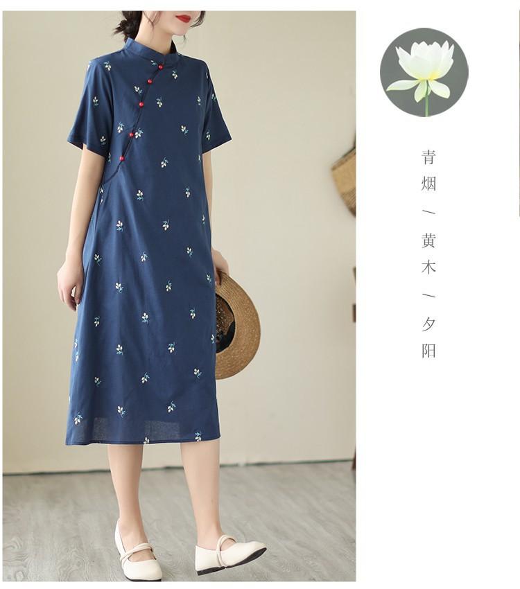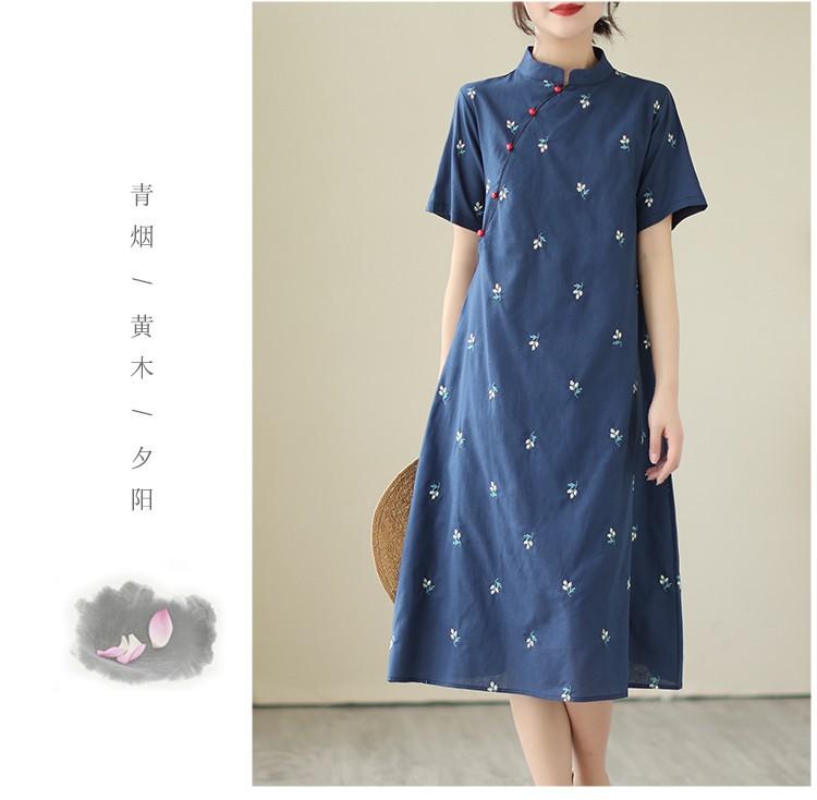 Vestido cheongsam clásico holgado de lino y algodón con cuello modificado, bordado, estilo chino, estilo retro, largo medio, 2023