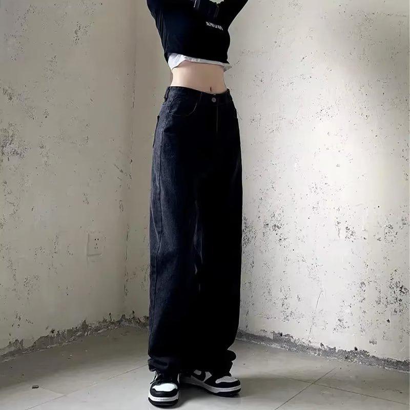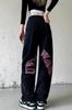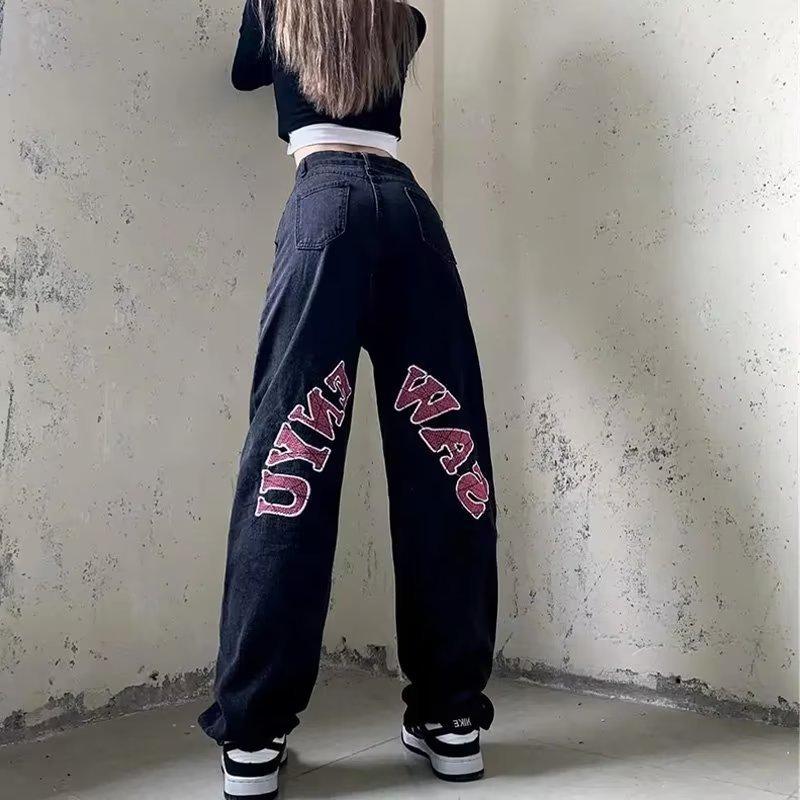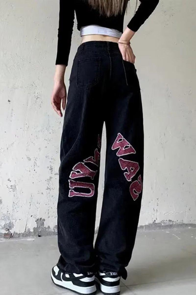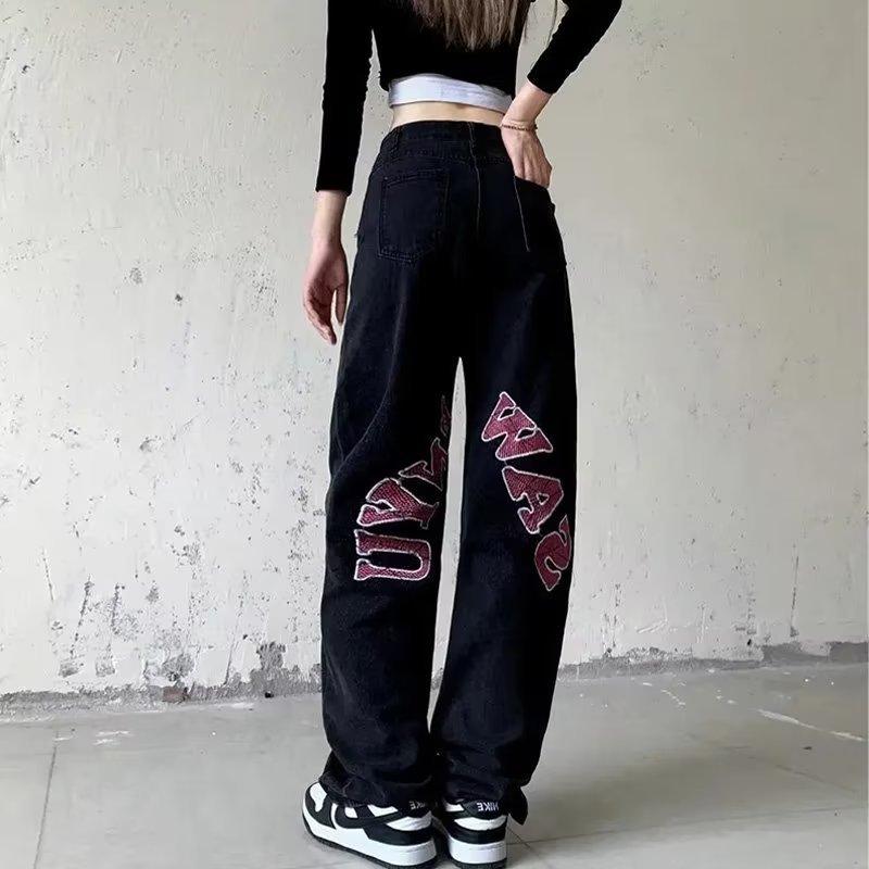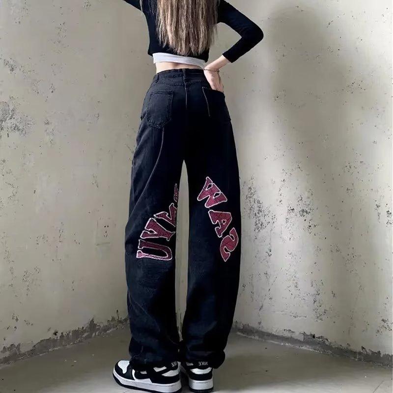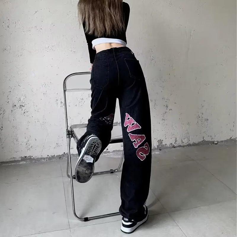 Pantalones vaqueros negros estampados de estilo europeo y americano para mujer, nuevos pantalones largos rectos de pierna ancha y cintura alta, sueltos y adelgazantes, con estilo High Street