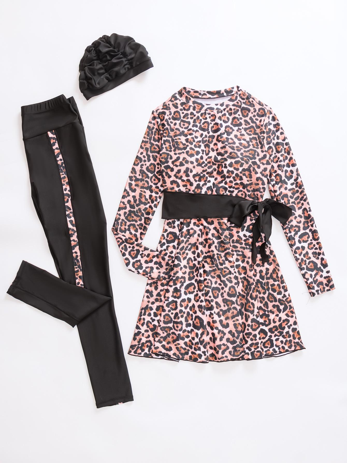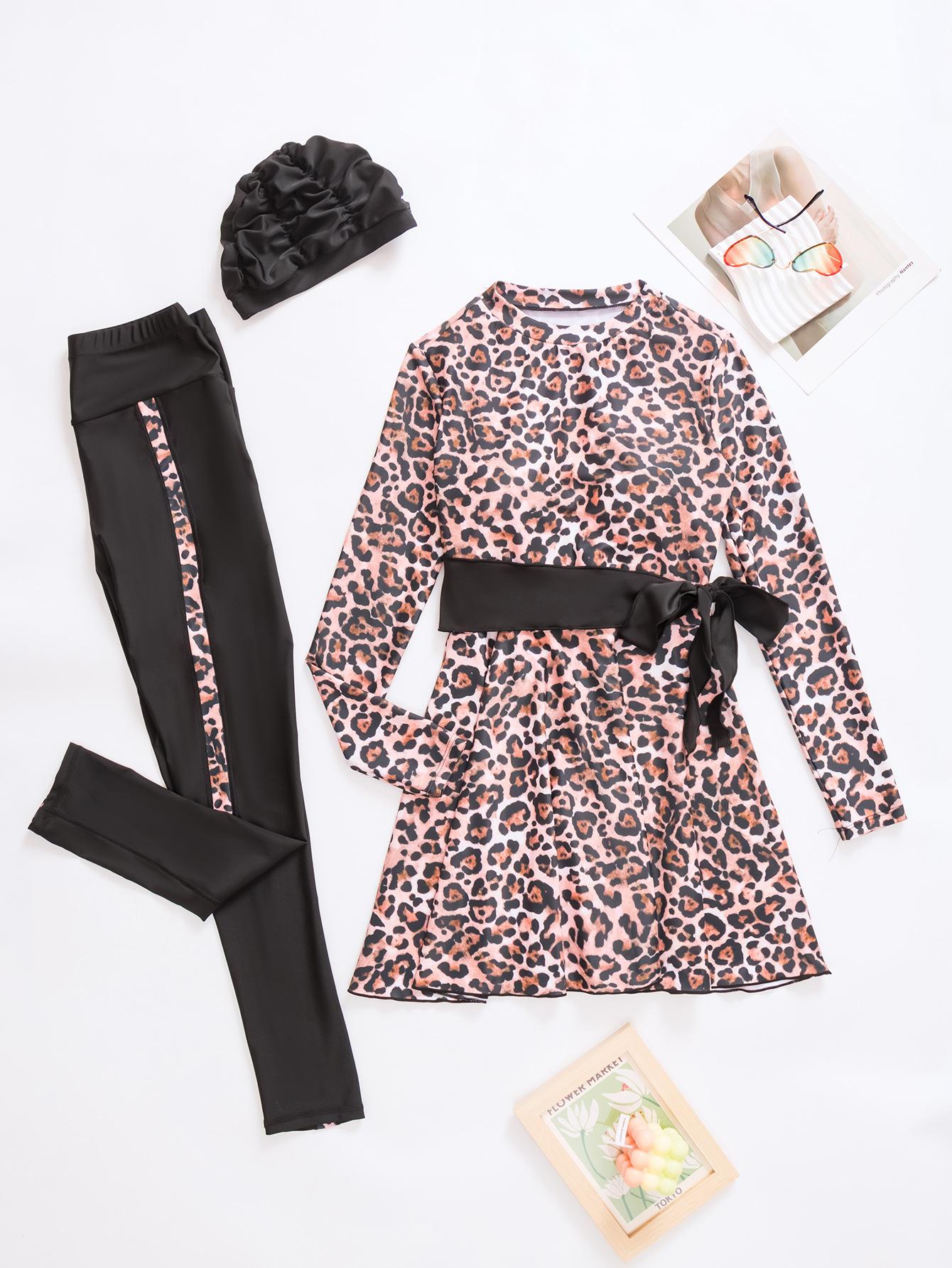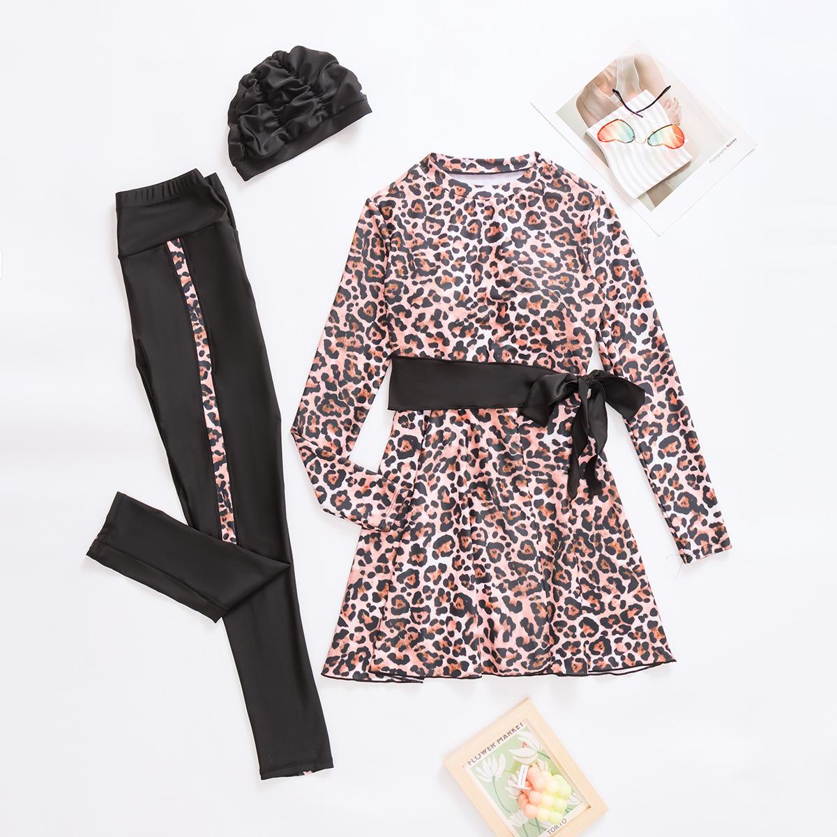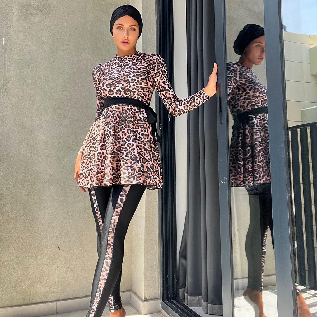 Nuevo Conservador Musulmán Estampado Leopardo Medio Oriente Manga Larga Pantalón Largo Protección Solar Ropa de Playa Traje de Baño de Tres Piezas Transfronterizo Europeo y Americano