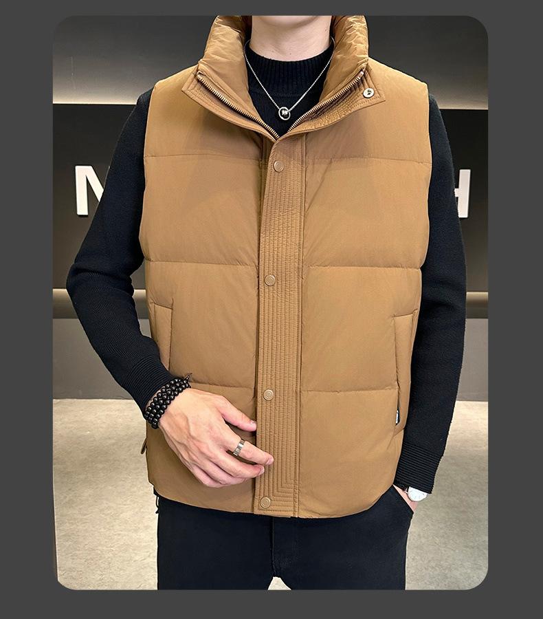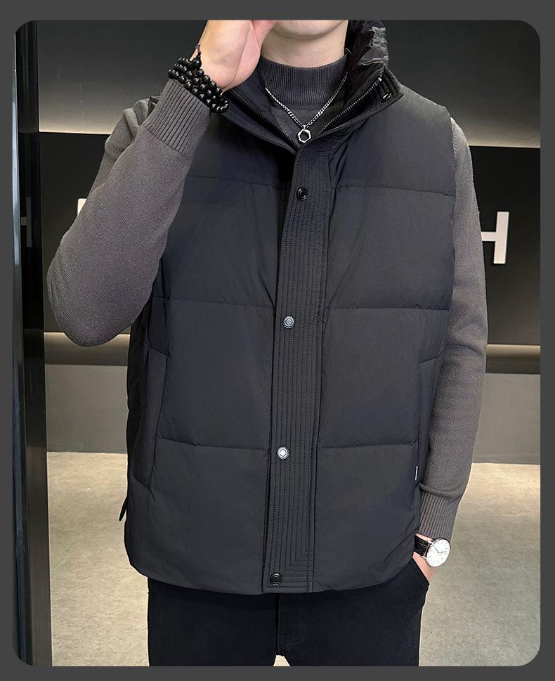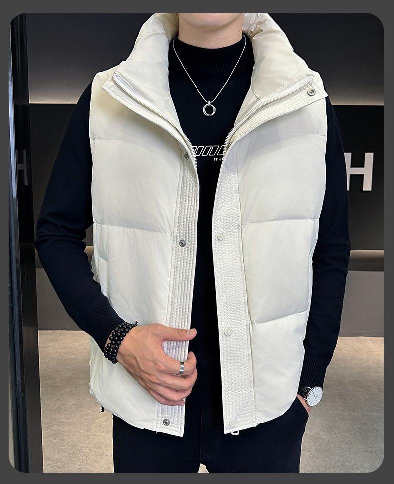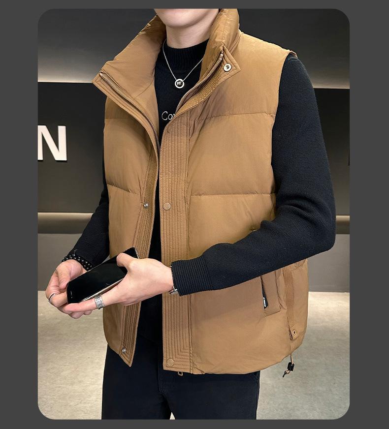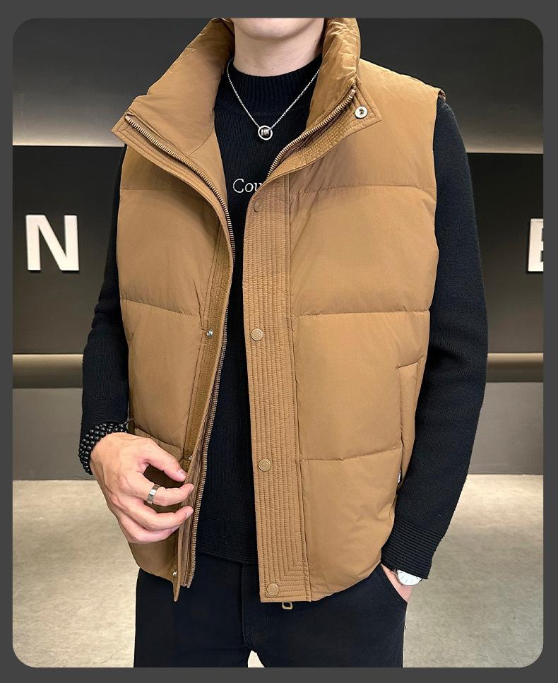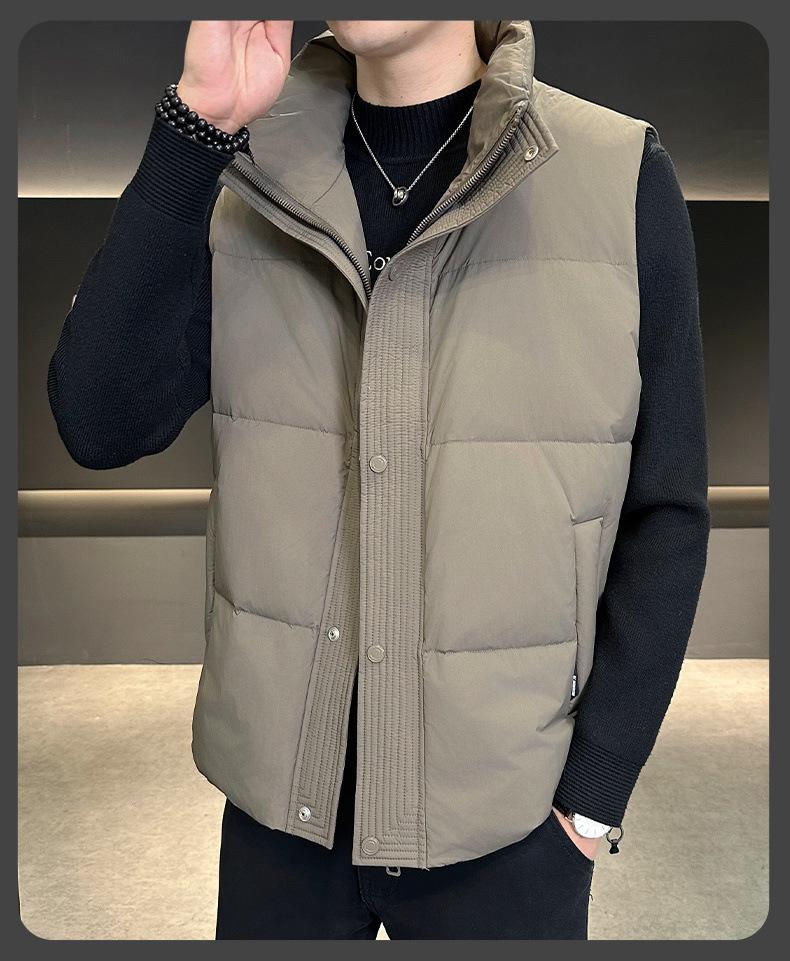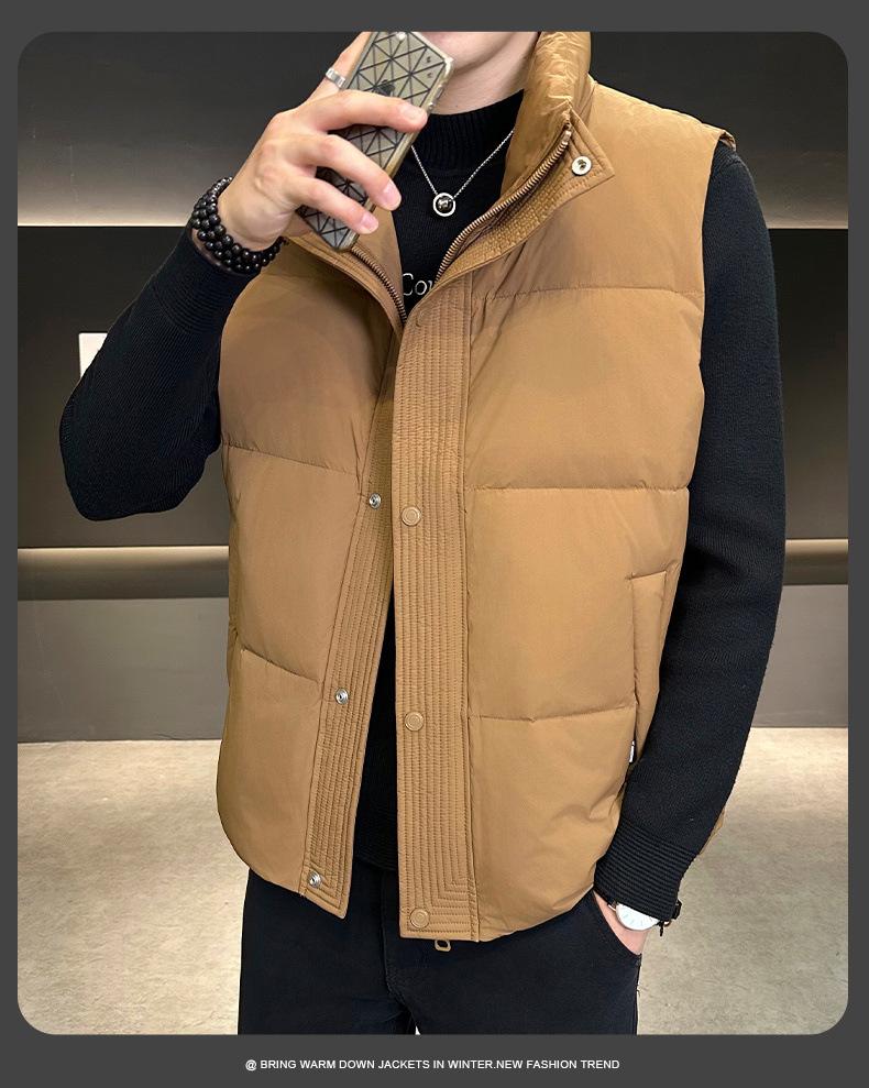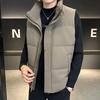 Chaleco de plumas para hombre, nuevo chaleco informal de invierno de color liso con cuello, sin mangas, grueso y cálido, abrigo de trabajo a la moda