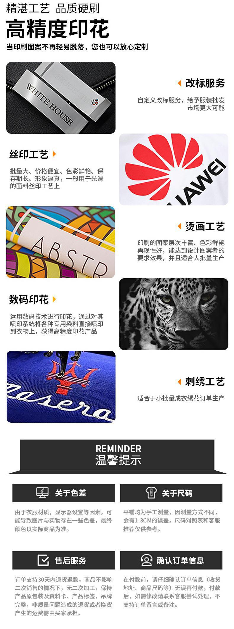 La fábrica de personalización de ropa Wuhan Kexiang admite logotipos personalizados de una pieza, envío directo de una pieza, pedido mínimo de una pieza, patrones impresos y empaque independiente de OPP, etiquetas de tamaño personalizadas, etiquetas de cuello y etiquetas de mangas.