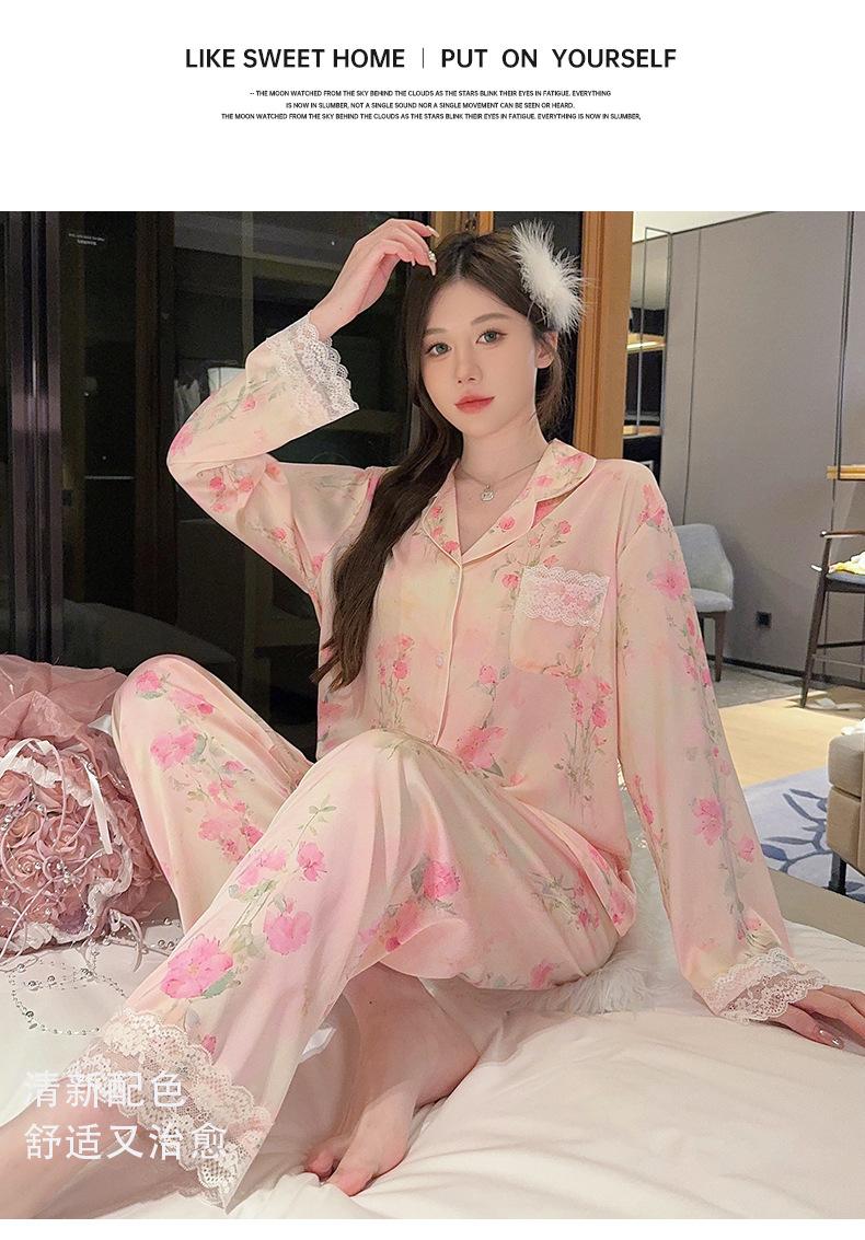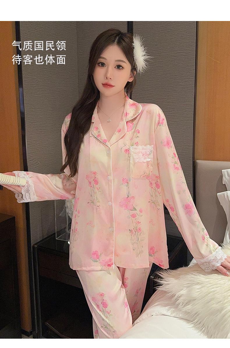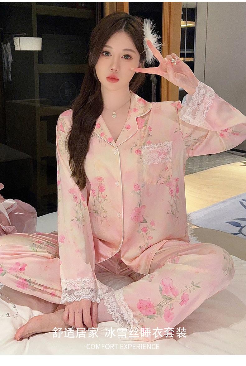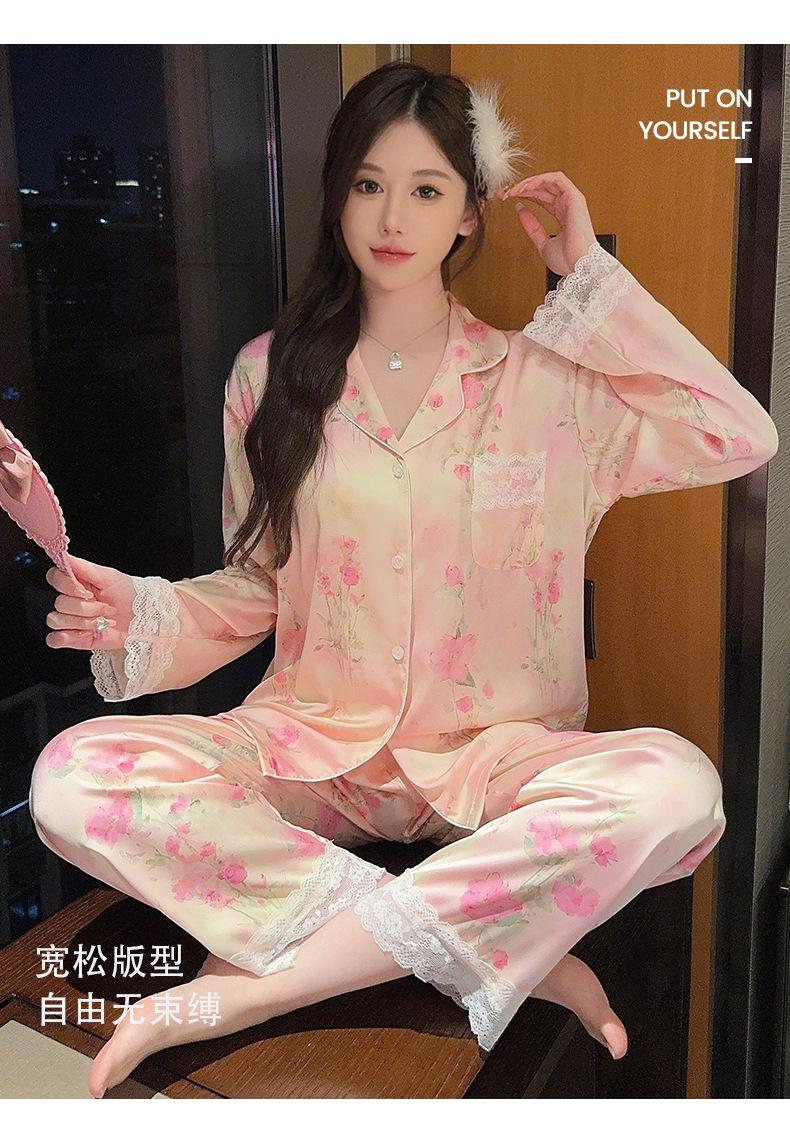 Pijamas dulces nuevos de primavera y otoño para mujer, pantalones de manga larga de seda helada, ropa exterior sexy para el hogar, traje fino, 2024