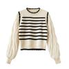 Tejido de punto francés falso de dos piezas con mangas abullonadas para mujer 2025 Otoño e Invierno Nuevo Empalme a Rayas Top Delgado Corto de Cuello Redondo