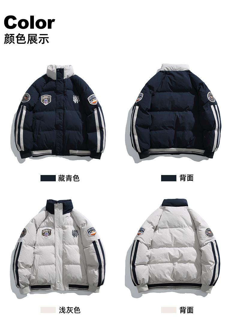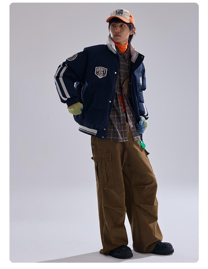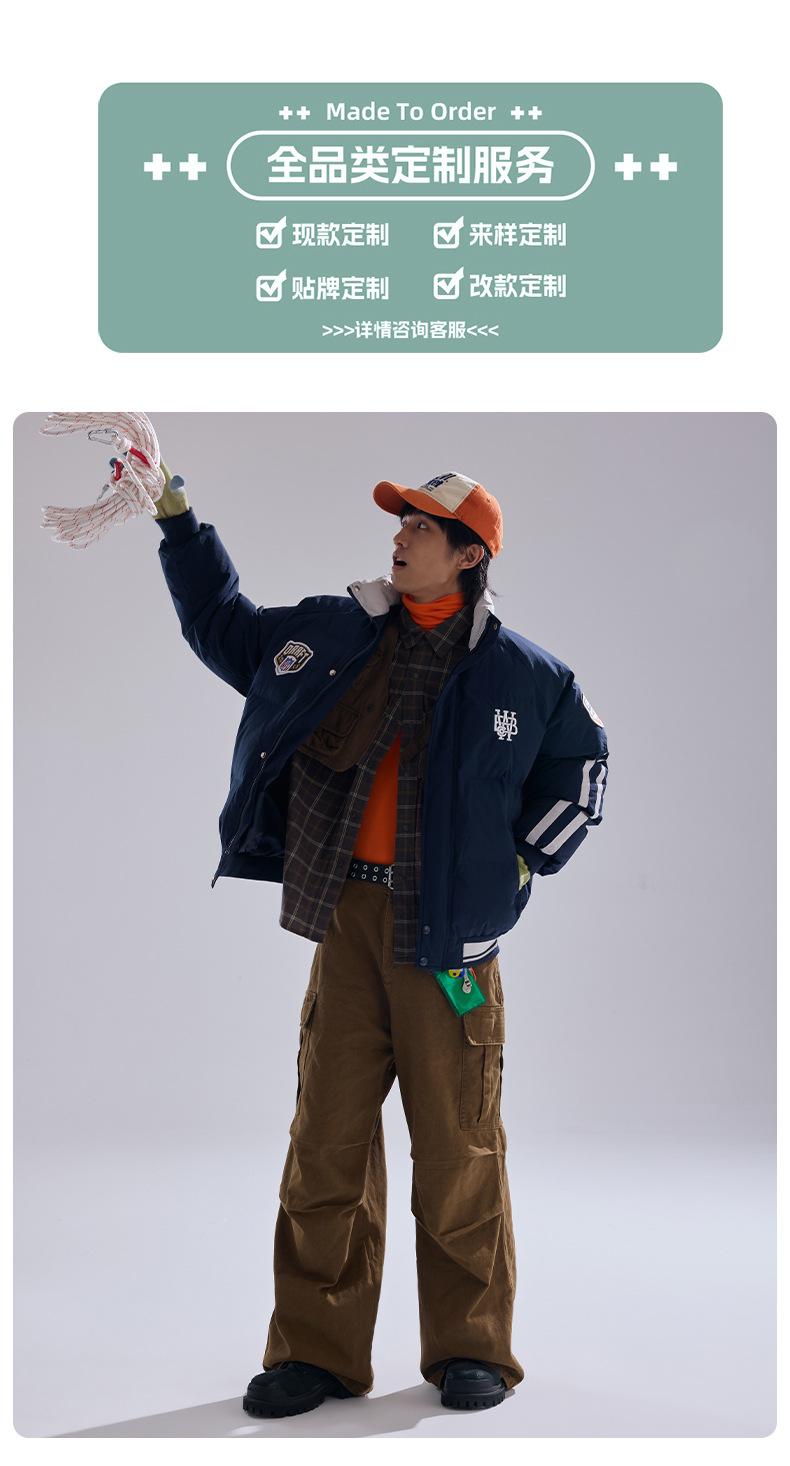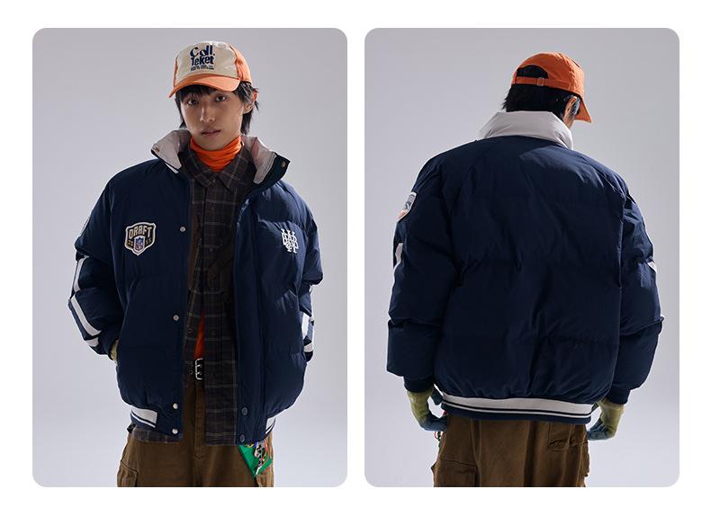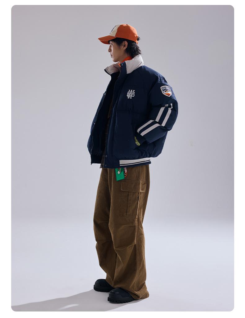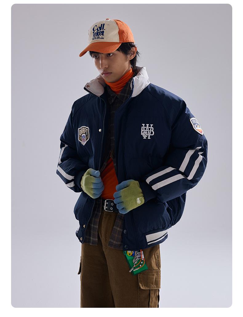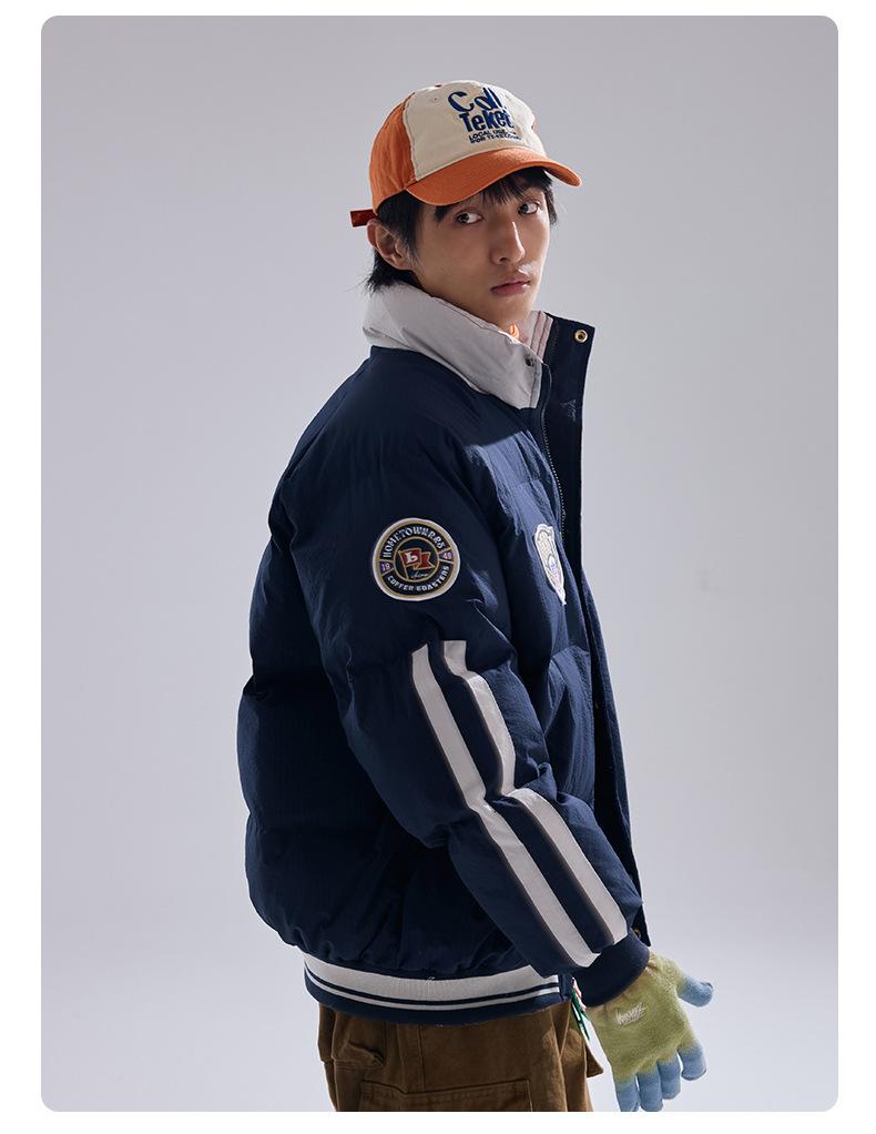 Chaqueta gruesa para hombre y mujer, de la marca japonesa Chaozhou, con diseño de calle principal, etiquetado con sentido del estilo y costuras verticales en el cuello, en colores contrastantes.