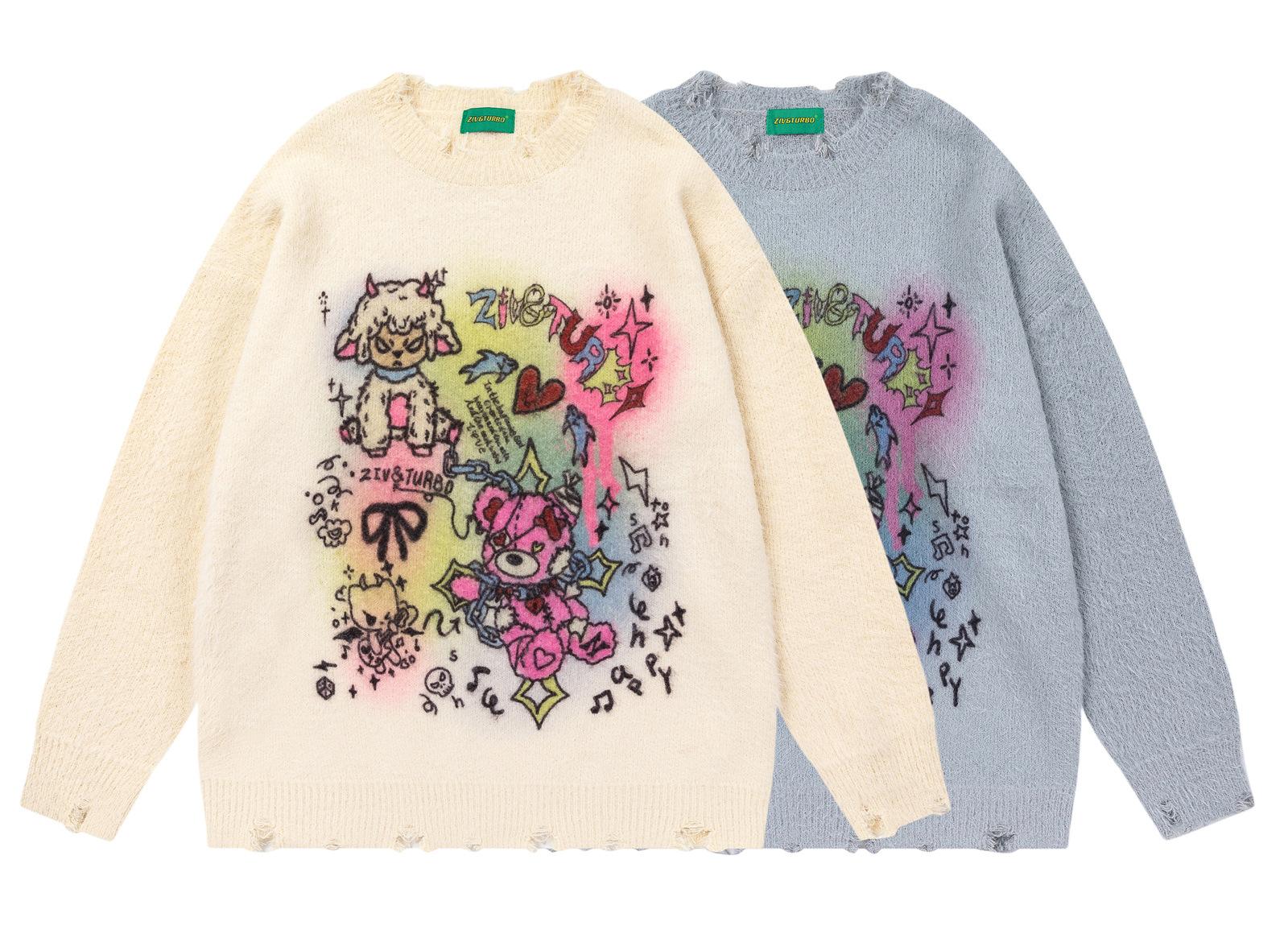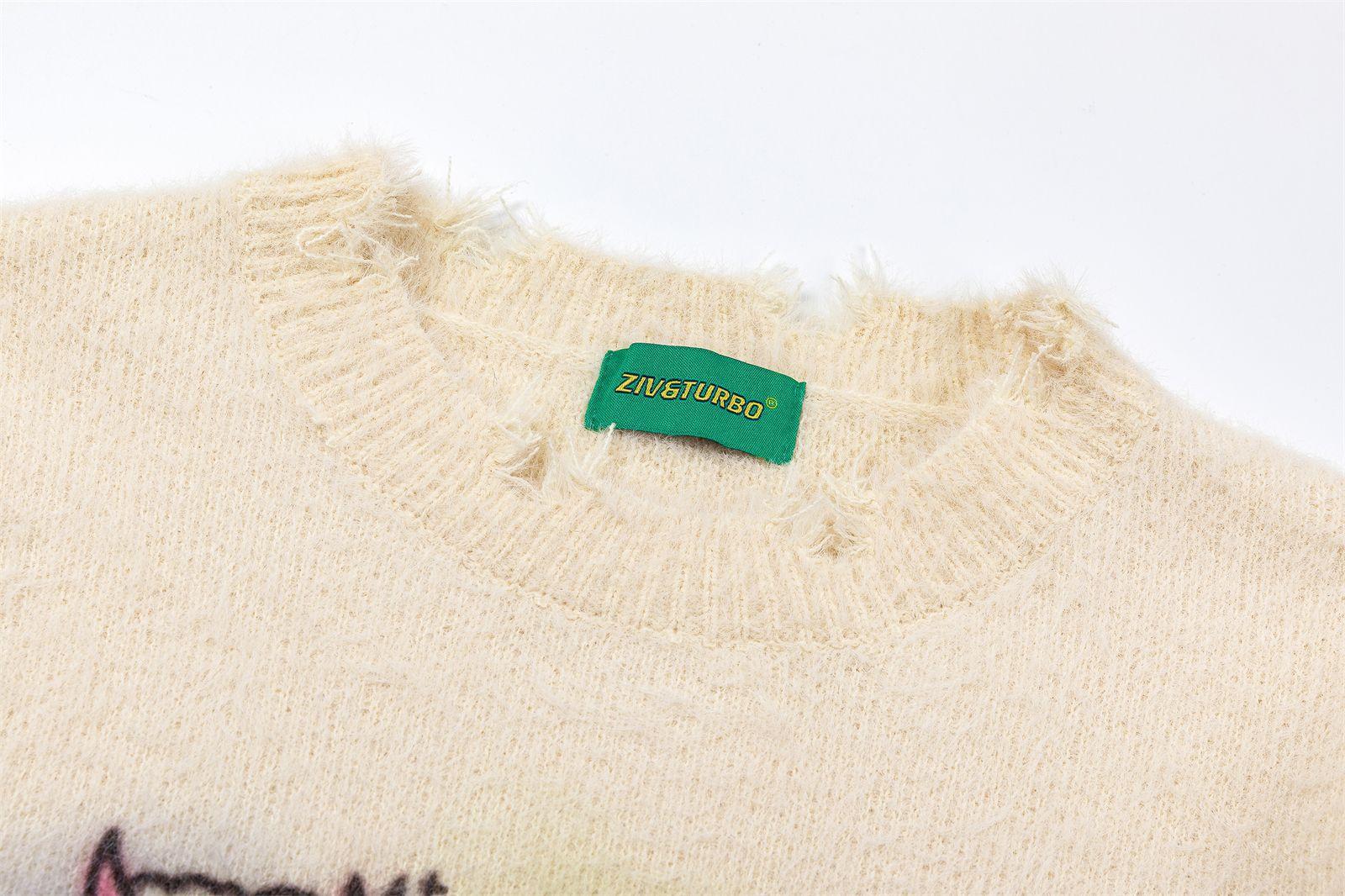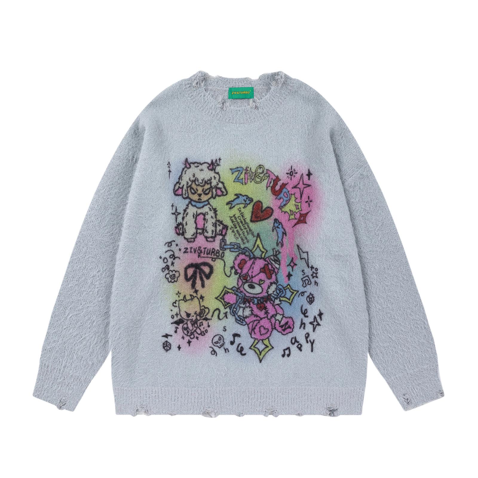 Suéter de cuello redondo con grafiti de dibujos animados, estilo retro y divertido, de marca de moda estadounidense, para hombre y mujer. Diseño de punto de estilo relajado y nicho.