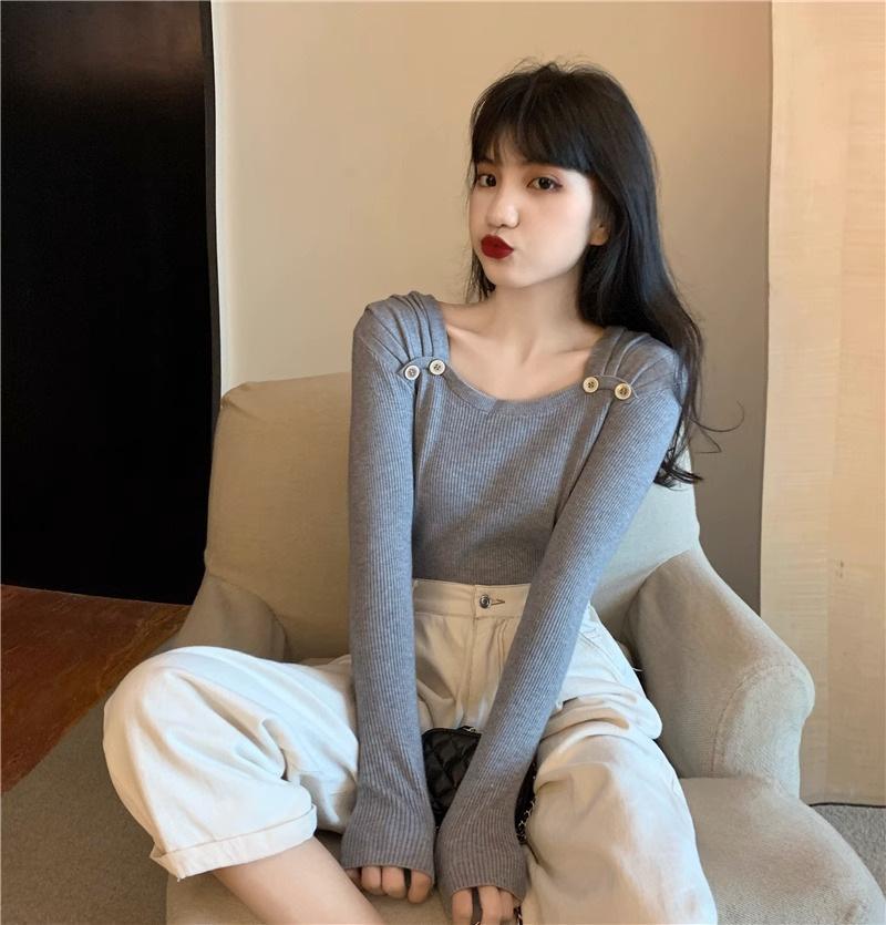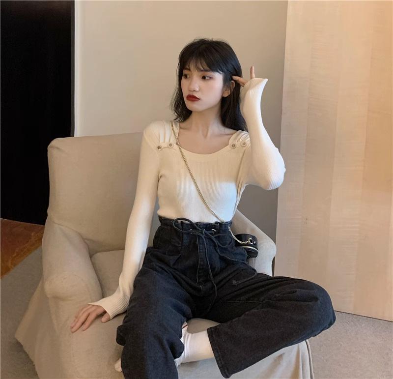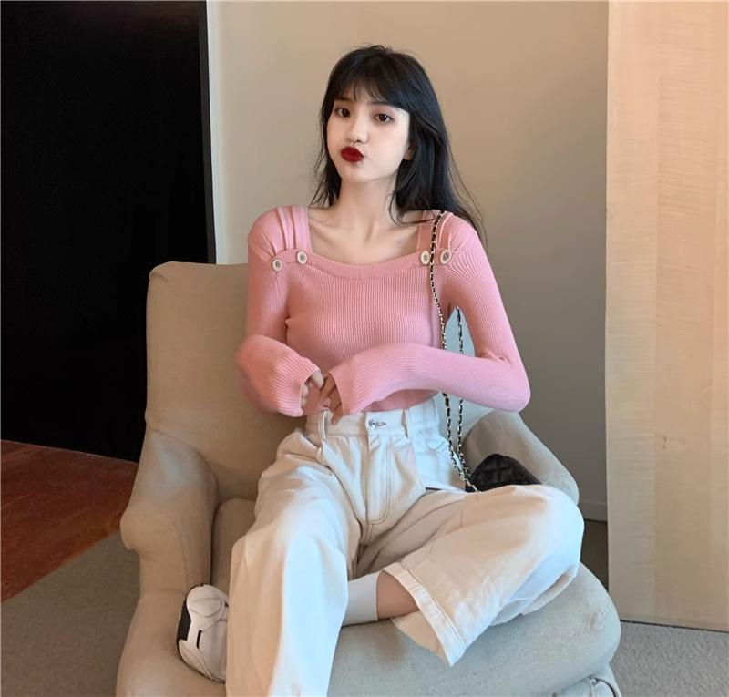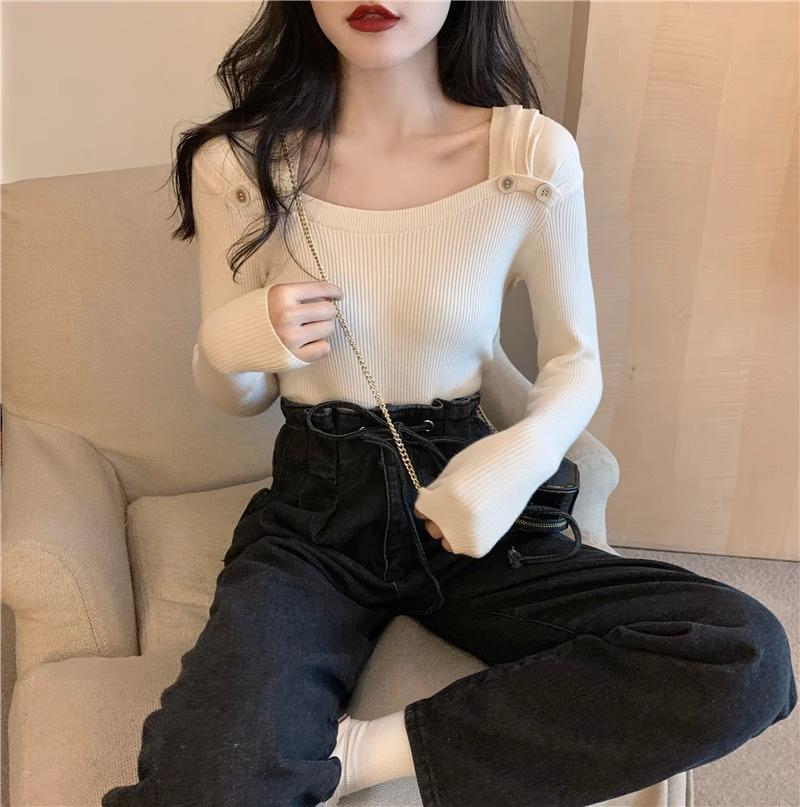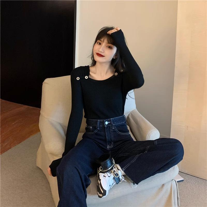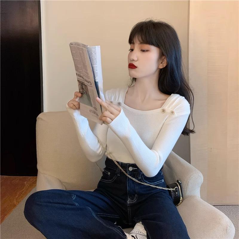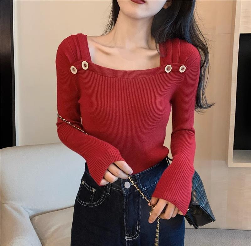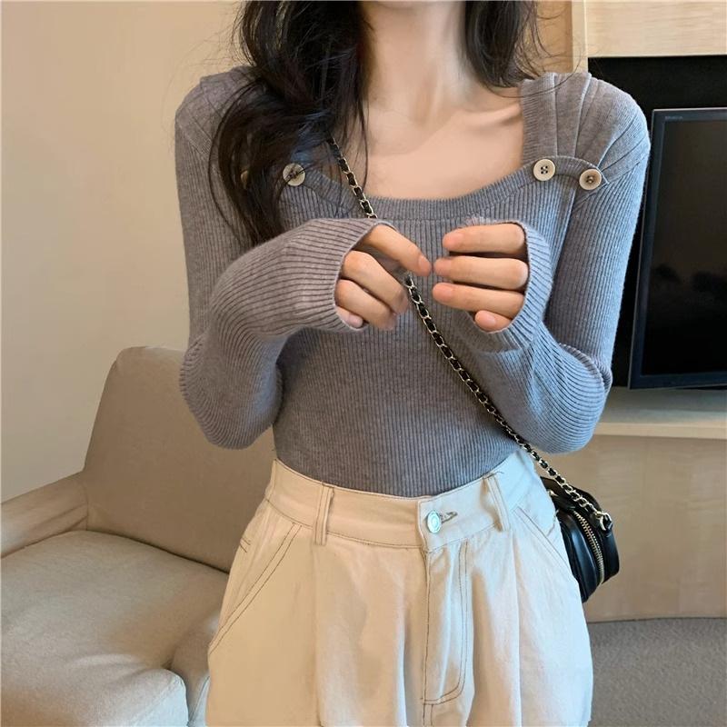 Camiseta Interior Suéter Tejido Exterior para Mujer 2022 Otoño e Invierno Manga Larga Ajustado Clavícula Jersey Top Interior al Por Mayor