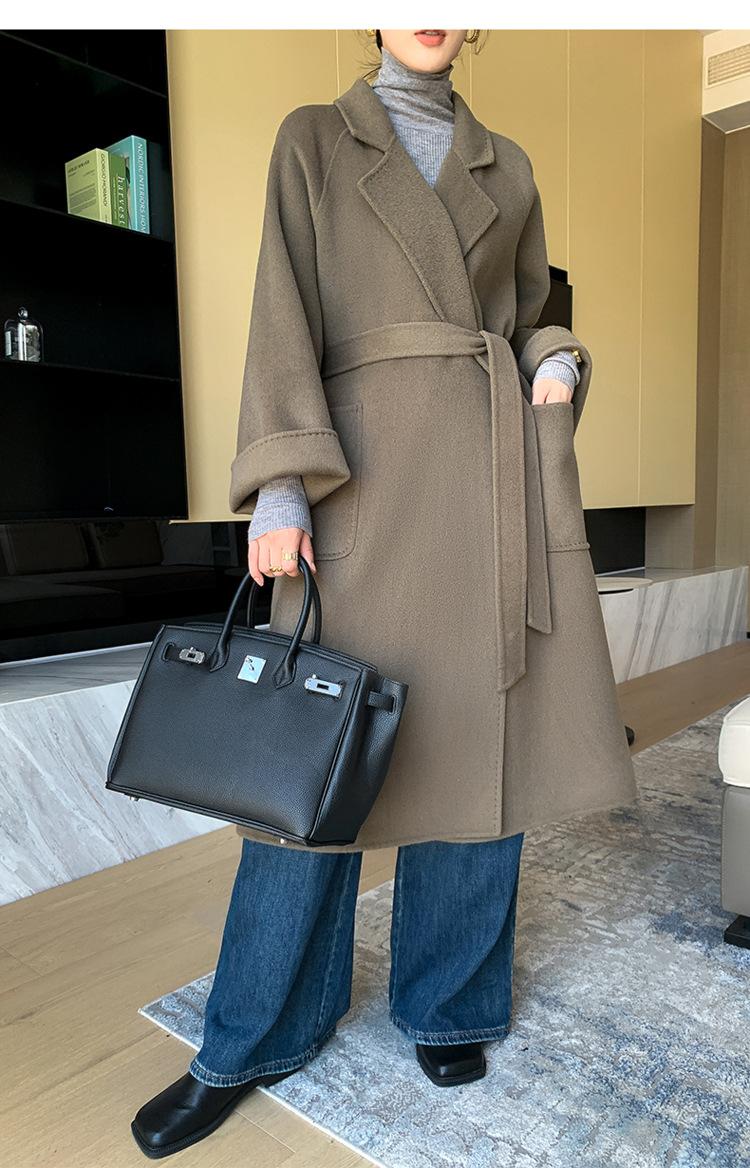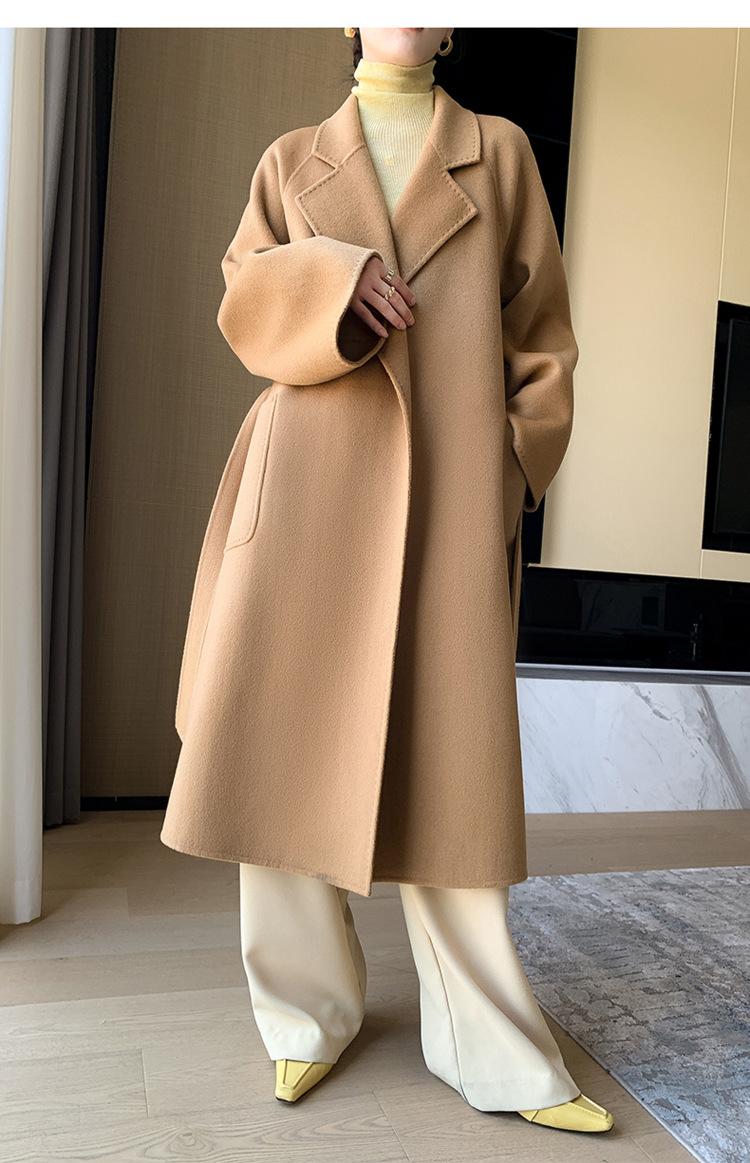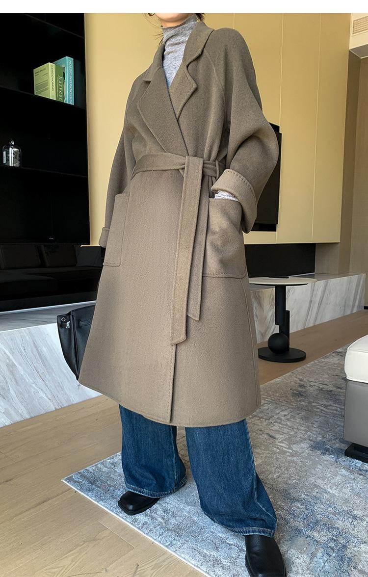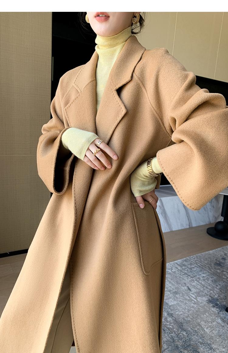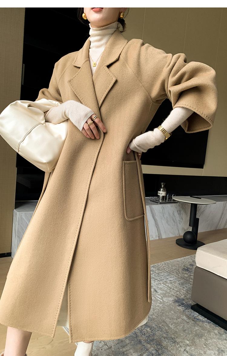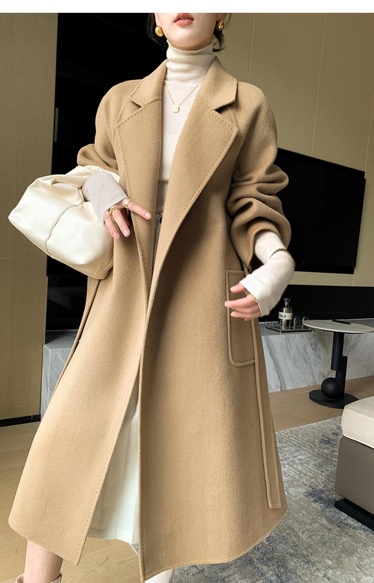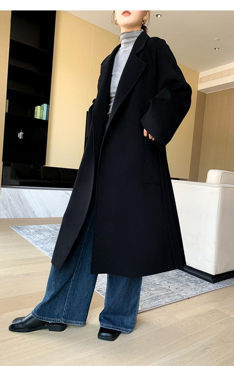 Abrigo de Lana para Otoño e Invierno, Lana de Doble Cara, Abrigo Holgado para Mujer, Estilo Traje, Extralargo con Cinturón, 100% Lana, Sobre la Rodilla, Estilo Elegante