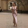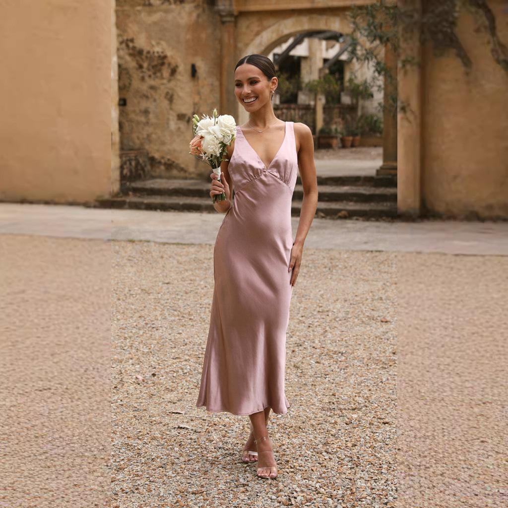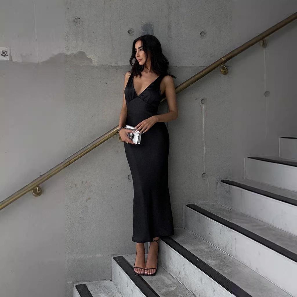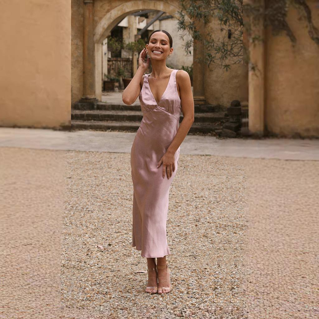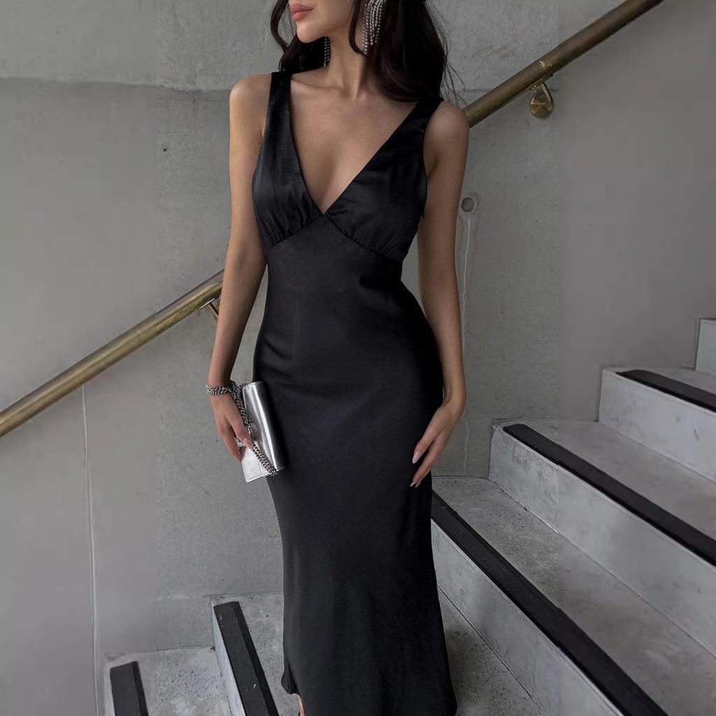 Ropa Europea y Americana 2025 Nuevo Sexy Profundo V Espalda Descubierta Moda Falda Slim Midi Vestido con Tirantes para Mujer