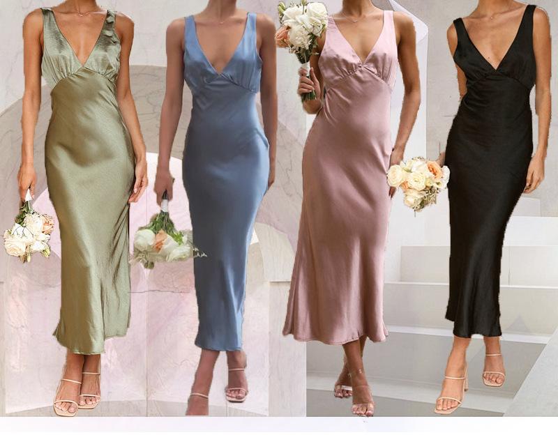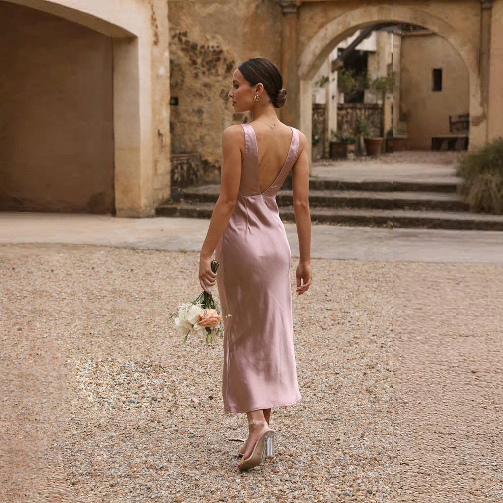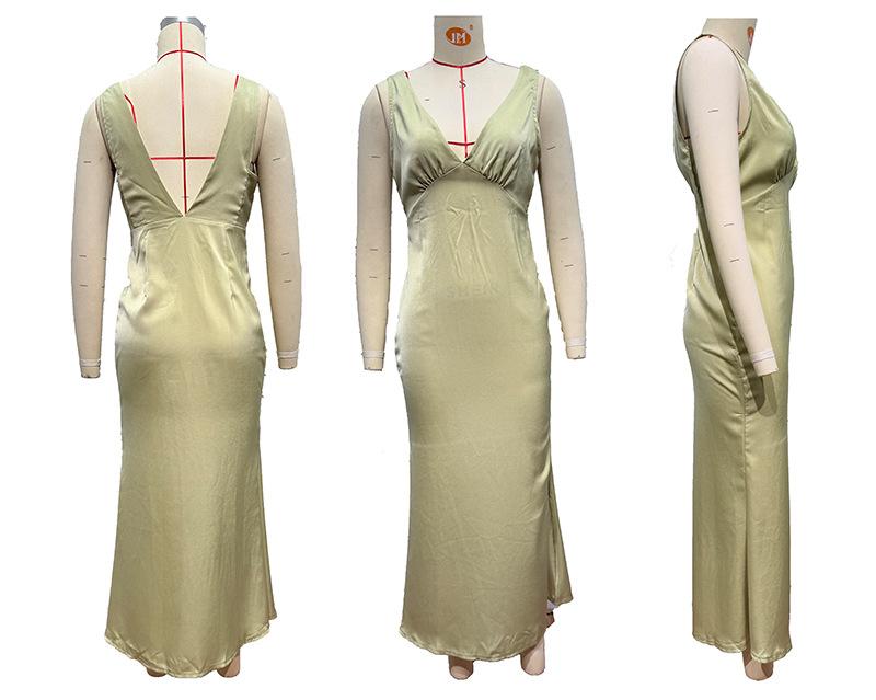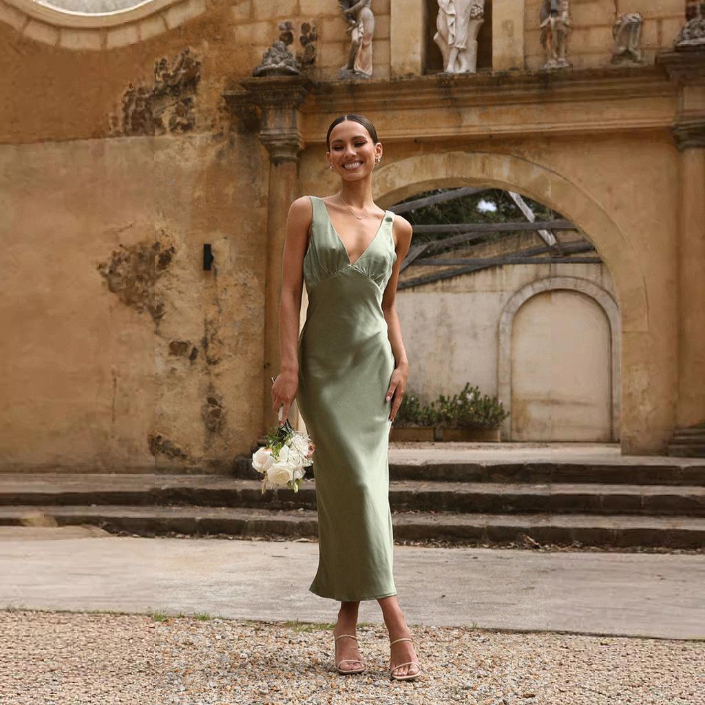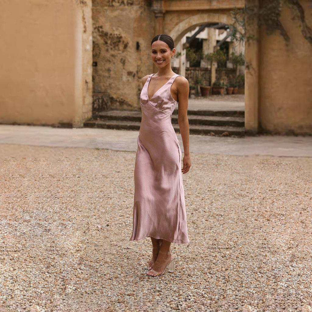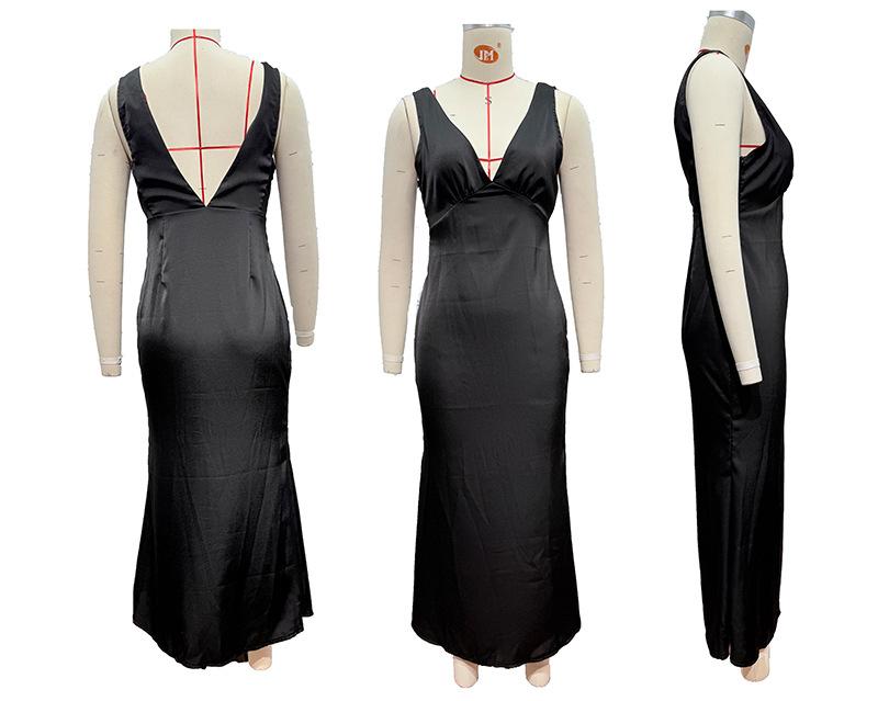 Ropa Europea y Americana 2025 Nuevo Sexy Profundo V Espalda Descubierta Moda Falda Slim Midi Vestido con Tirantes para Mujer