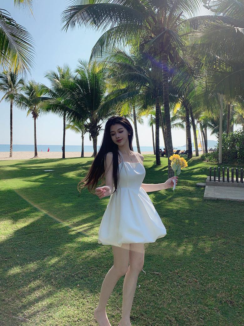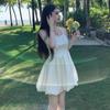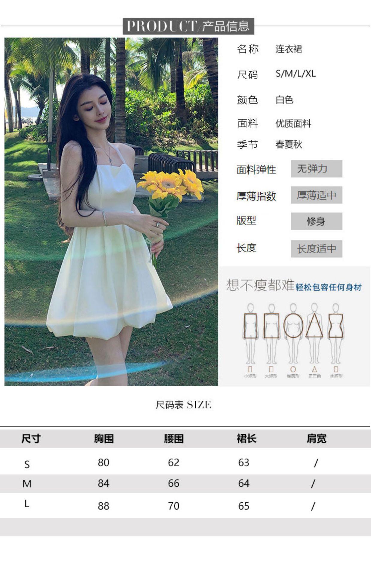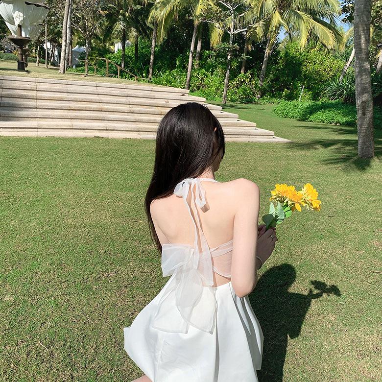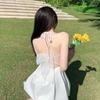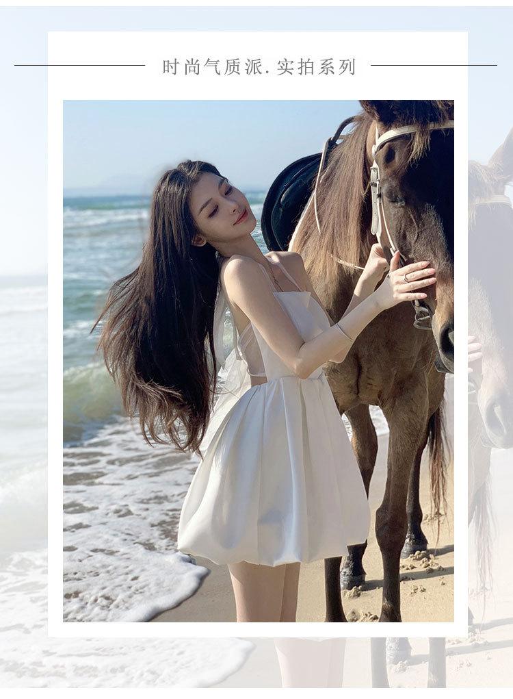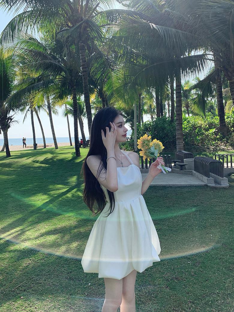 Nuevo Vestido de Tirantes Descubierto Verano Vacaciones Sexy Vestido de Playa Cintura Ajustada Corte Entallado Falda Tutú Falda Blanca