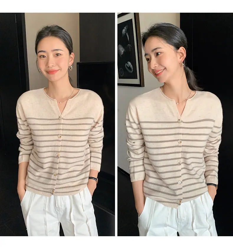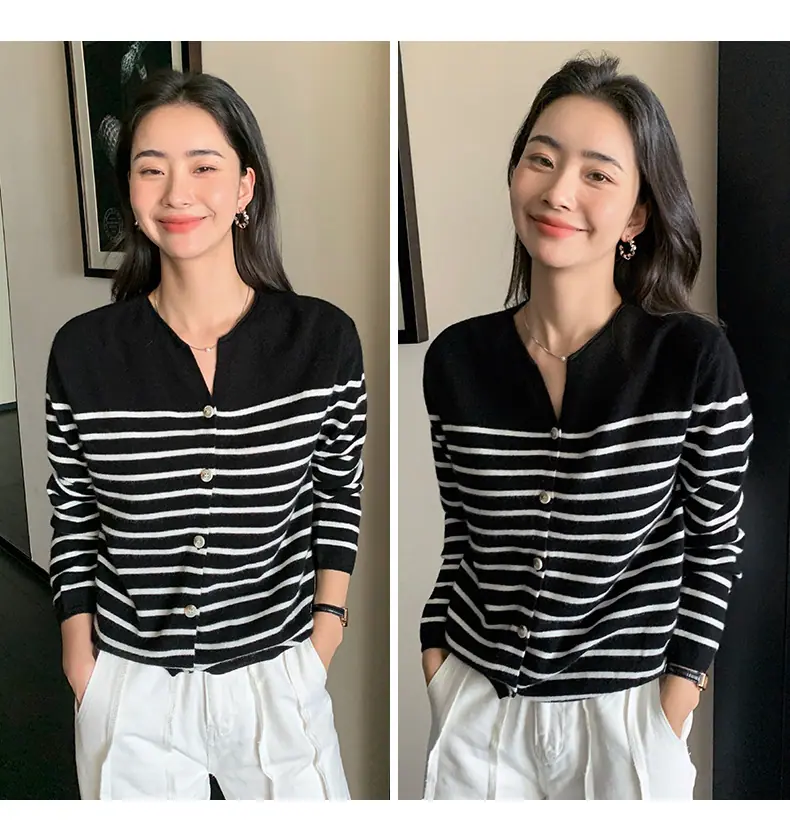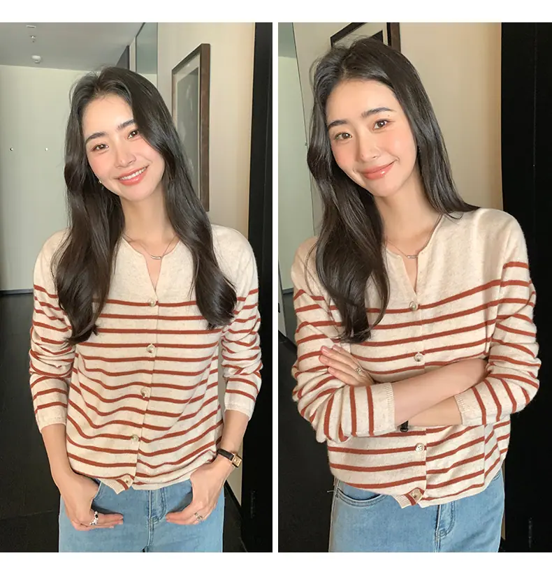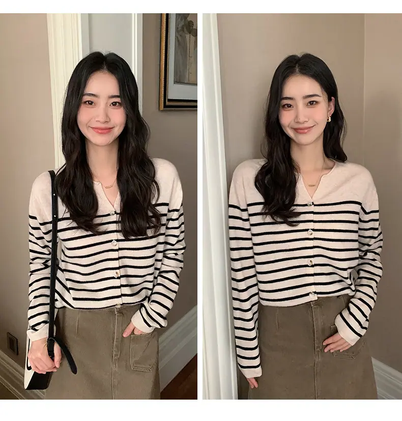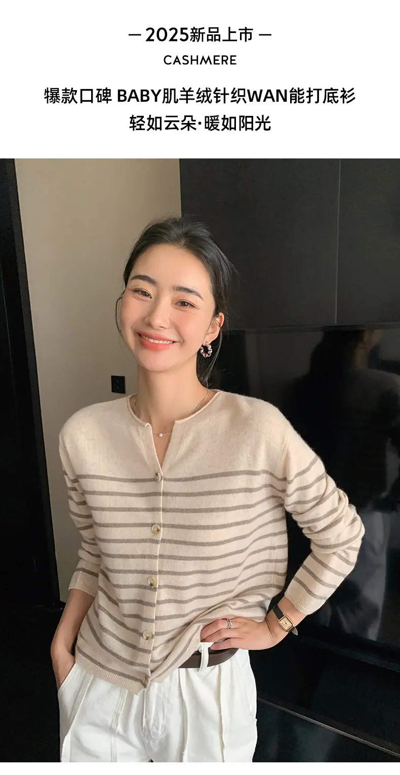 Cárdigan de Punto Rayado de Cuello Redondo para Mujer Otoño e Invierno 2025 Nuevo Estilo Casual Suéter Corto Tejido en Capas Cachemira Abrigo Pequeño