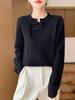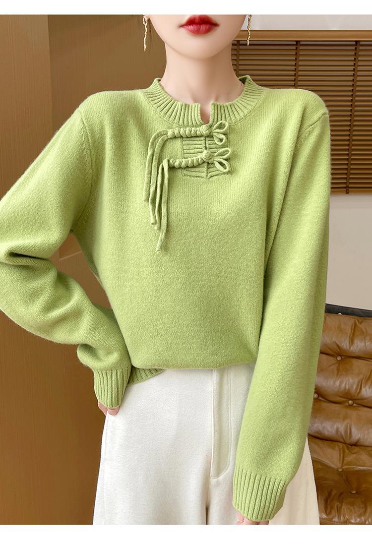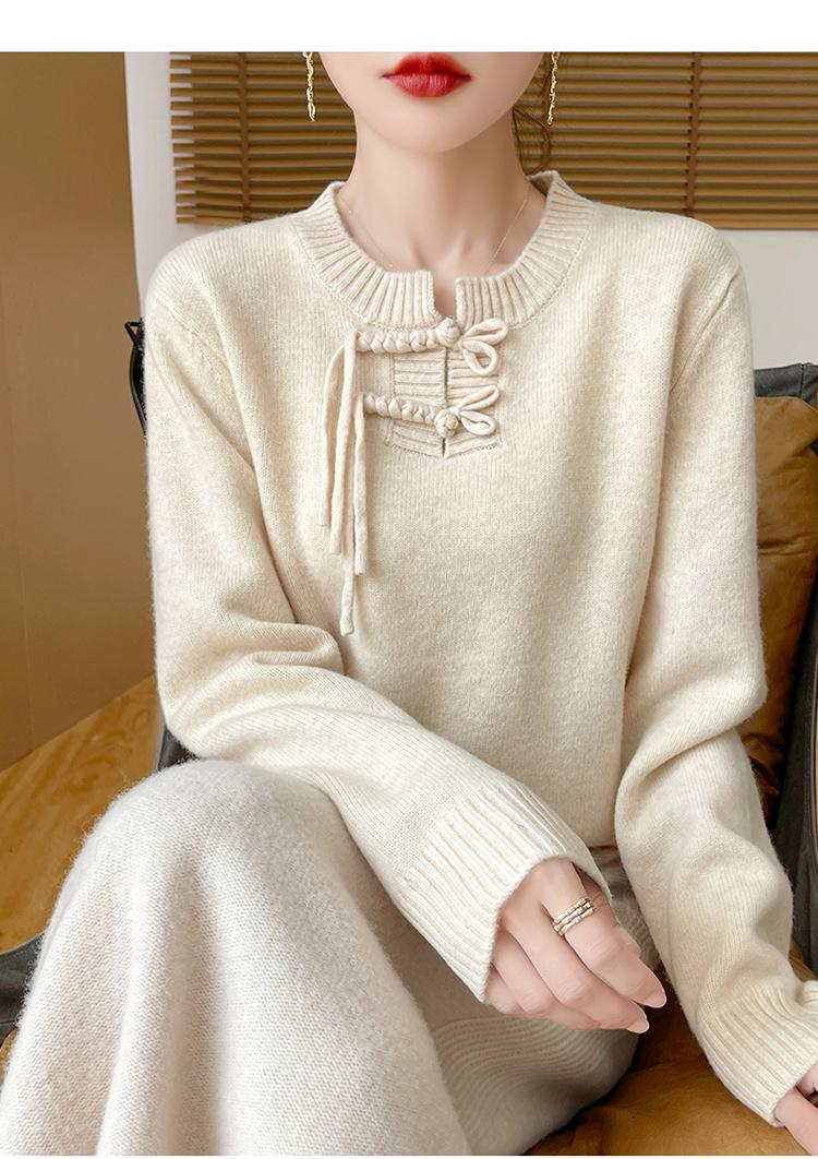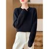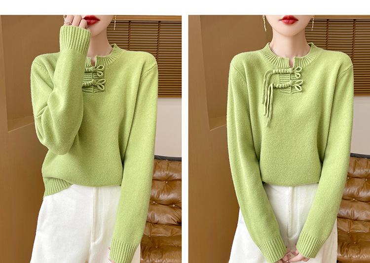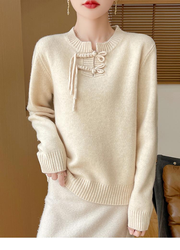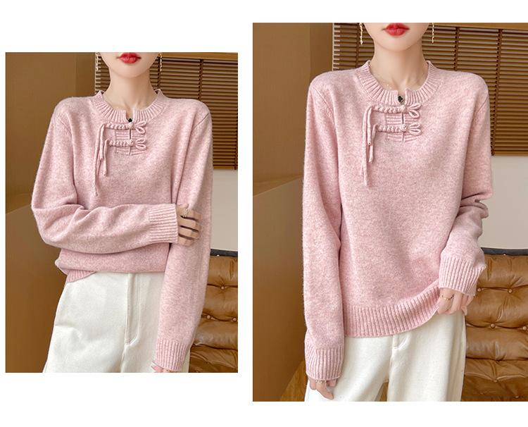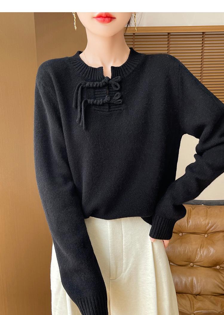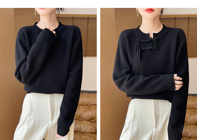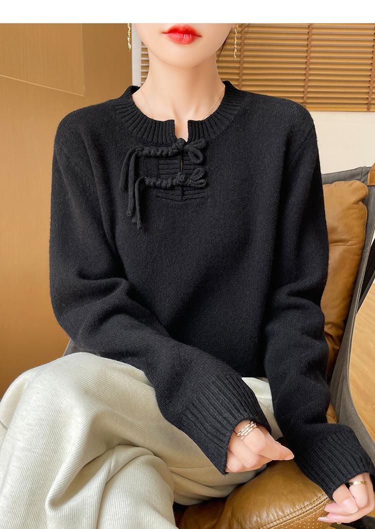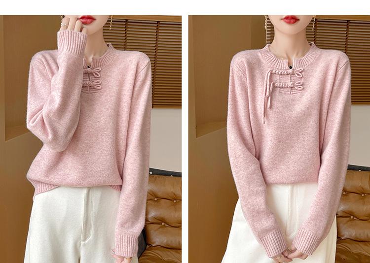 Suéter de cuello redondo para mujer, suéter de punto de lana pura, suéter retro con hebilla y lazo, otoño e invierno, nuevo
