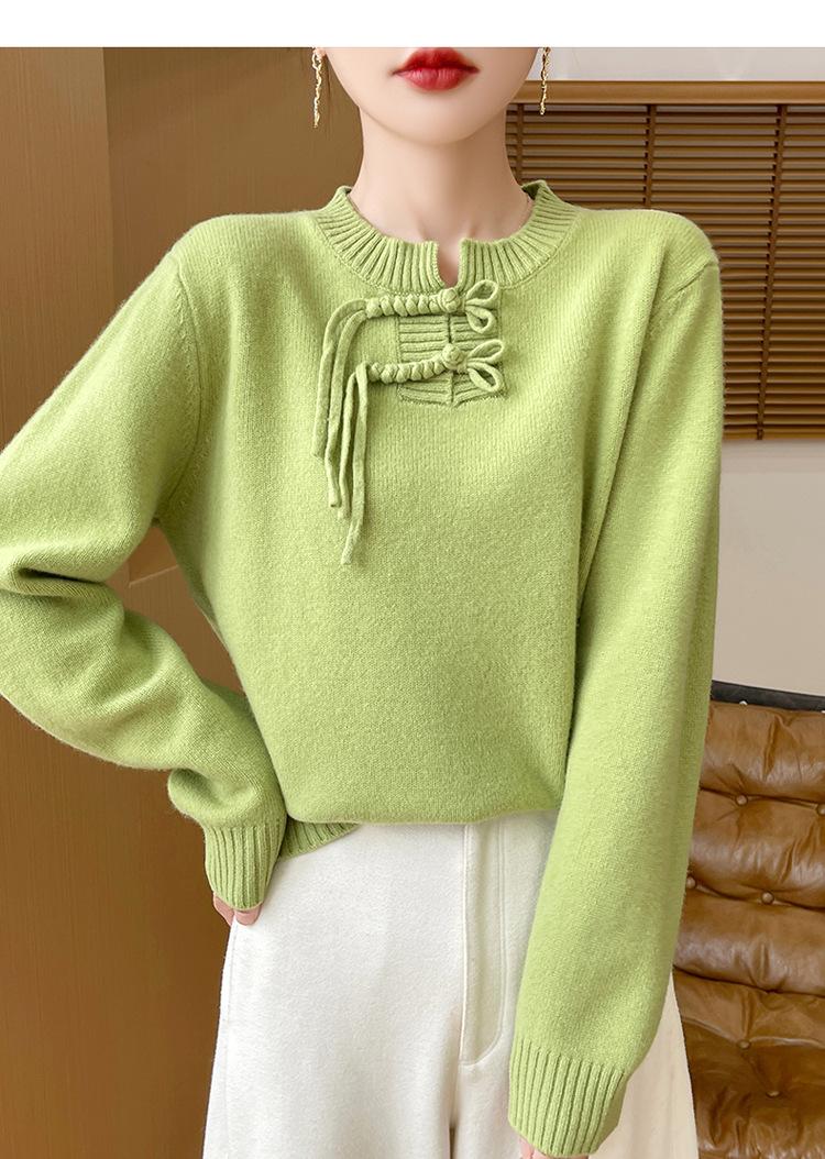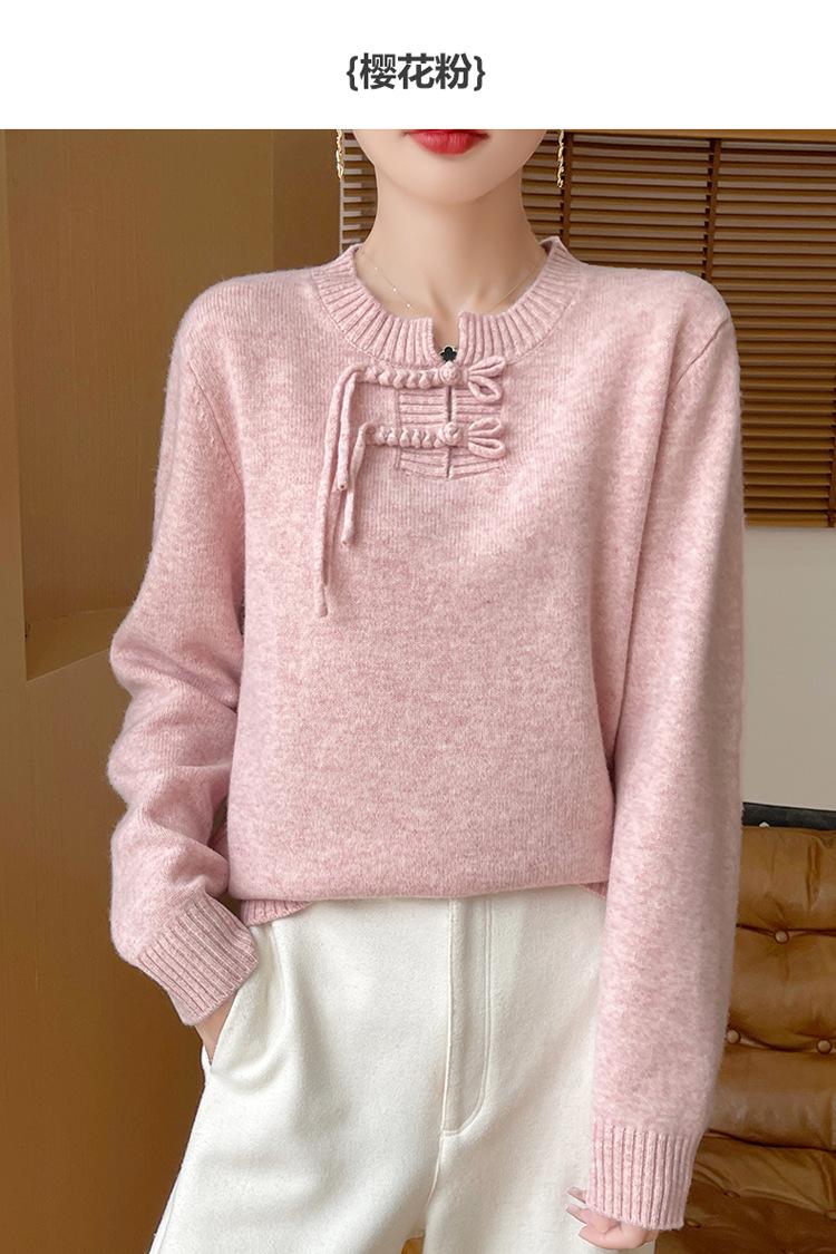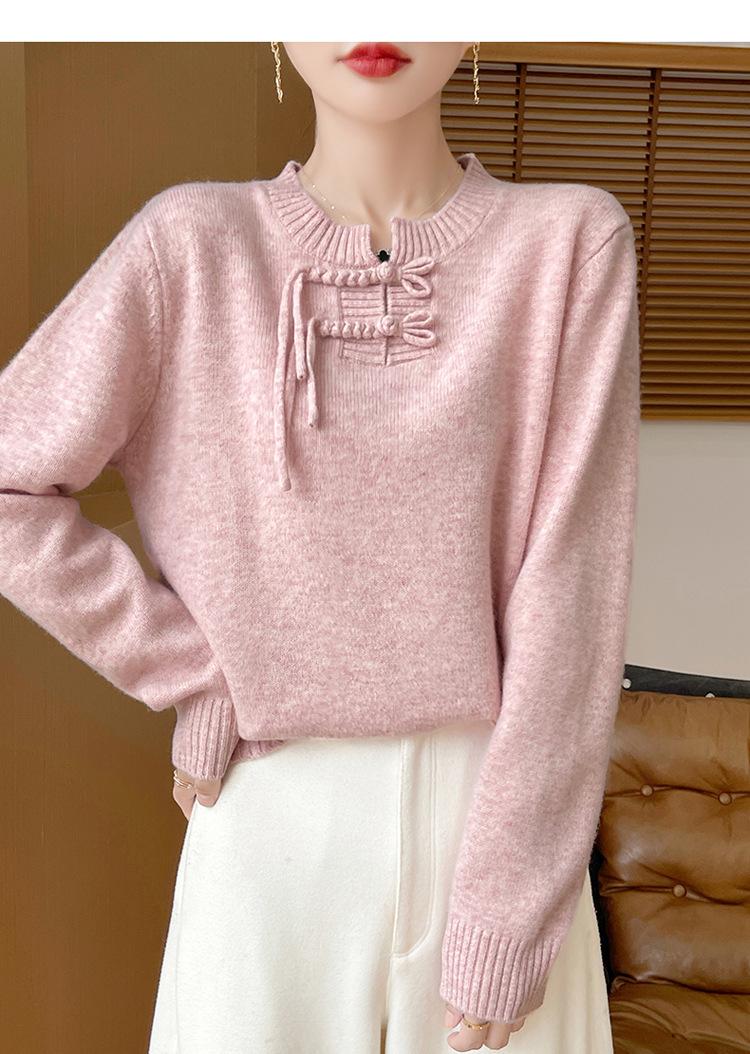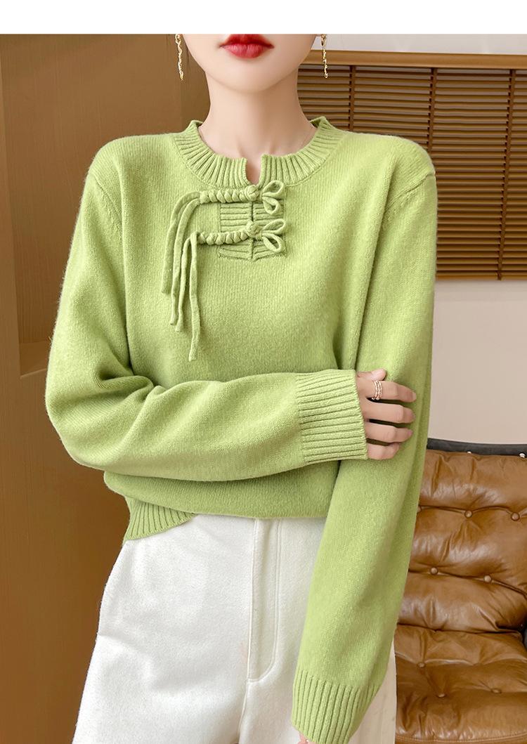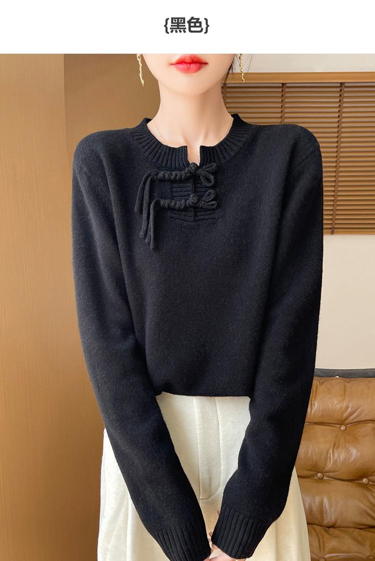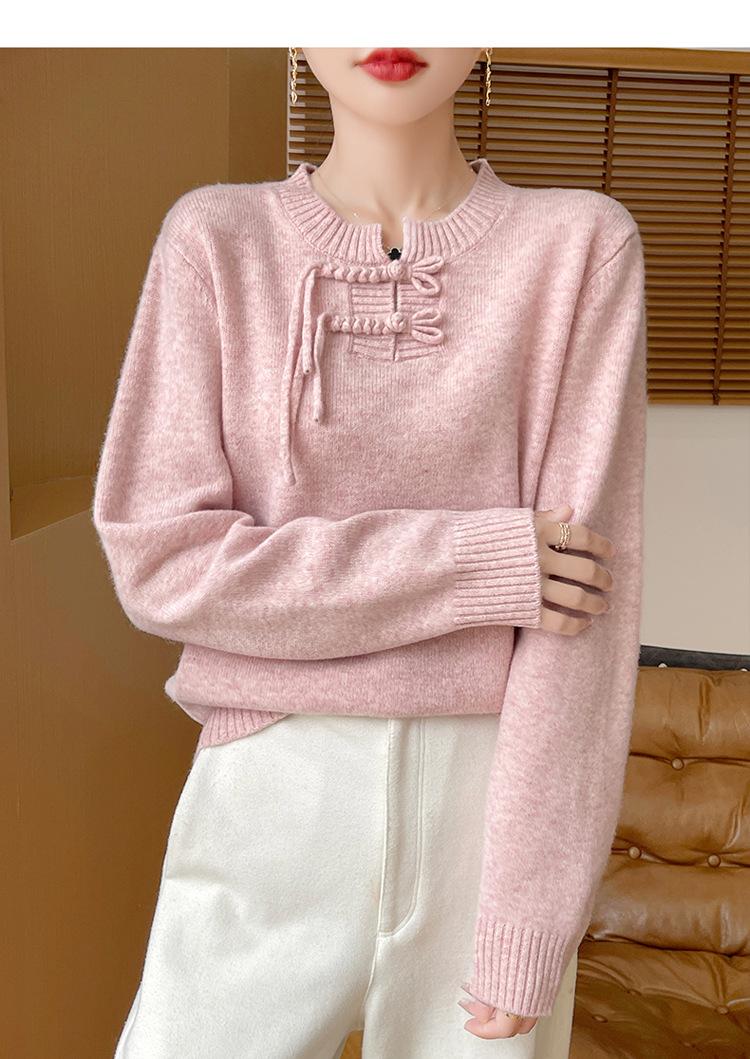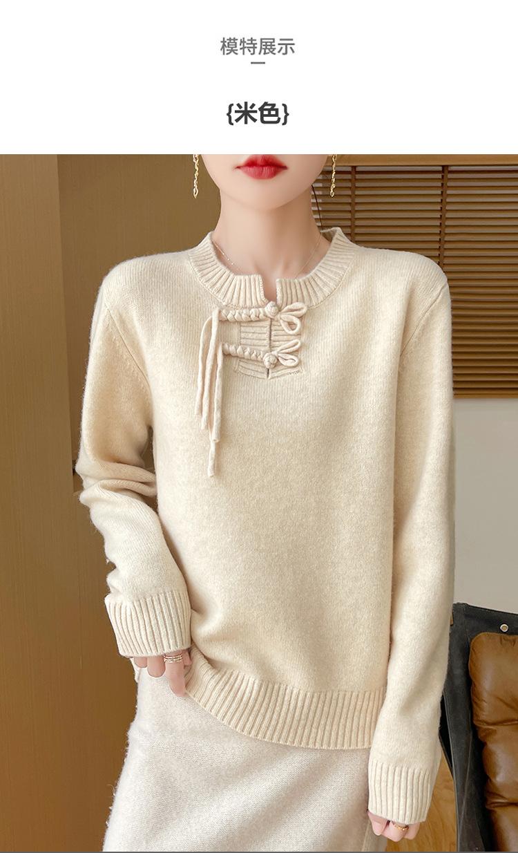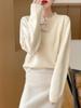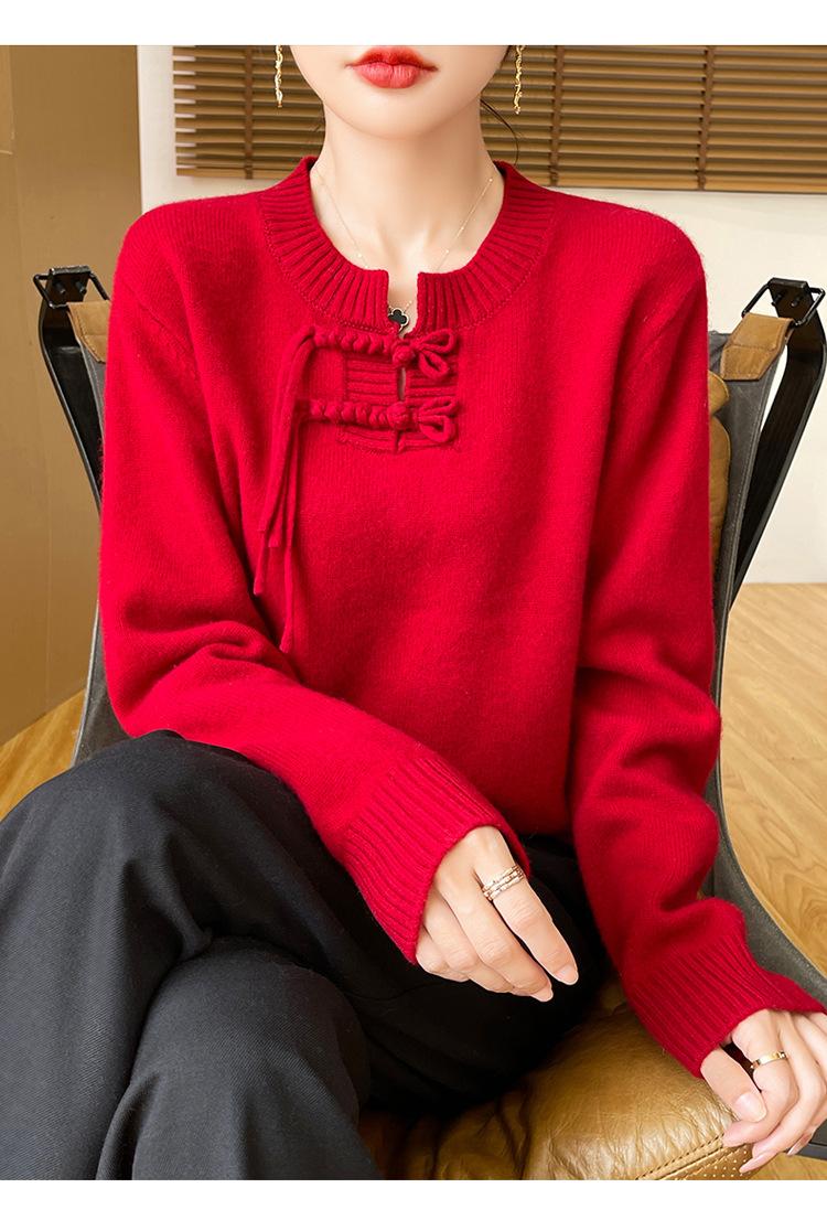 Suéter de cuello redondo para mujer, suéter de punto de lana pura, suéter retro con hebilla y lazo, otoño e invierno, nuevo