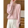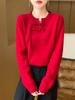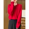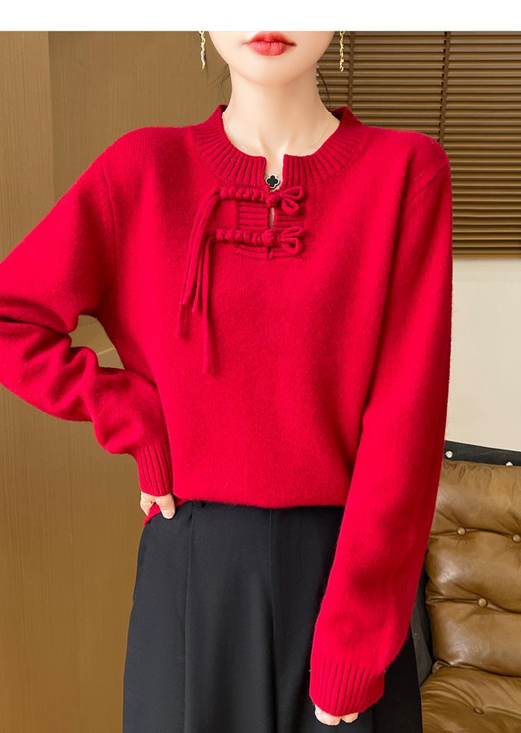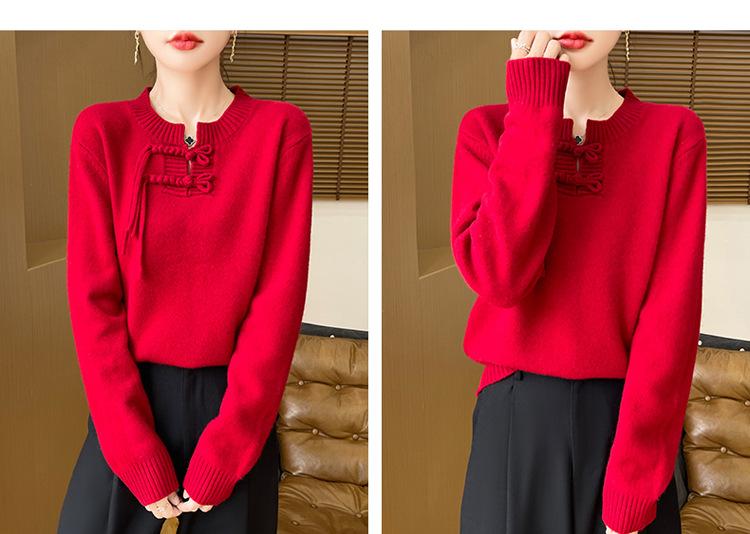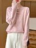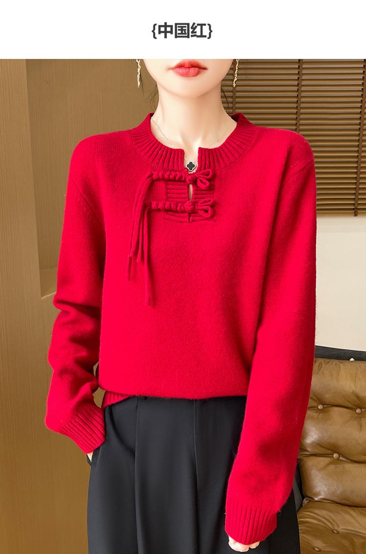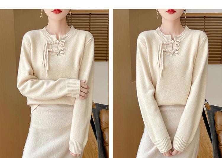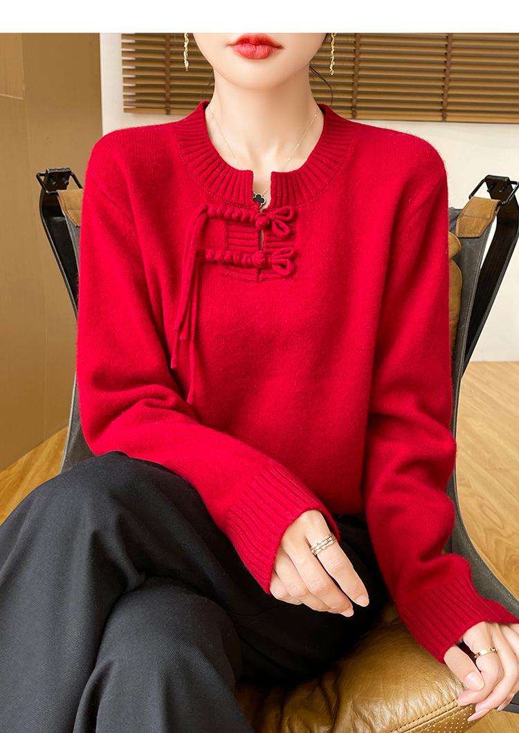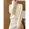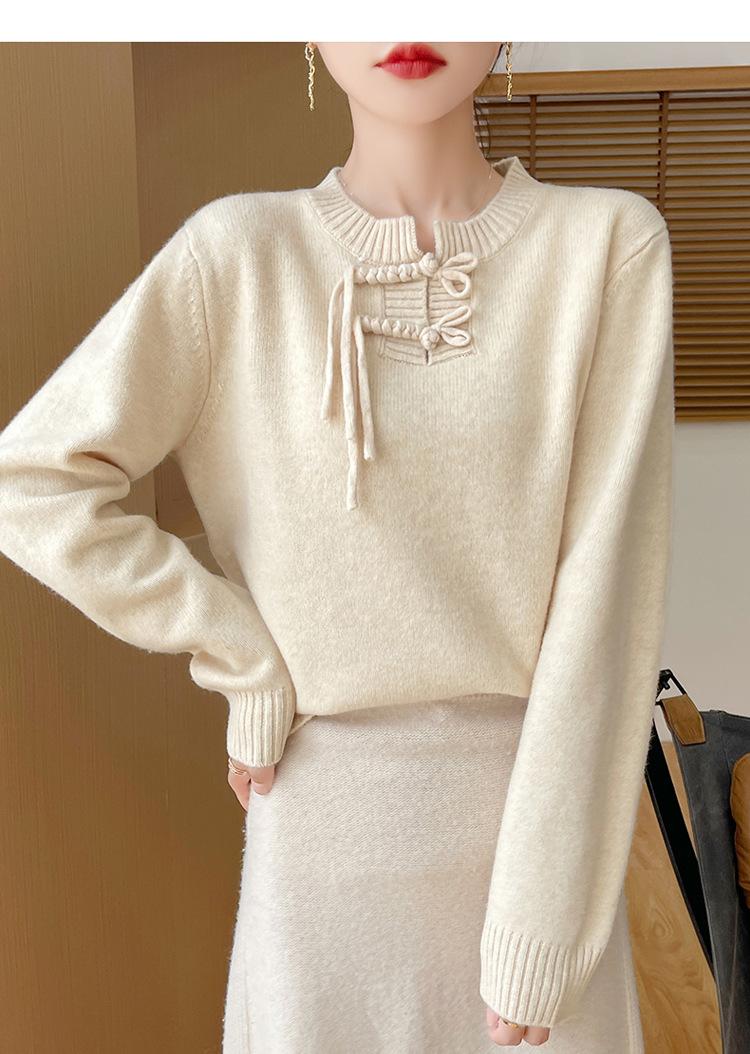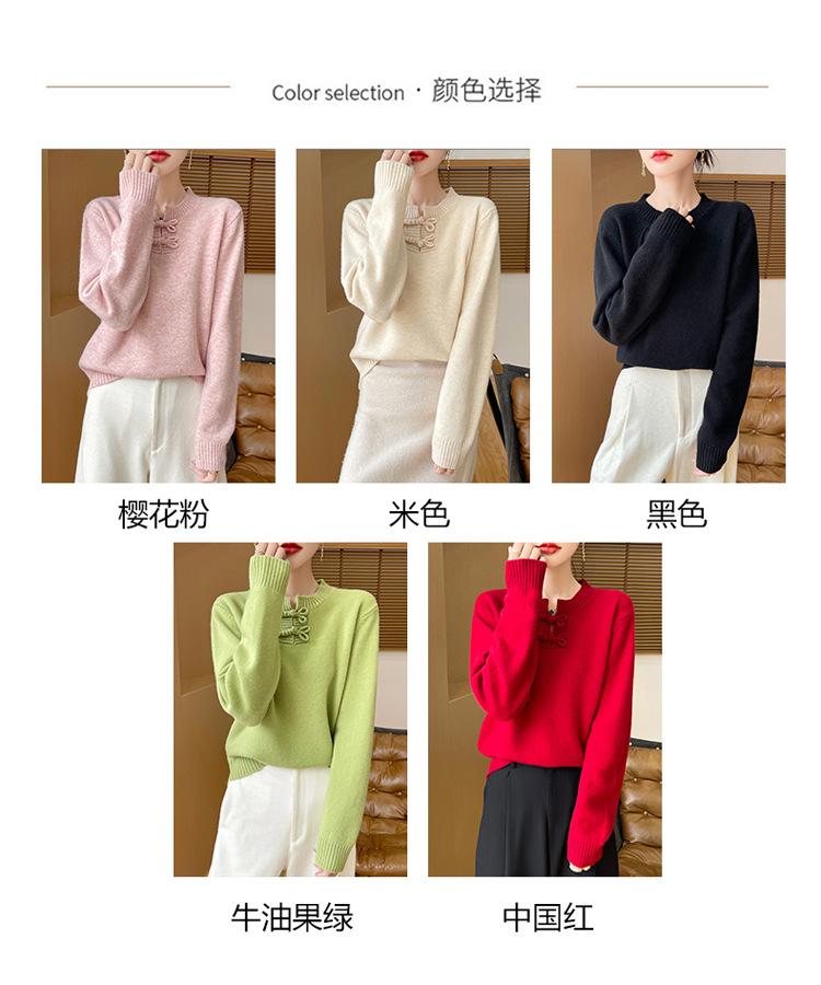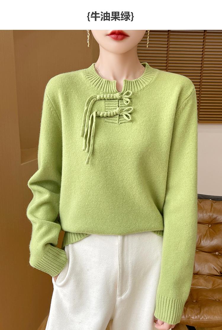 Suéter de cuello redondo para mujer, suéter de punto de lana pura, suéter retro con hebilla y lazo, otoño e invierno, nuevo
