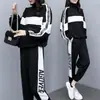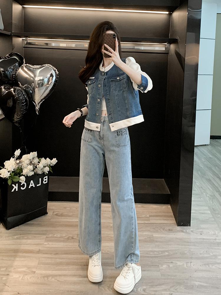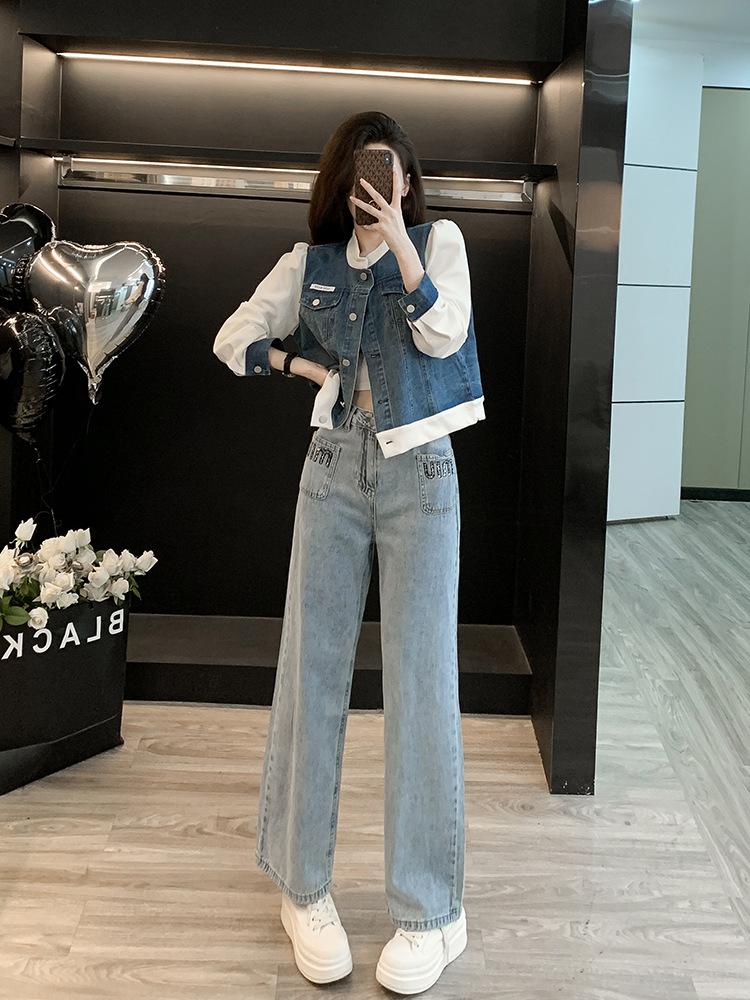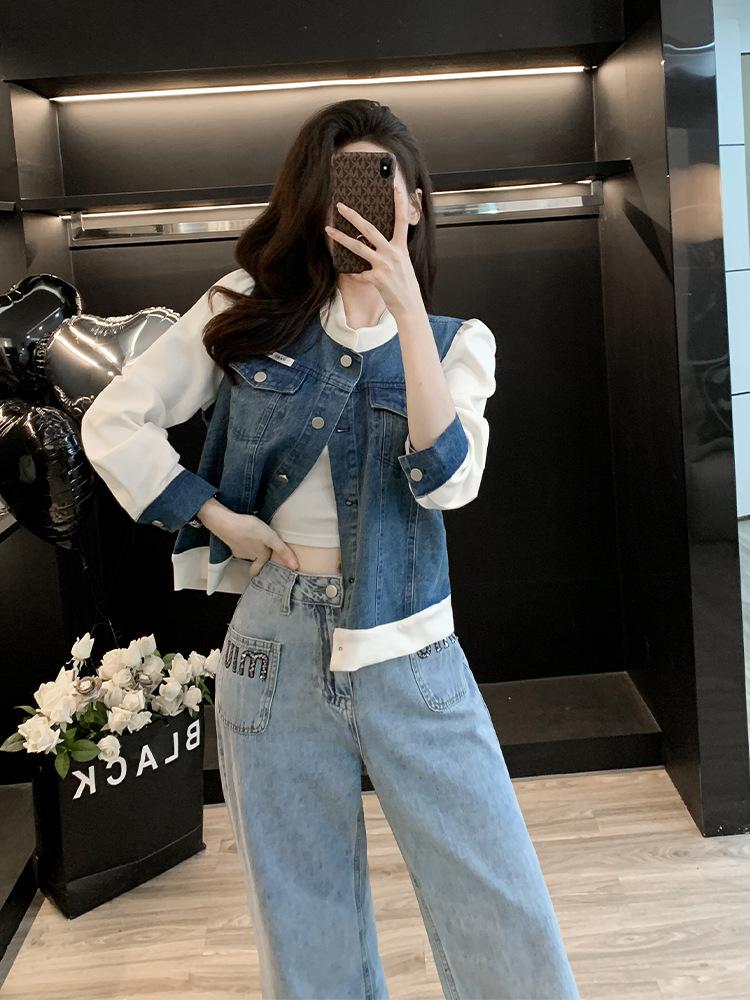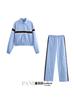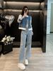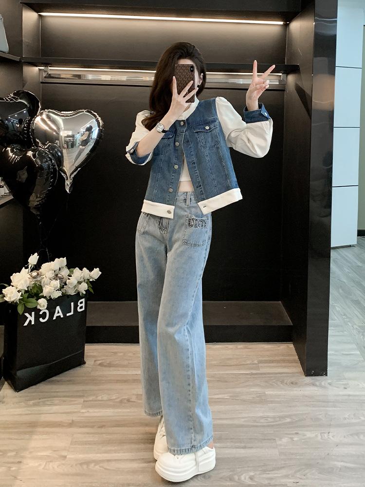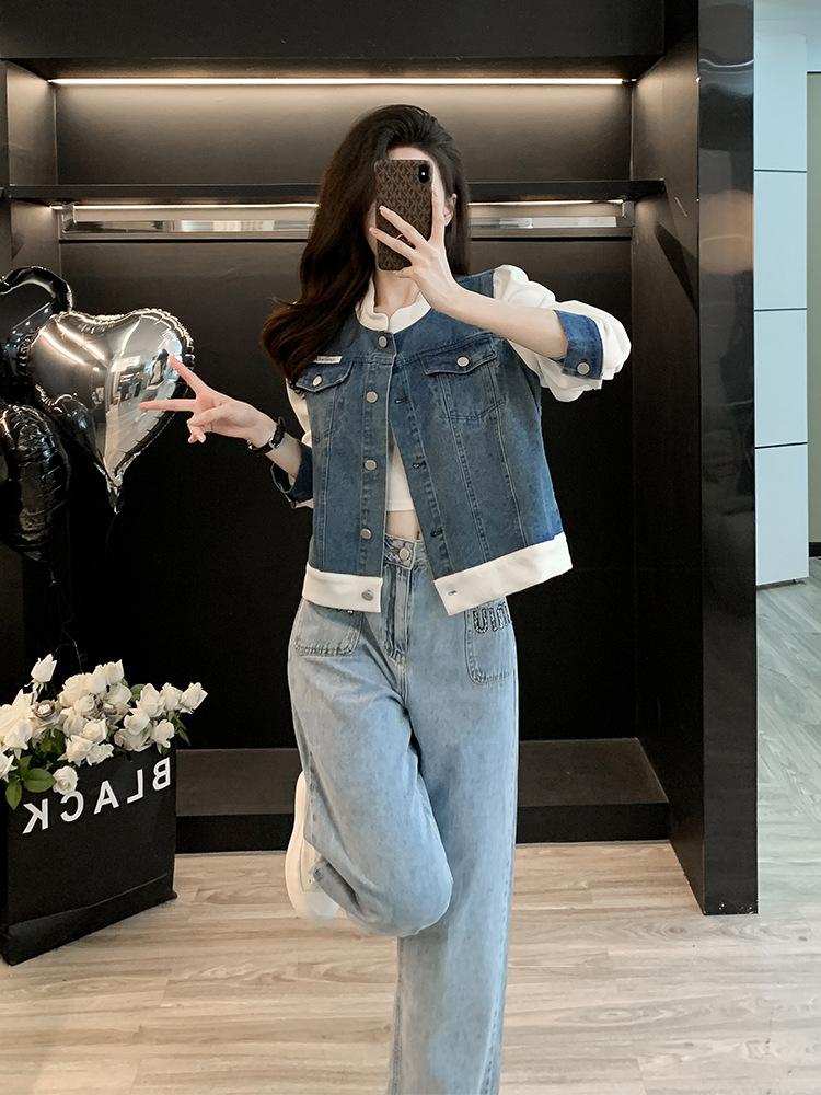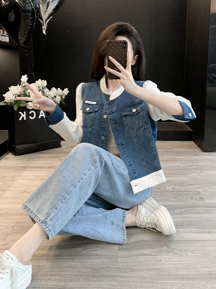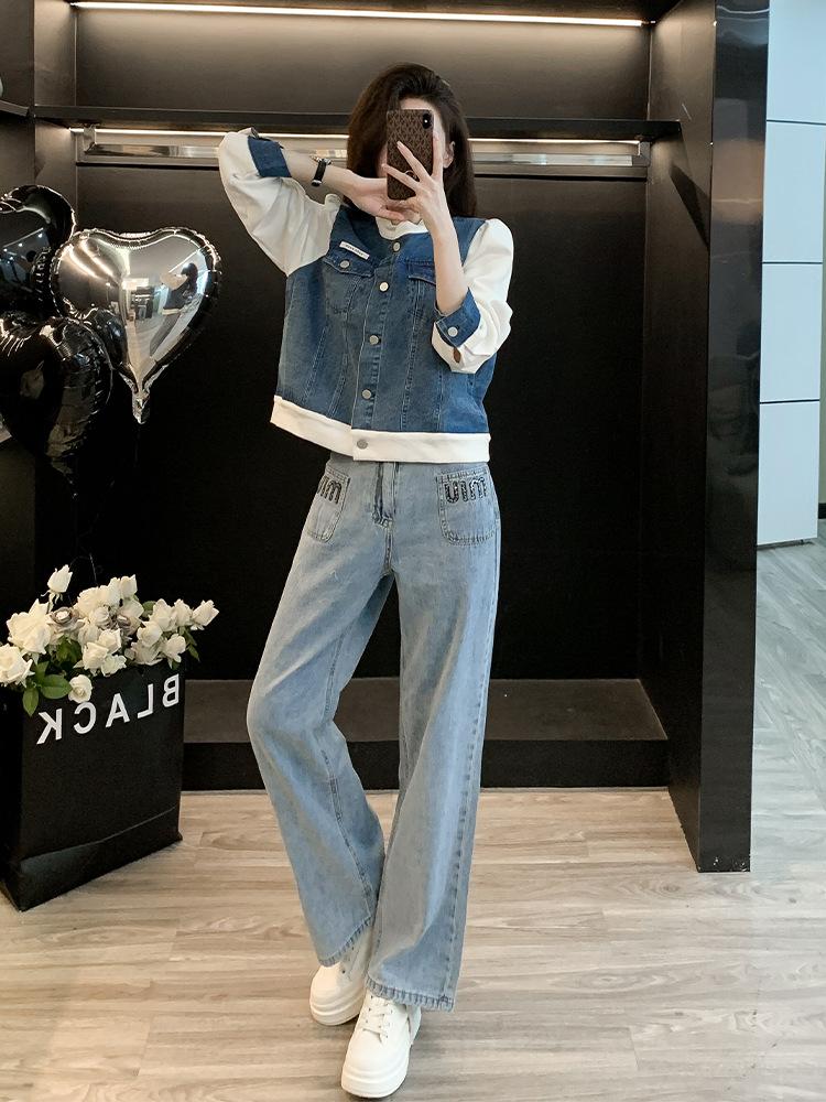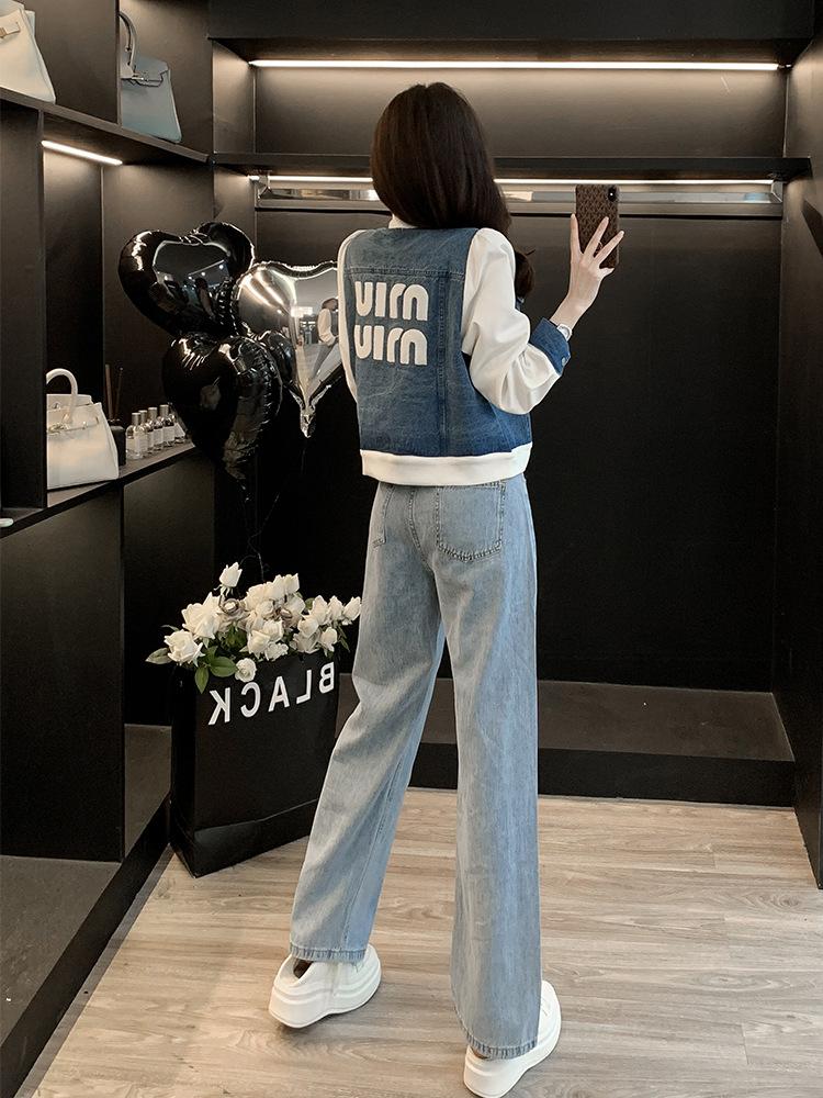 Conjunto de ropa deportiva de moda para mujer, otoño 2023, costuras de color en contraste, abrigo vaquero de manga larga, ropa de mujer de dos piezas