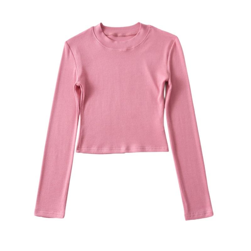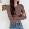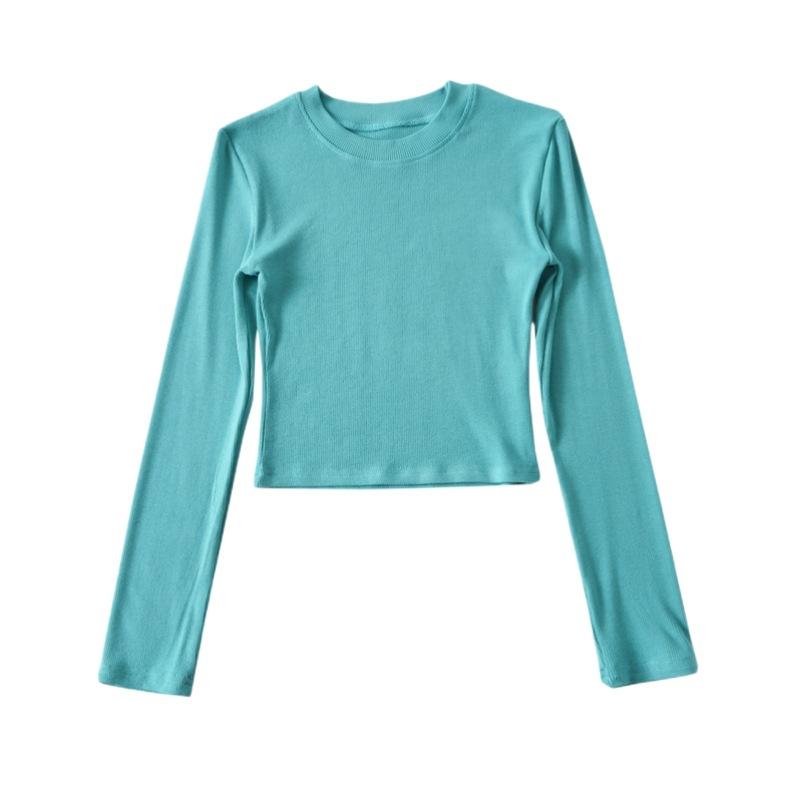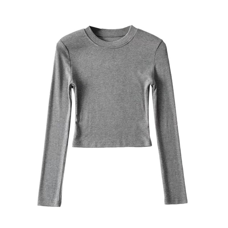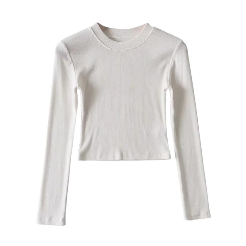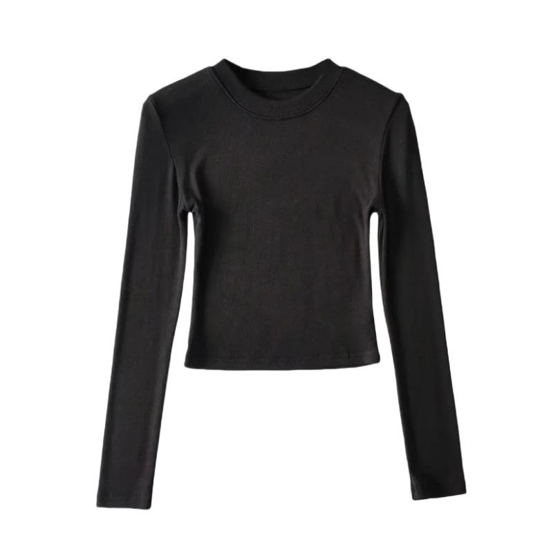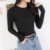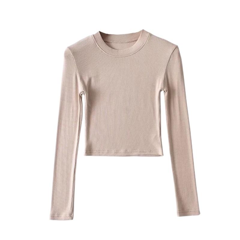 Camiseta ajustada elástica de cuello redondo pequeño estilo europeo y americano, nueva primavera de 2023, camisa de manga larga con cintura alta y escote pronunciado en color liso.