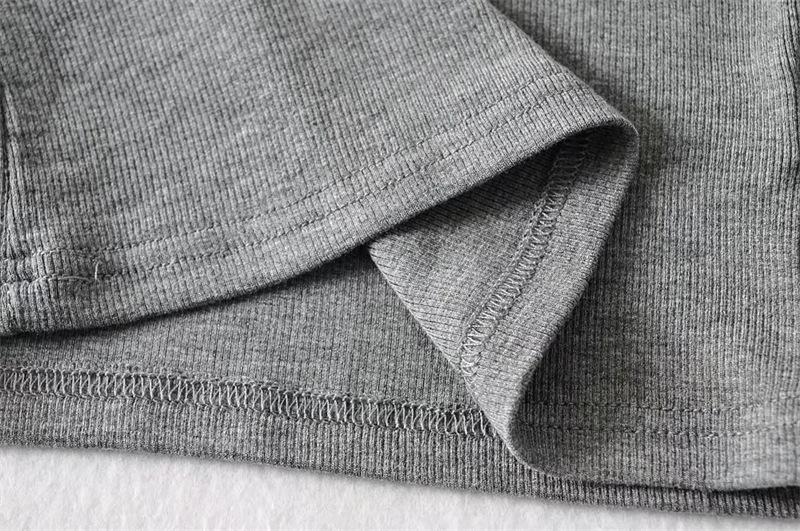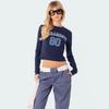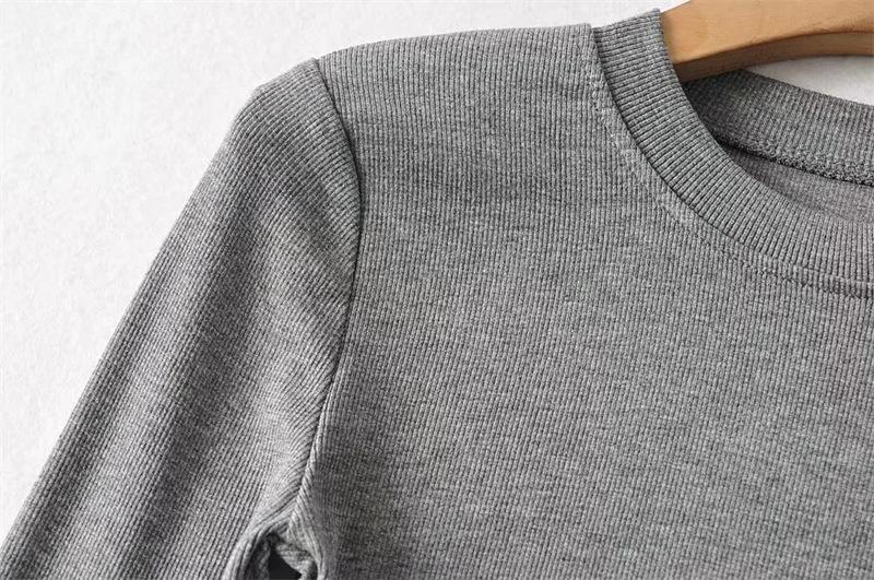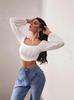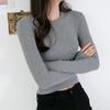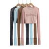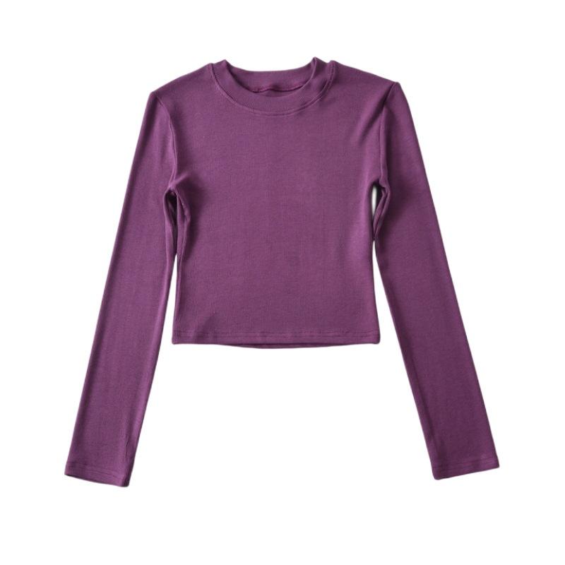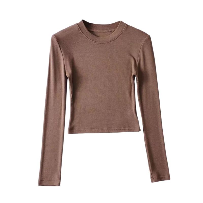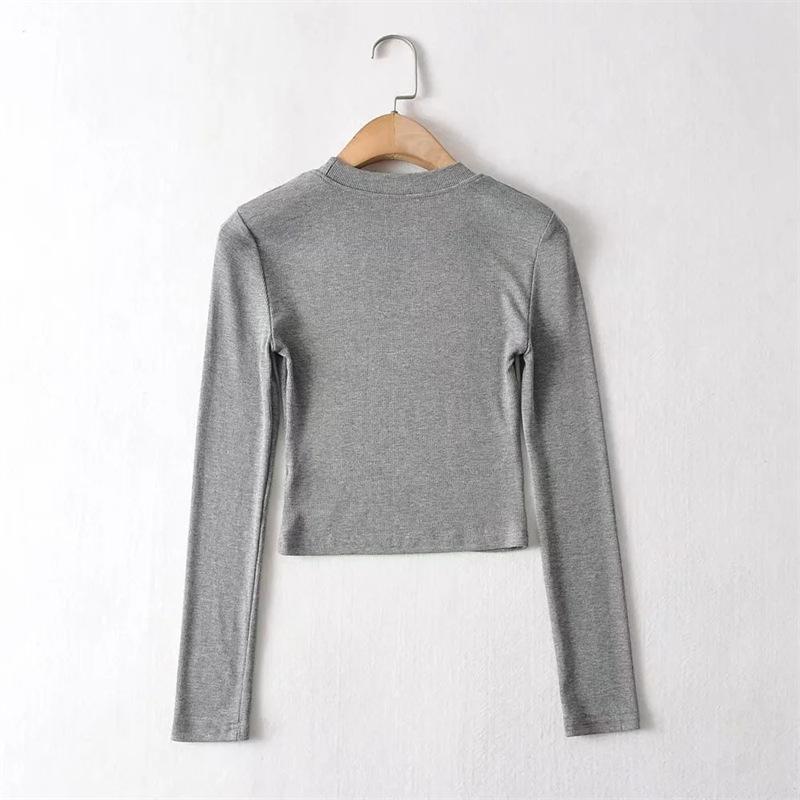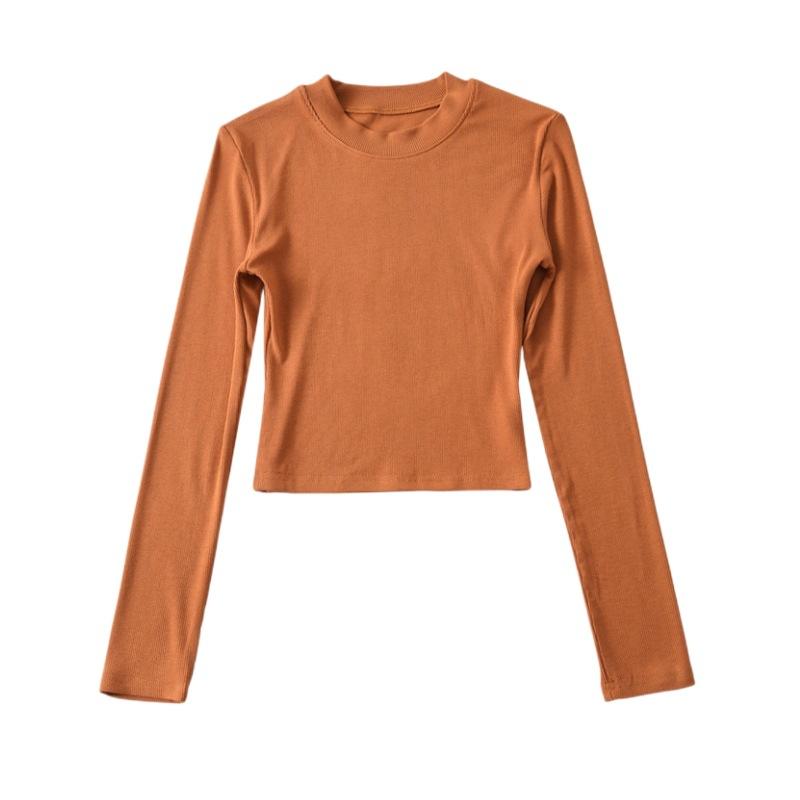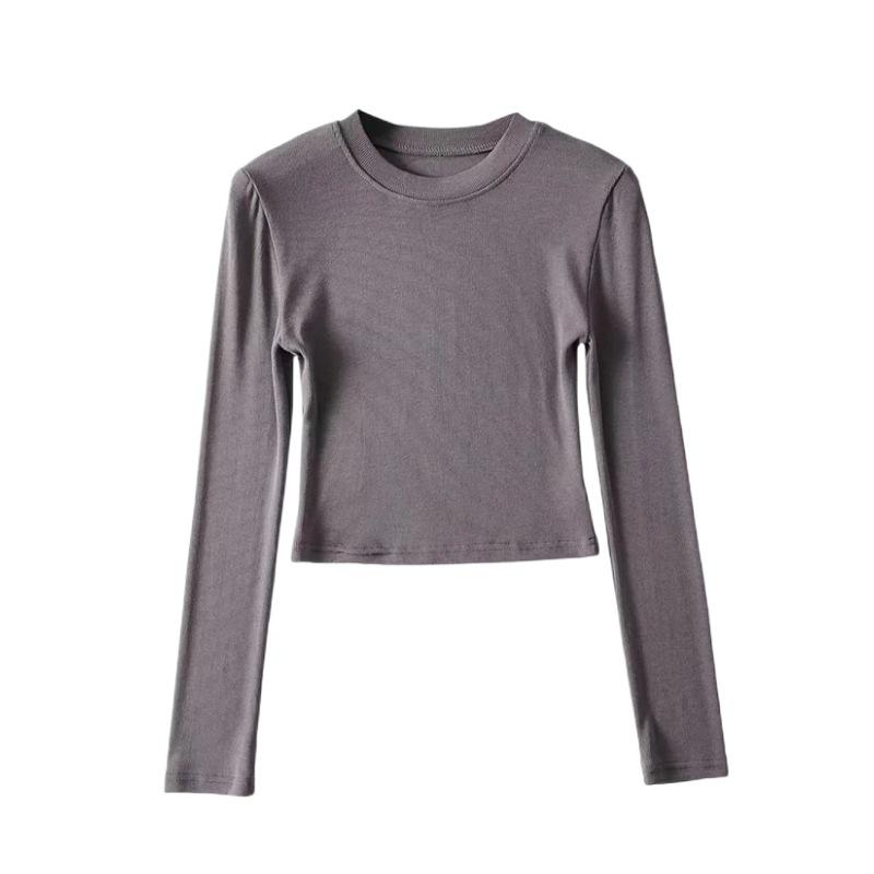 Camiseta ajustada elástica de cuello redondo pequeño estilo europeo y americano, nueva primavera de 2023, camisa de manga larga con cintura alta y escote pronunciado en color liso.