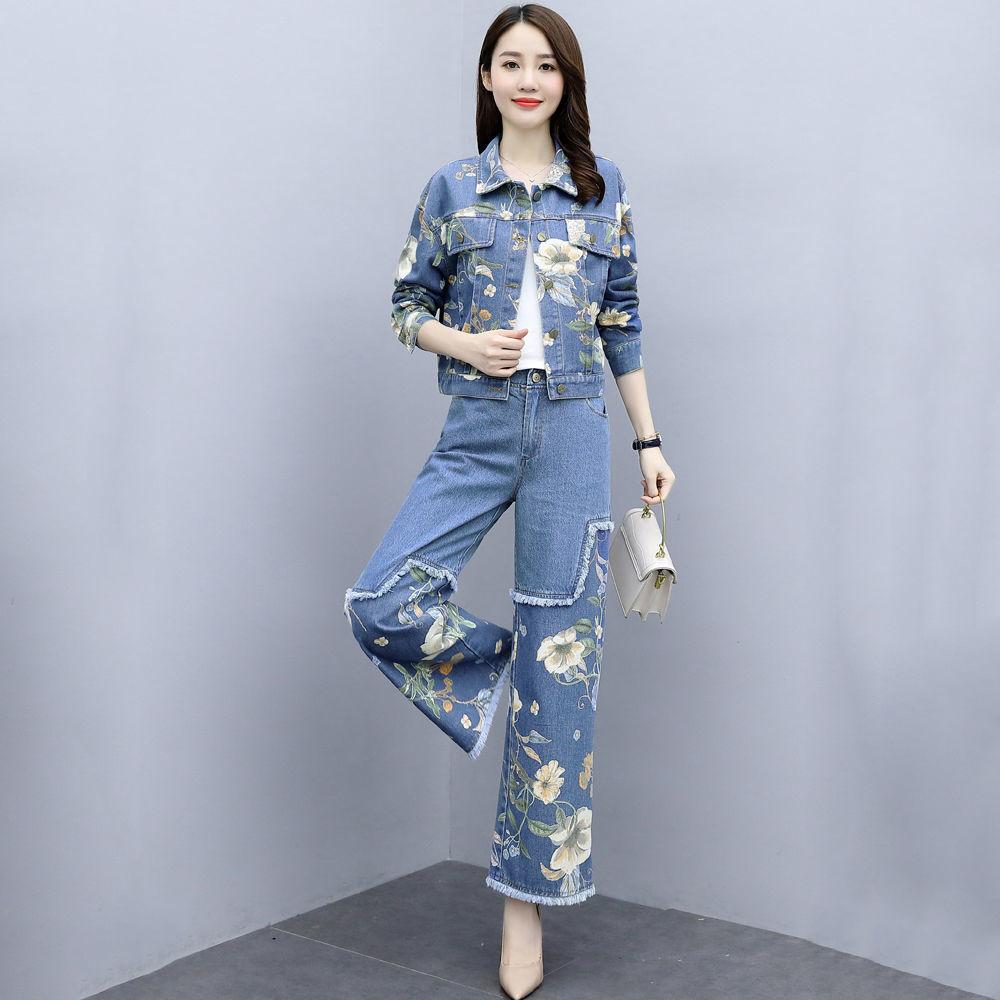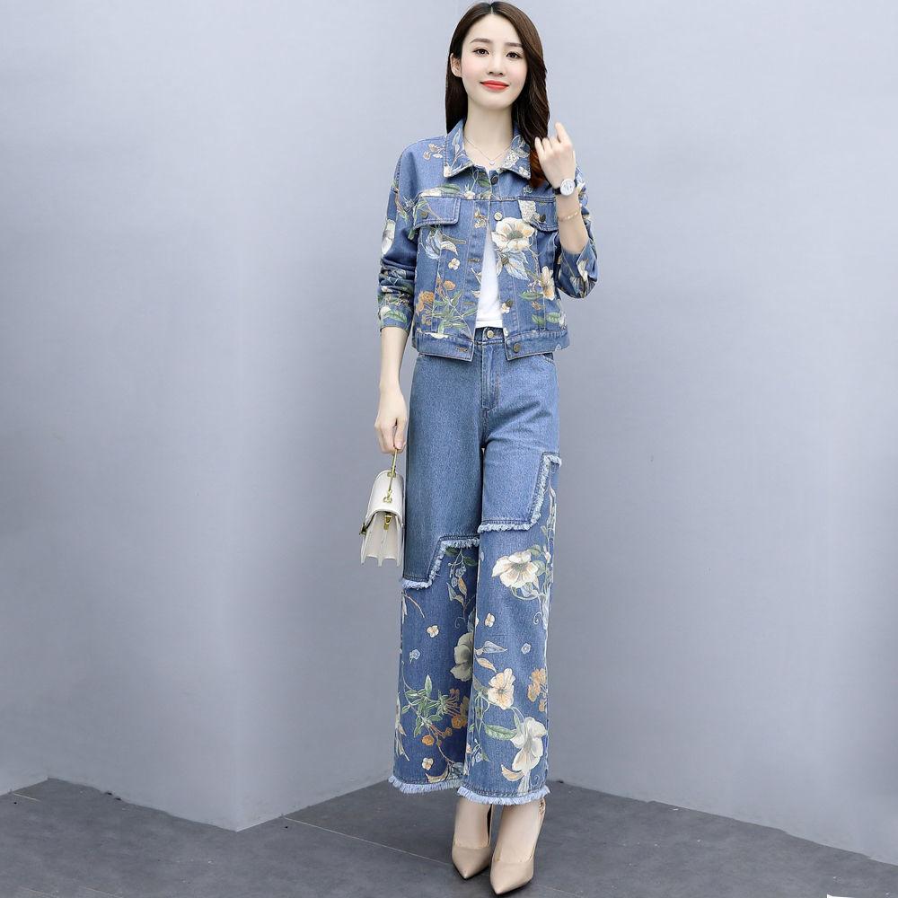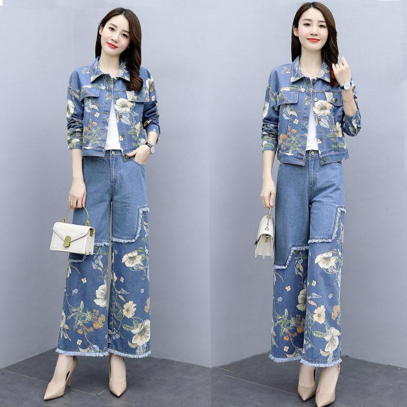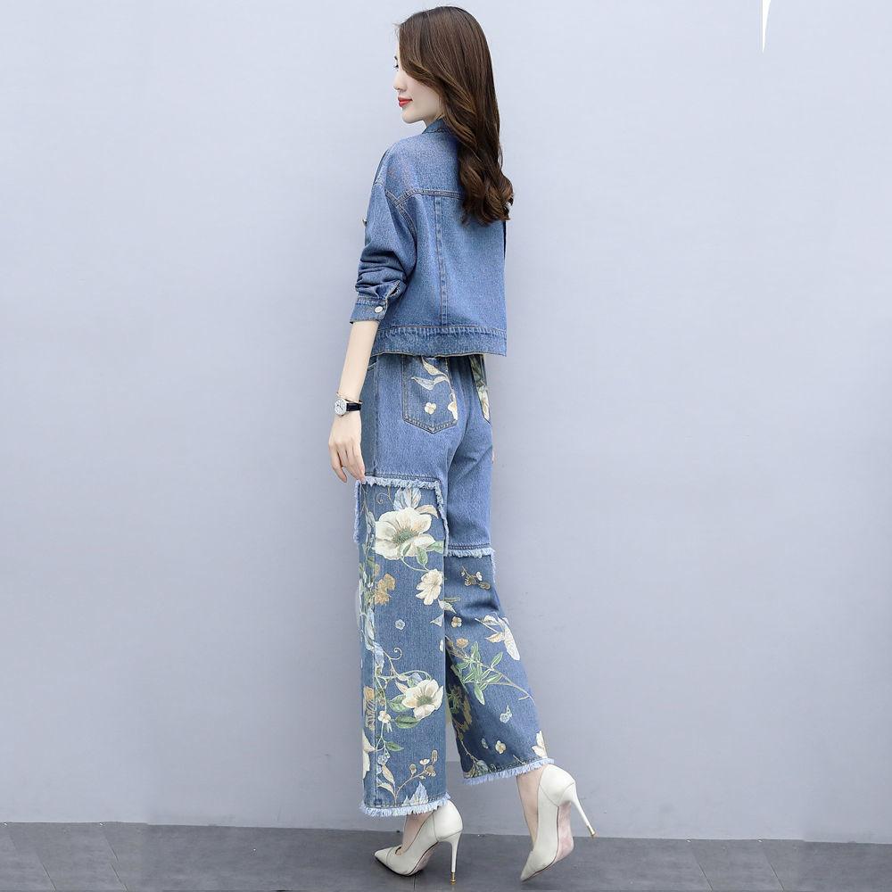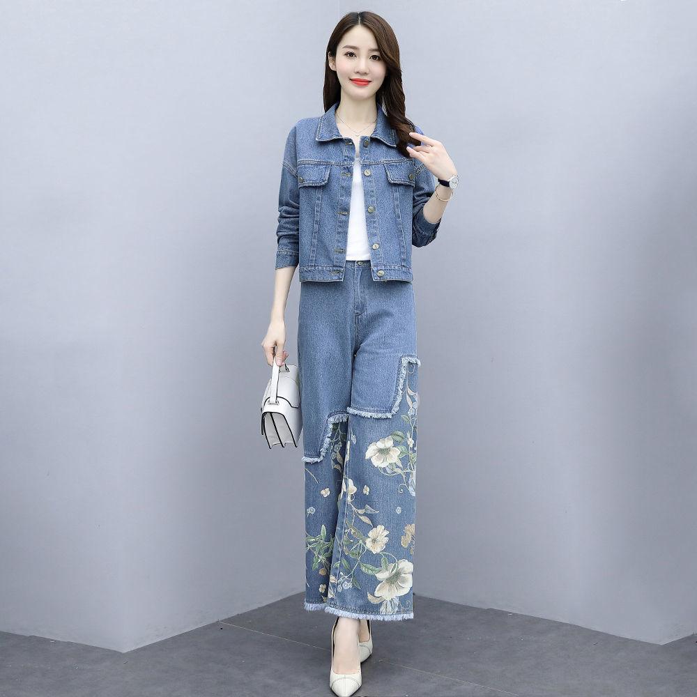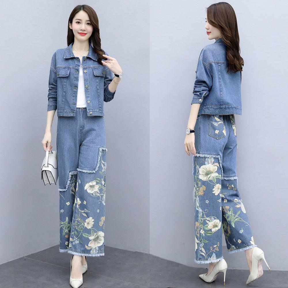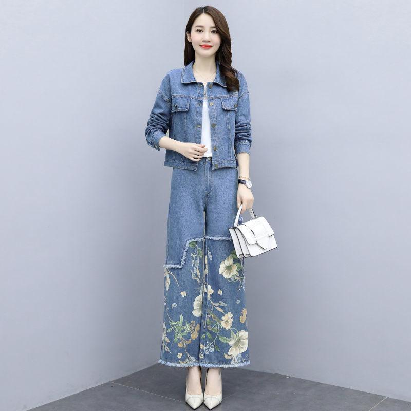 Abrigo corto vaquero retro de estilo Hong Kong de talla grande de moda europea, pantalones de pierna ancha de dos piezas para mujer, otoño 2020, nuevo, ajustado