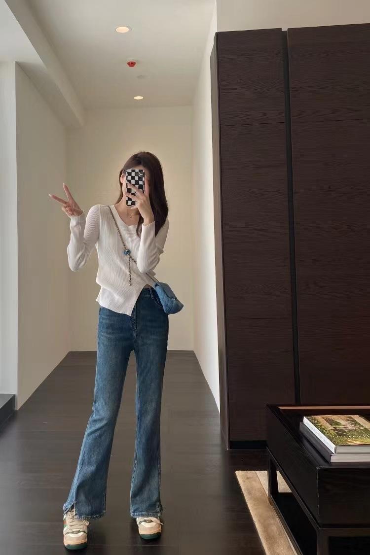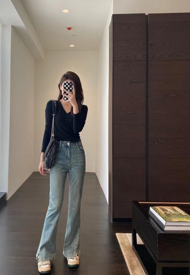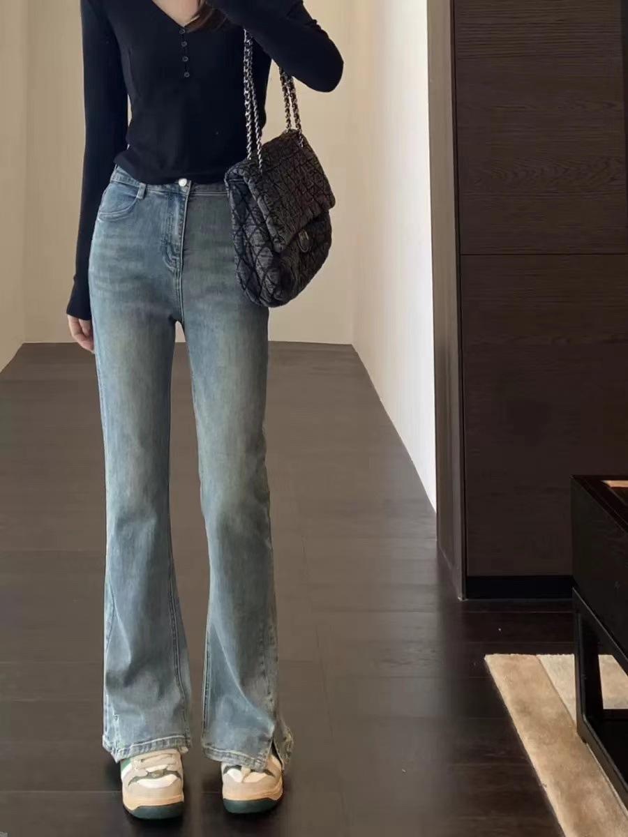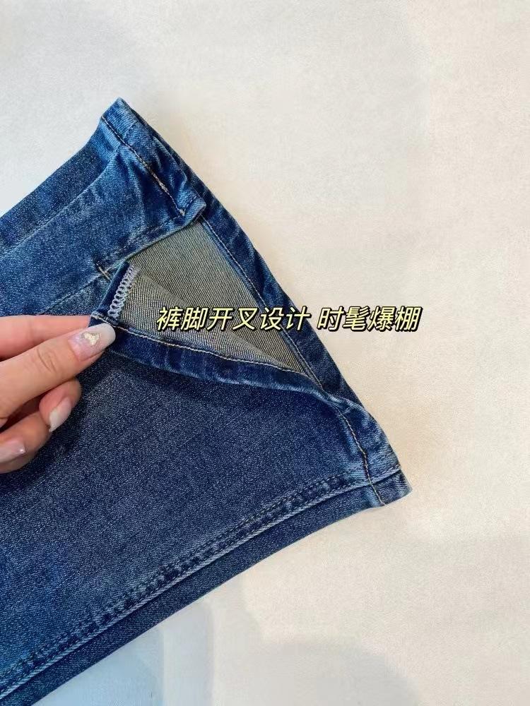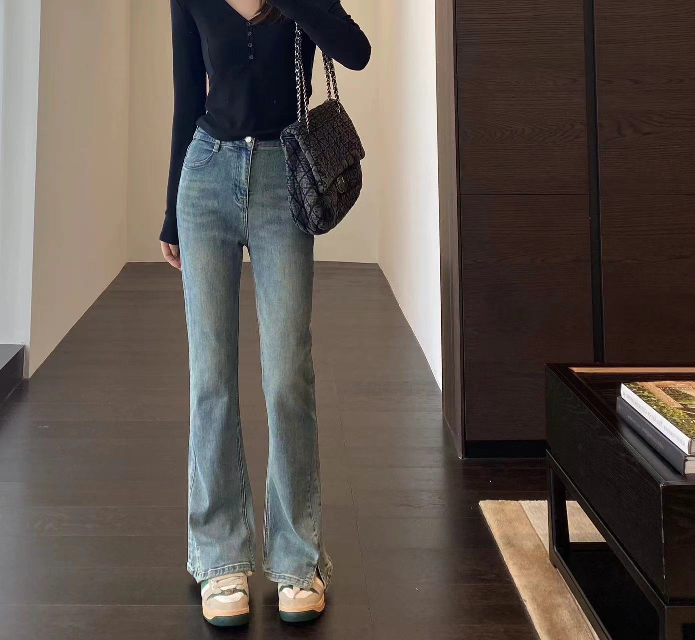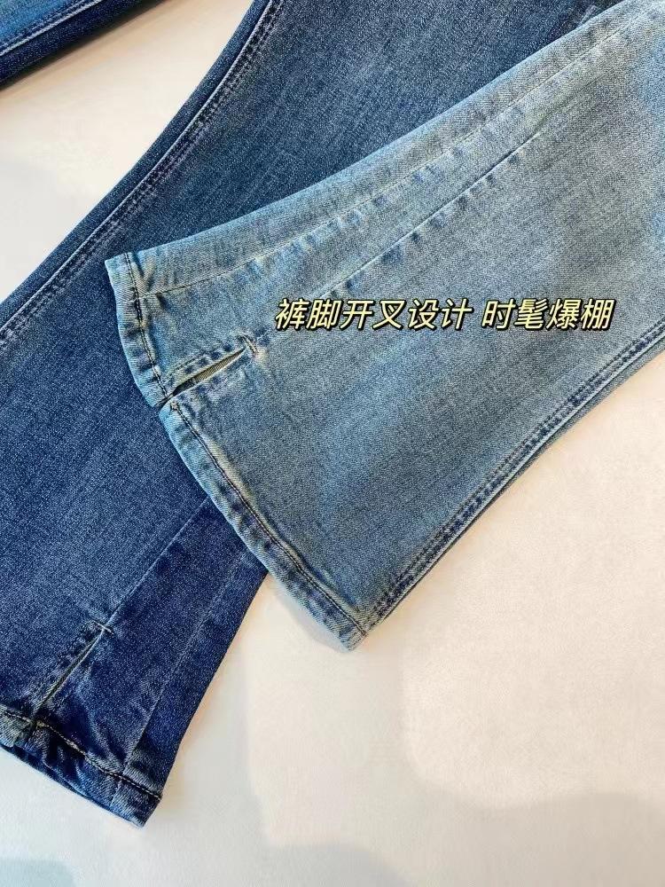 Las perneras de pantalón con aberturas ligeramente acampanadas son el punto culminante de todo el pantalón, de moda e individual.