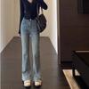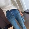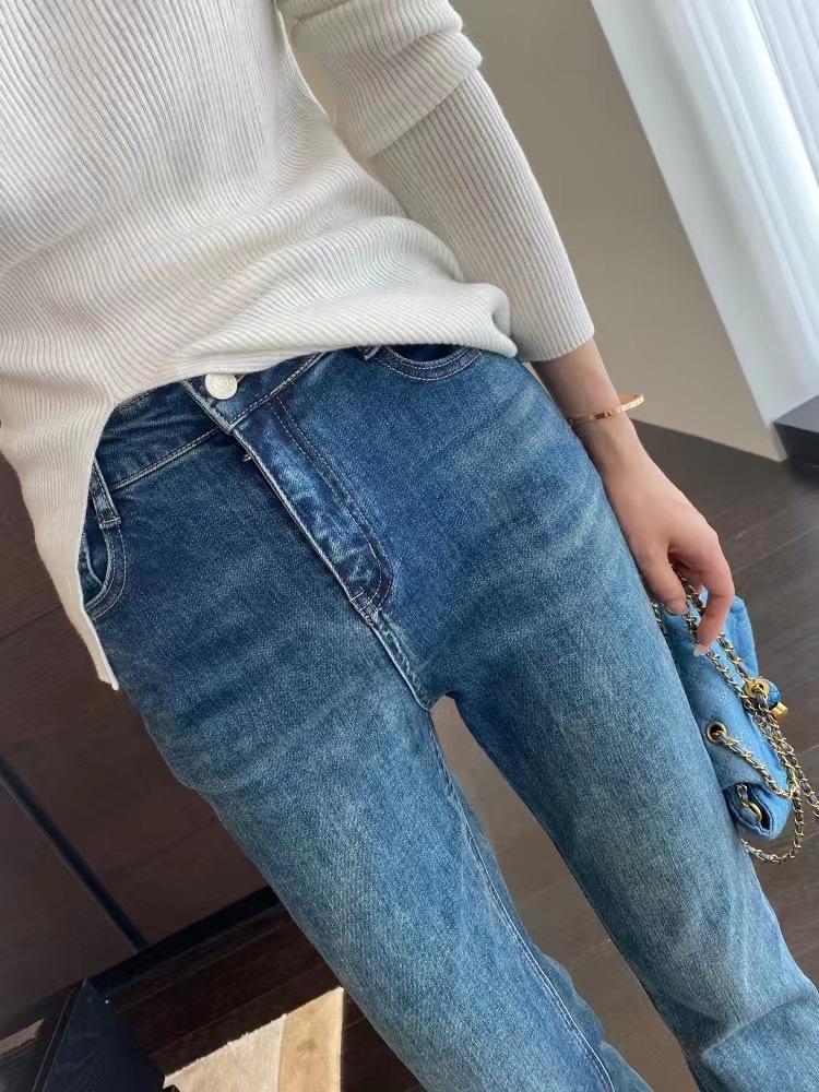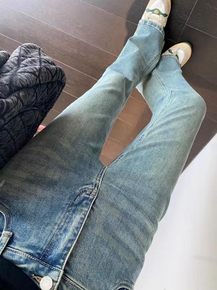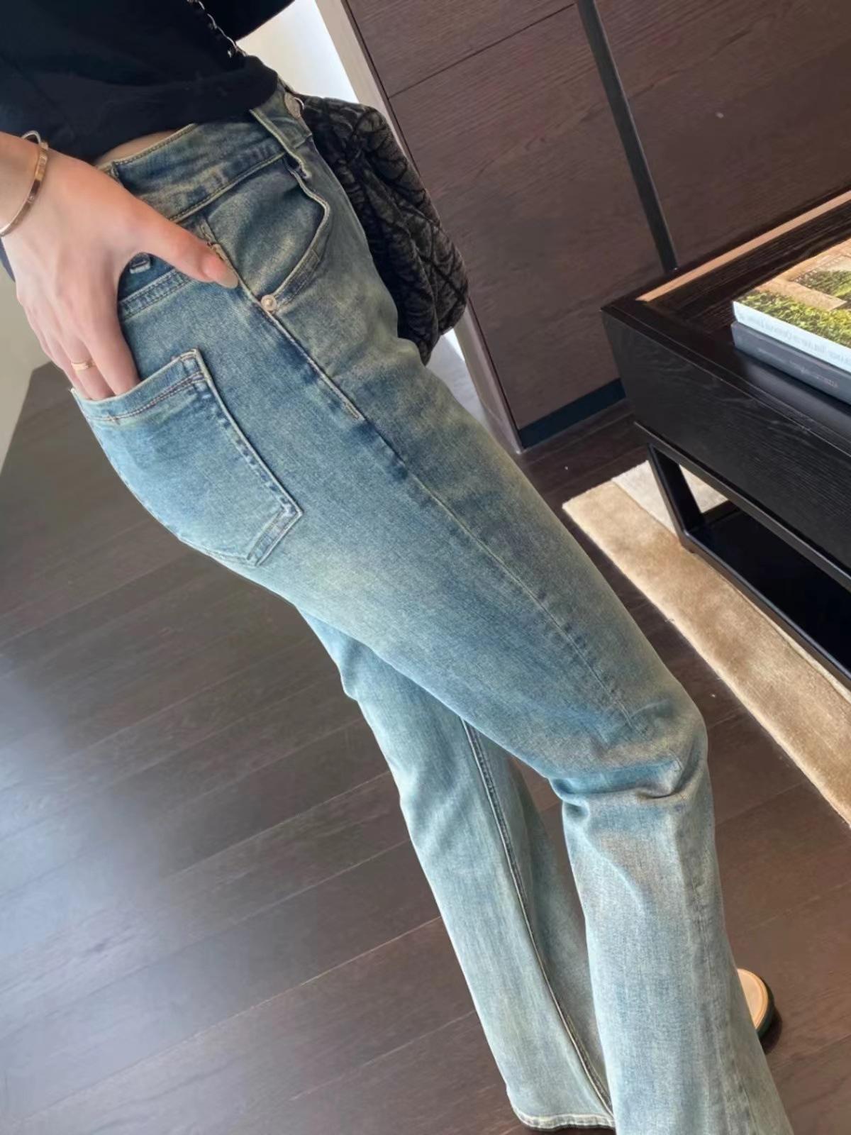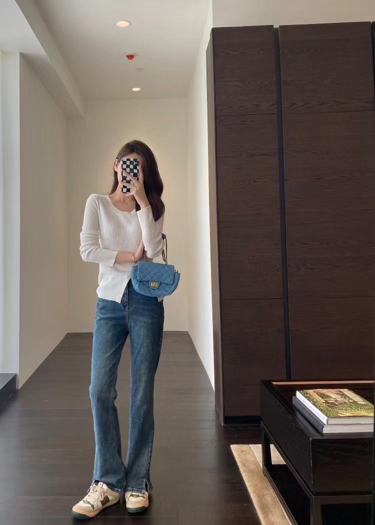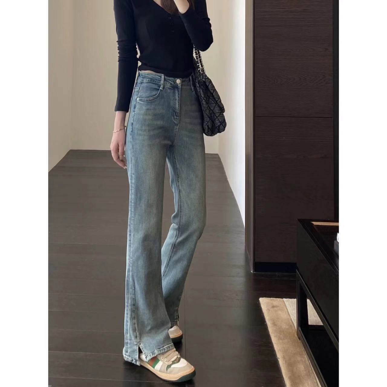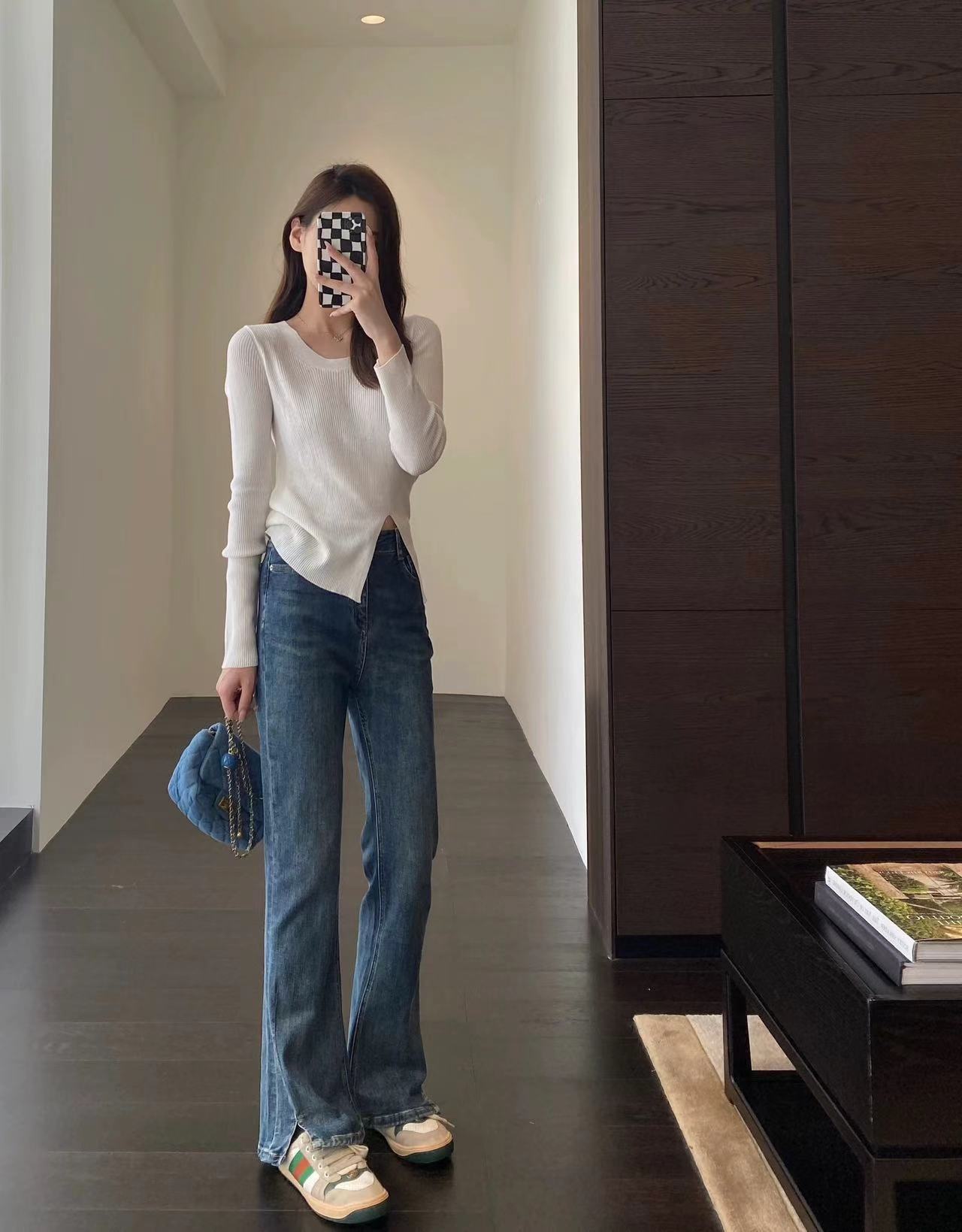 Las perneras de pantalón con aberturas ligeramente acampanadas son el punto culminante de todo el pantalón, de moda e individual.