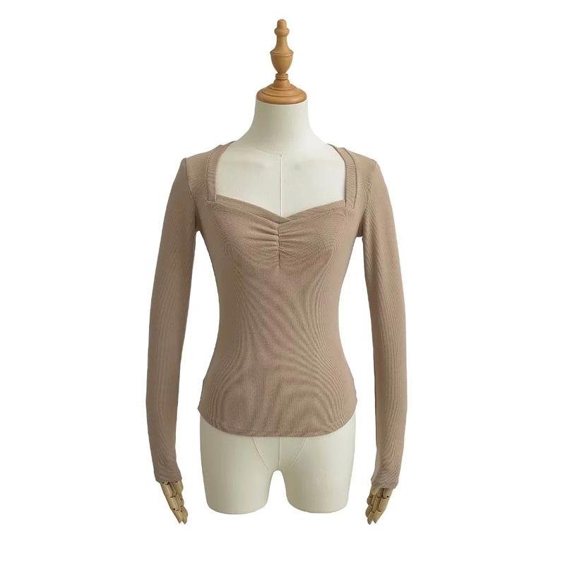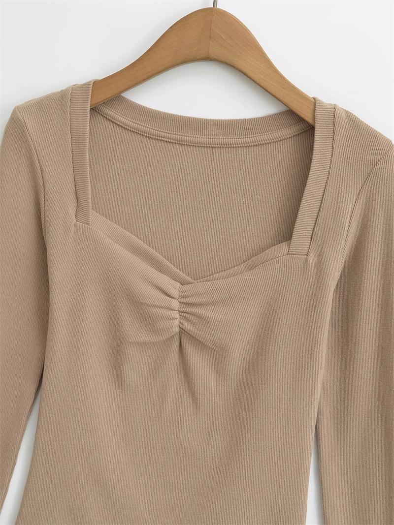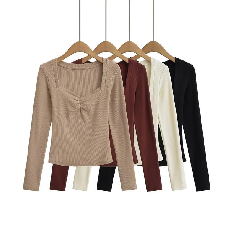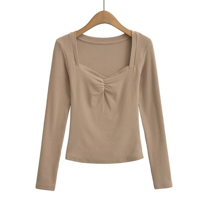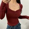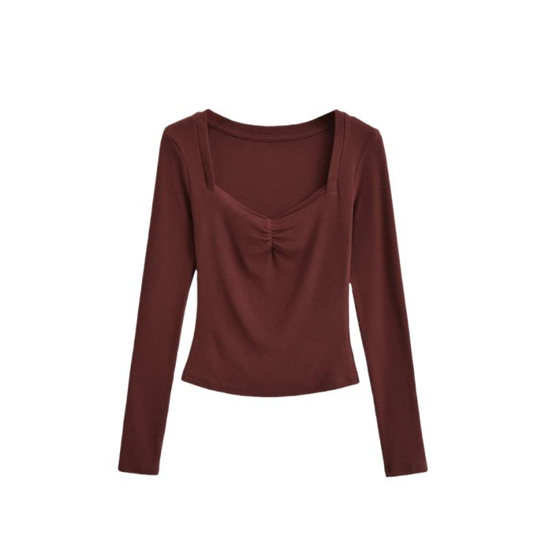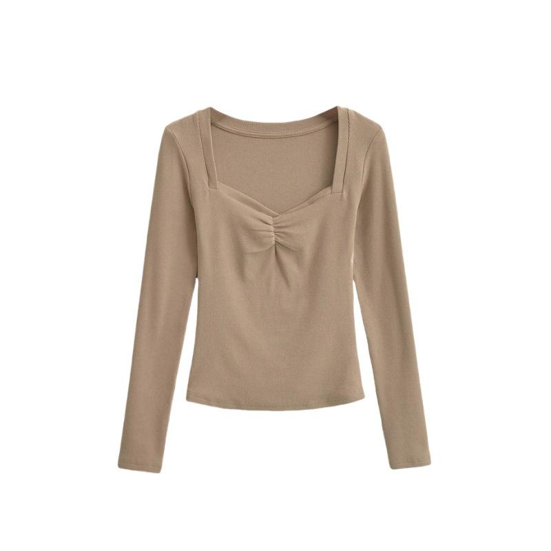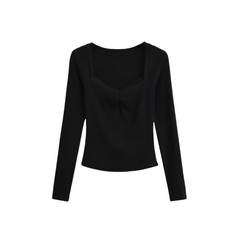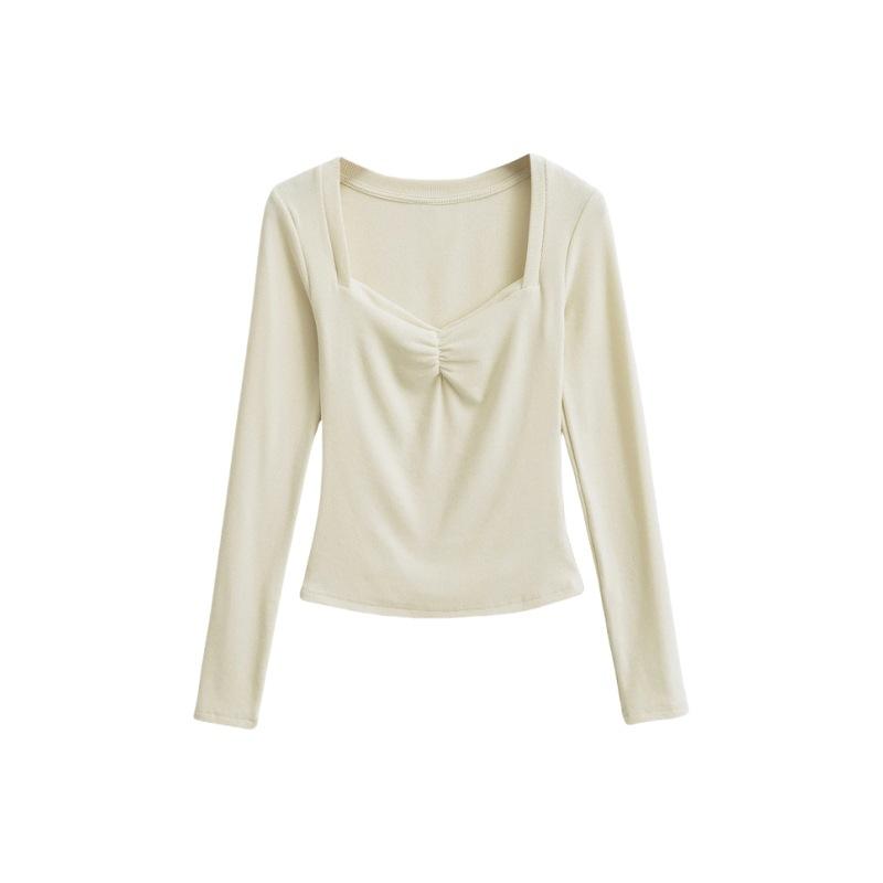 Camiseta de manga larga plisada en el pecho con cuello cuadrado estilo Pure Desire para mujer, estilo francés, estilo retro, dobladillo ajustado, curvado.
