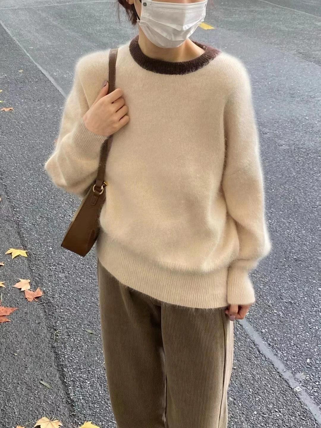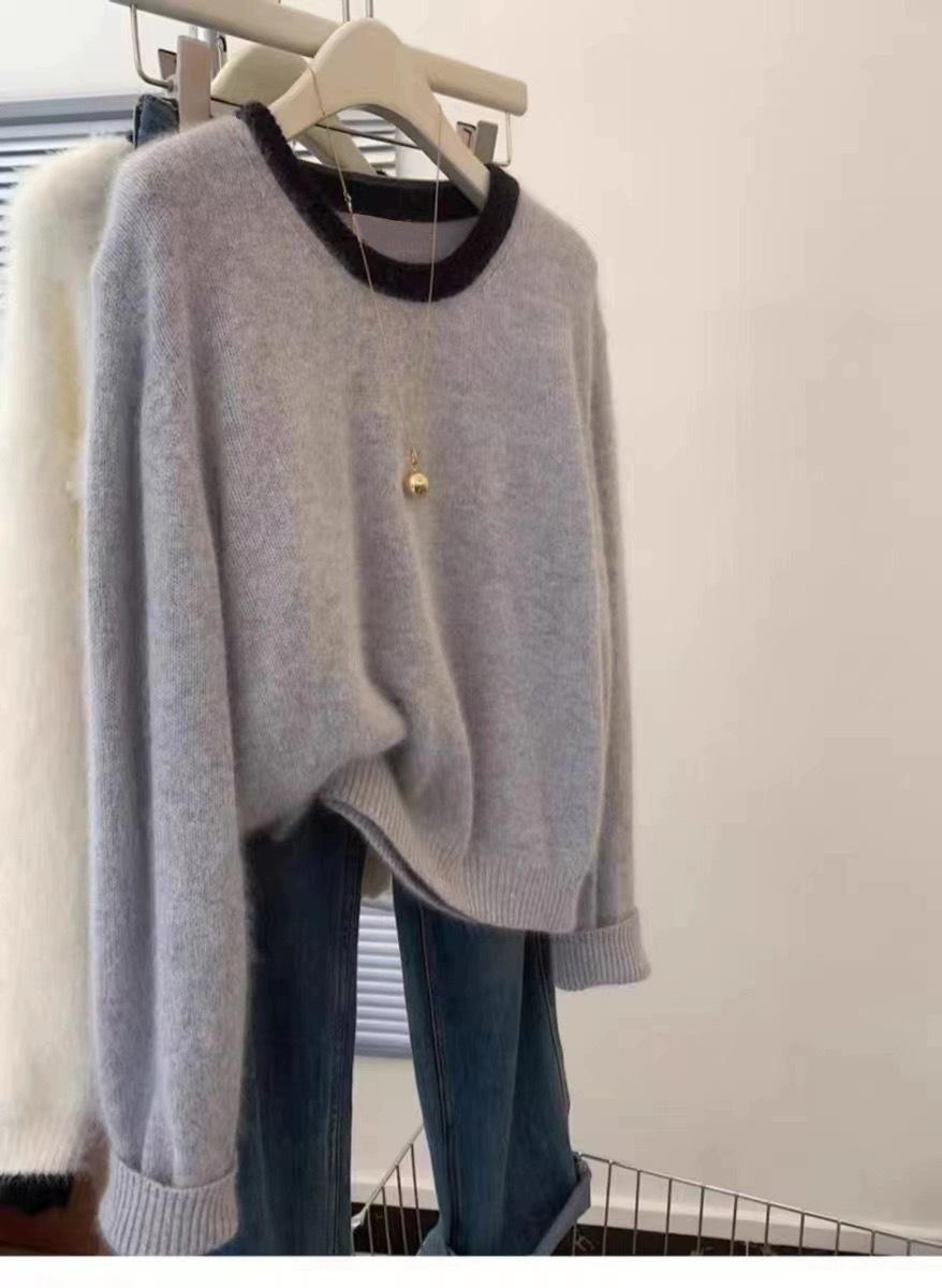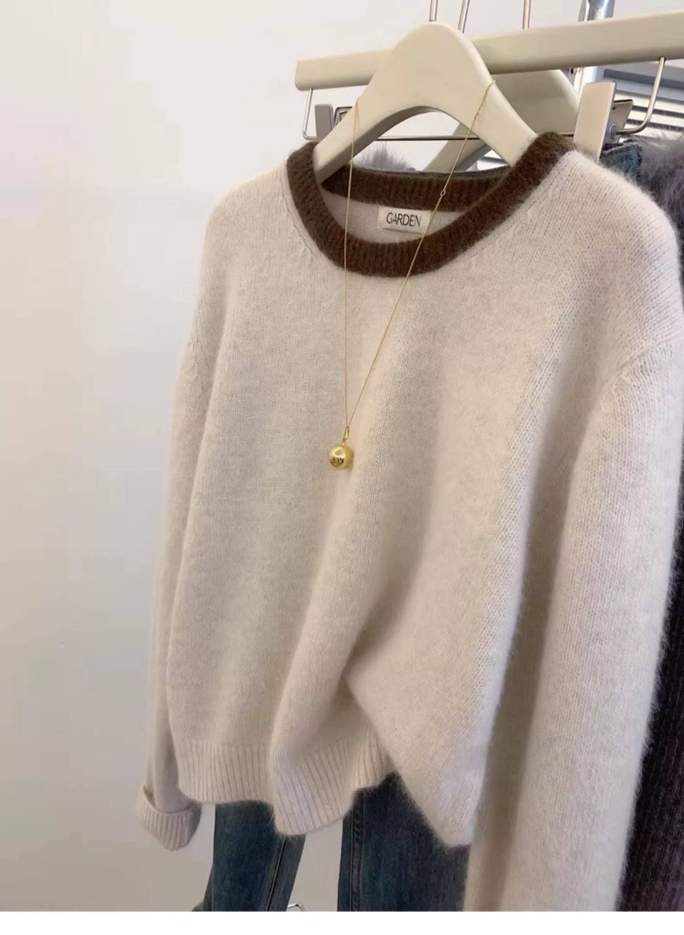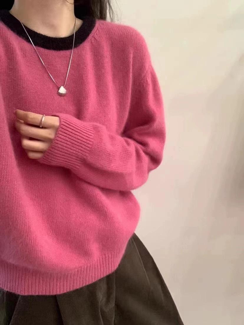 Versión coreana del nuevo suéter grueso de otoño e invierno 2024 para mujer, suéter de base de cachemira en contraste con cuello redondo, suéter al por mayor