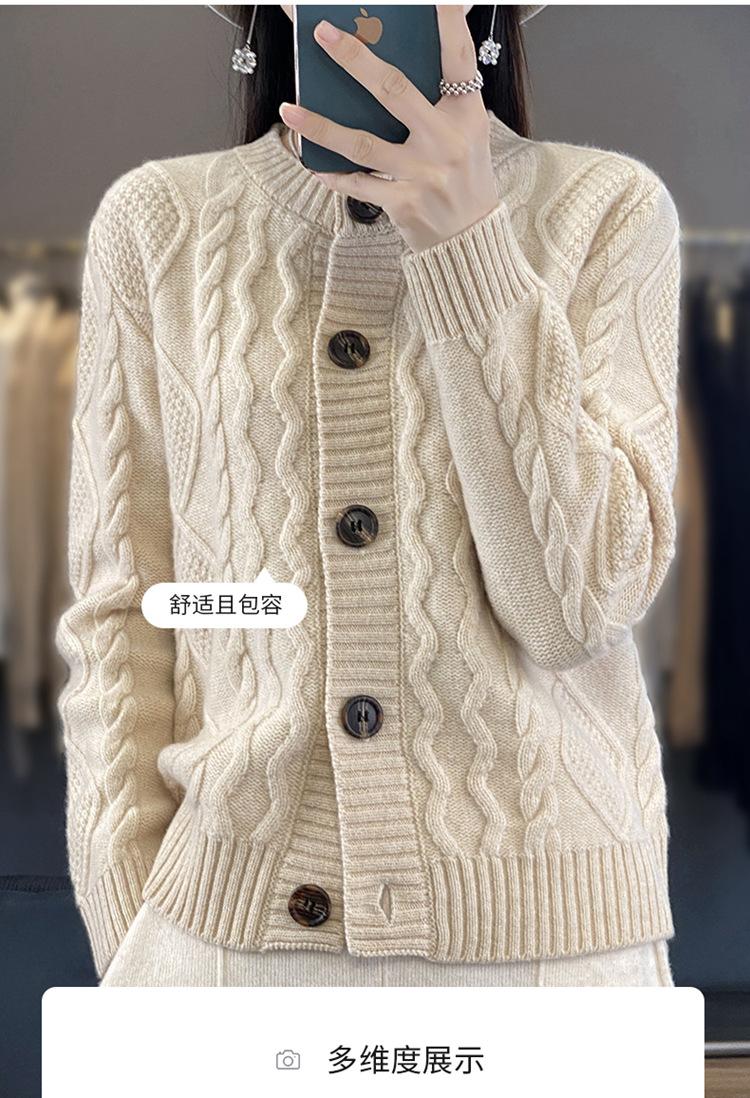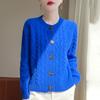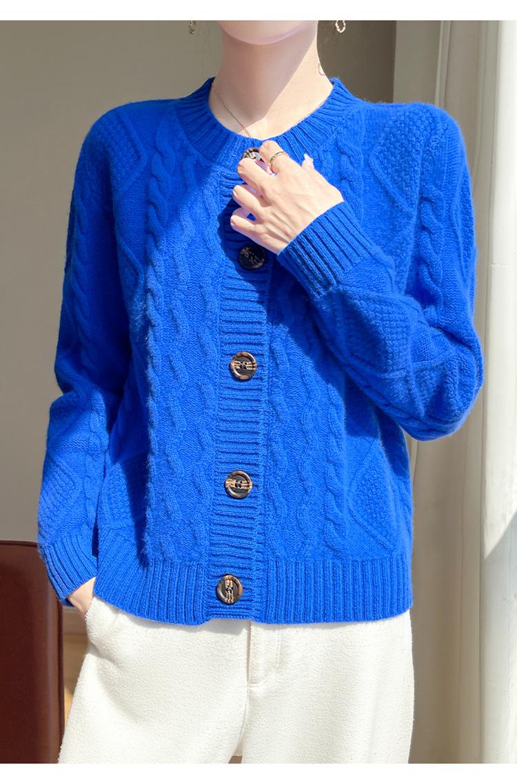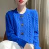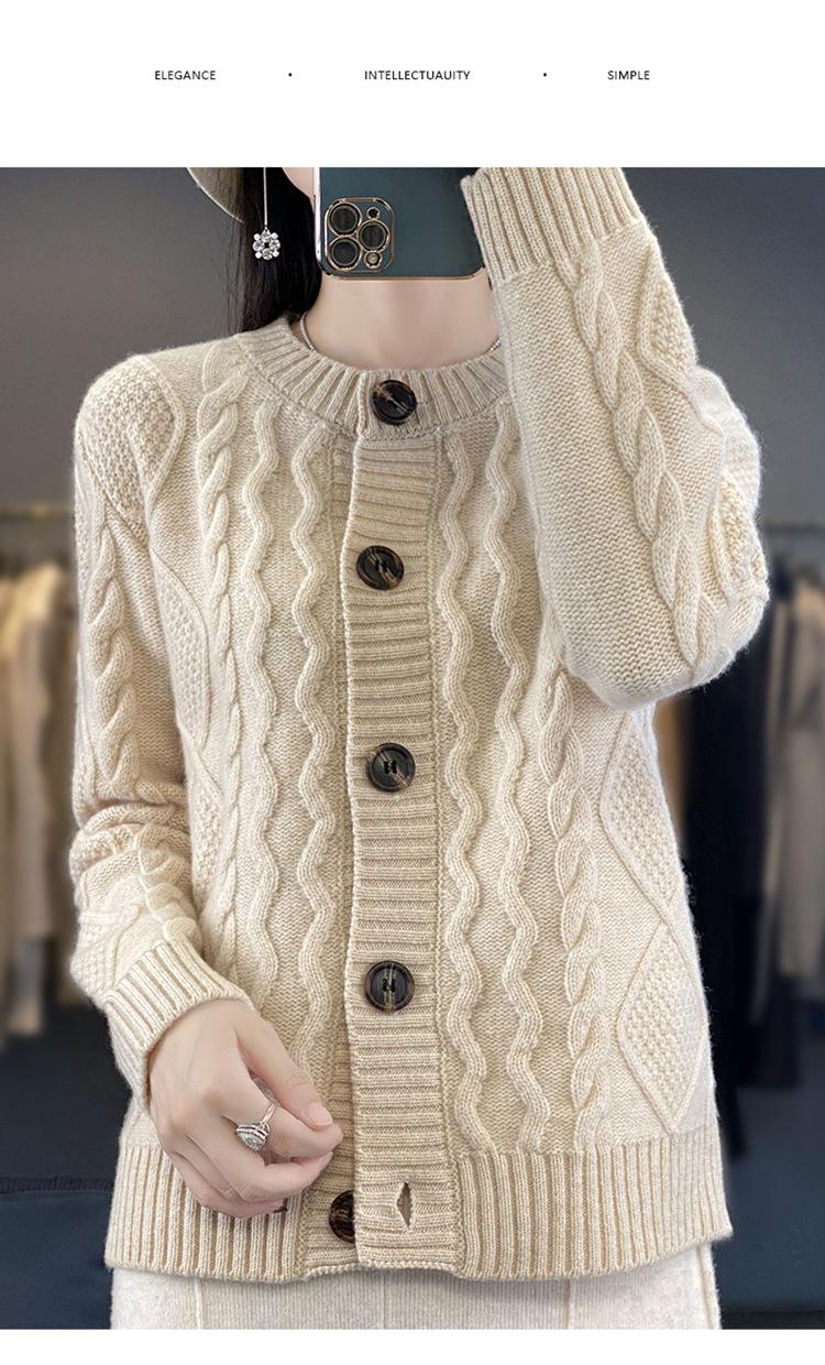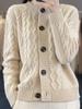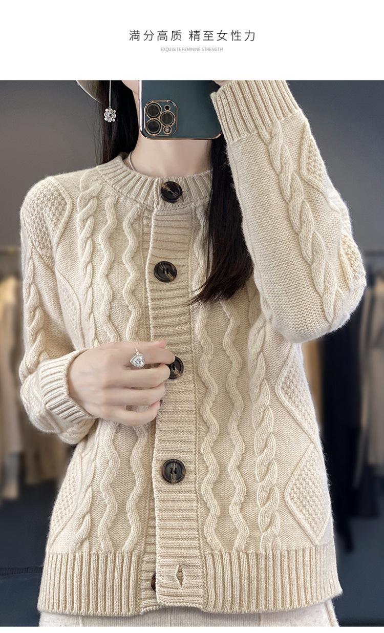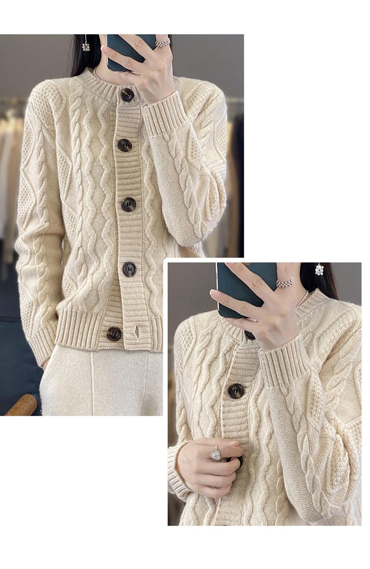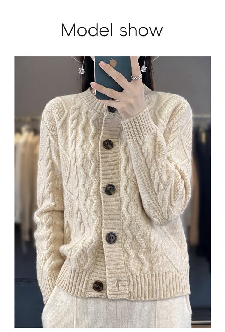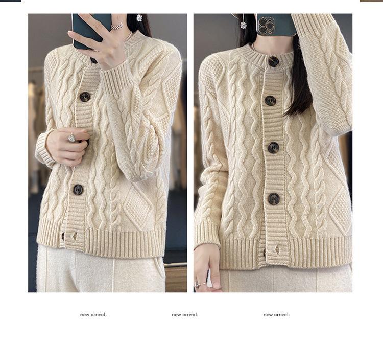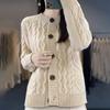 Cárdigan de lana de color liso con cuello redondo grueso para mujer, suéter de punto de lana con abrigo trenzado vintage, otoño e invierno, nuevo