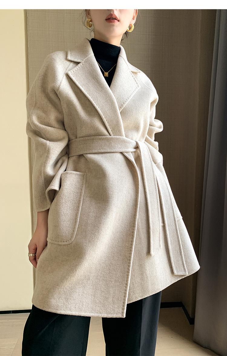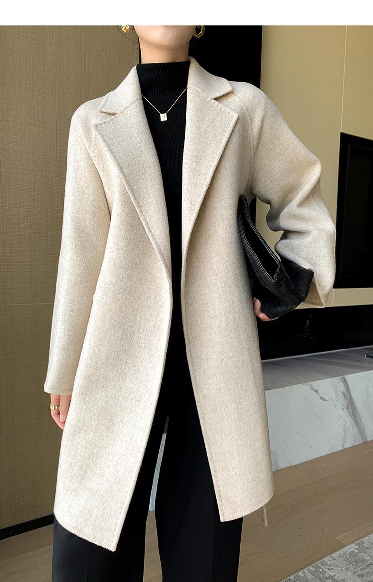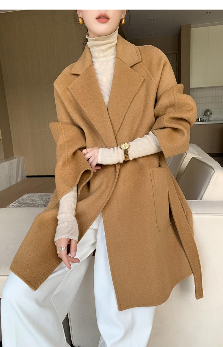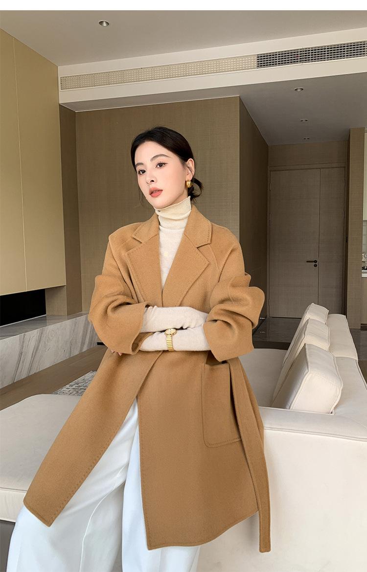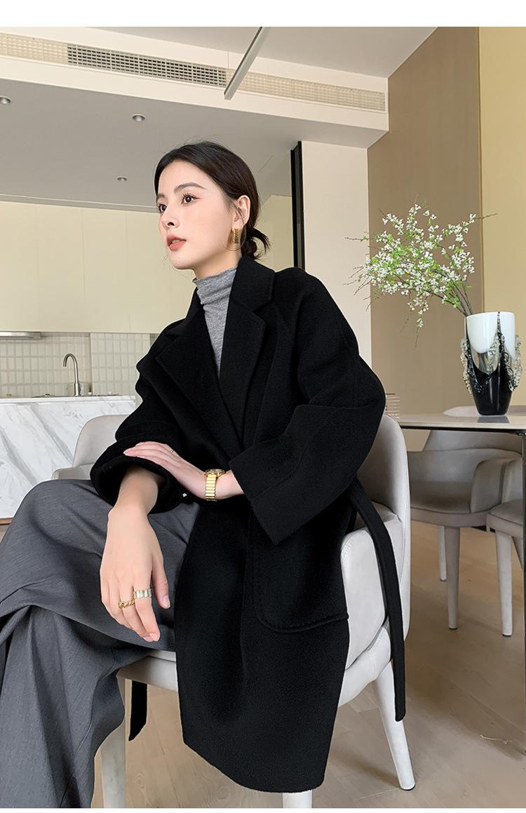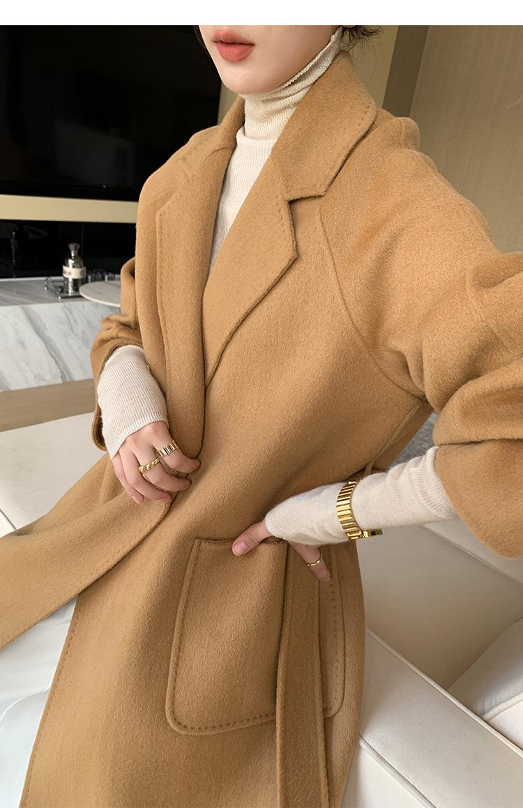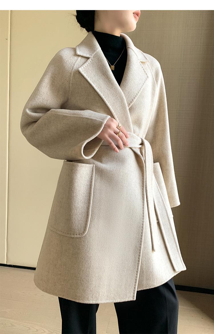 Abrigo de lana de doble cara de alta gama para mujer, otoño e invierno, nuevo, holgado, de longitud media, con cordones, 100% lana, abrigo de lana de moda