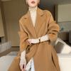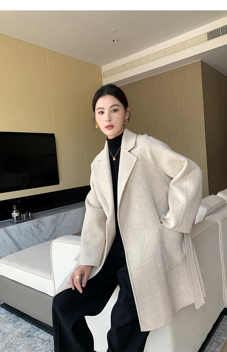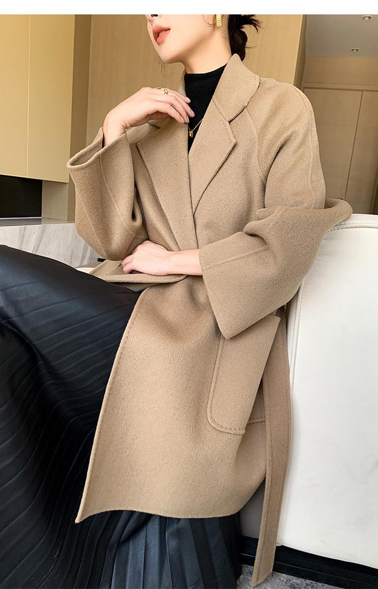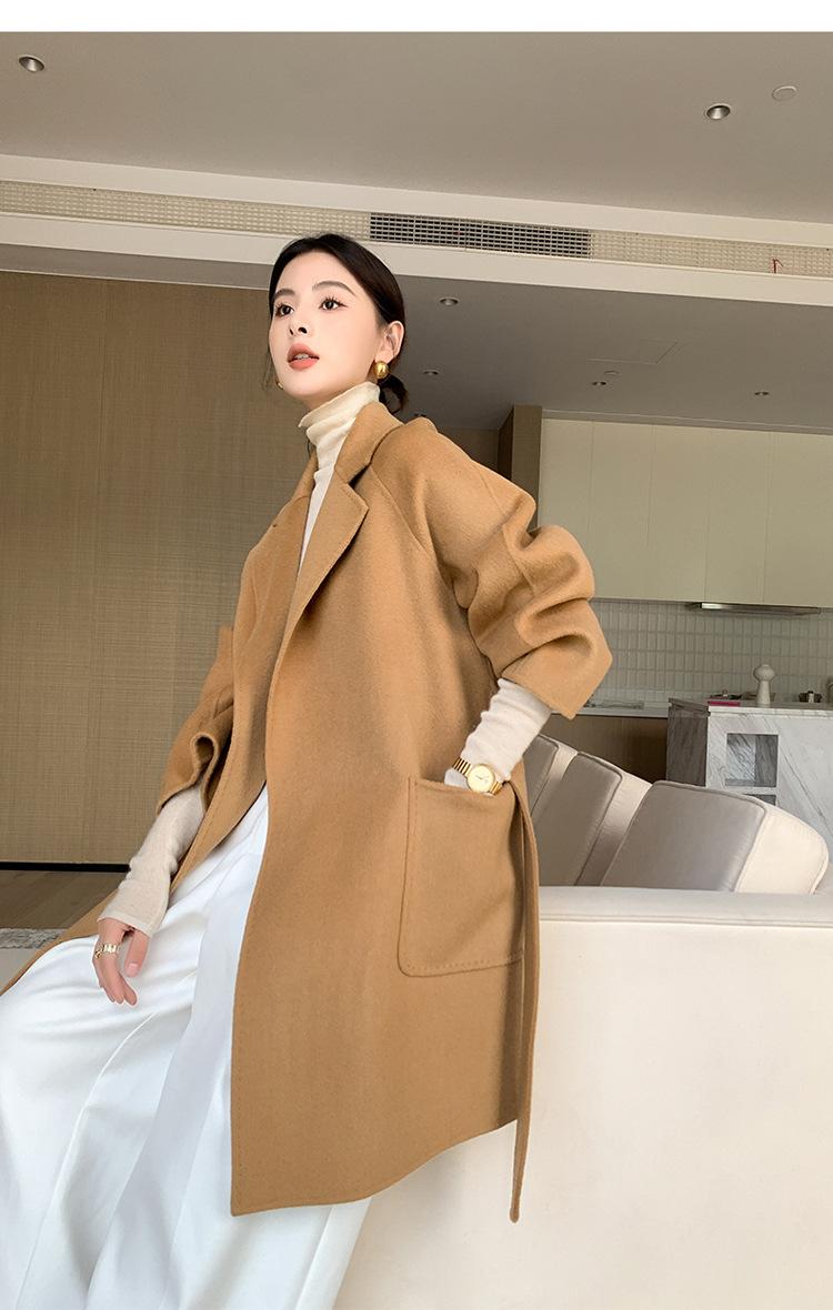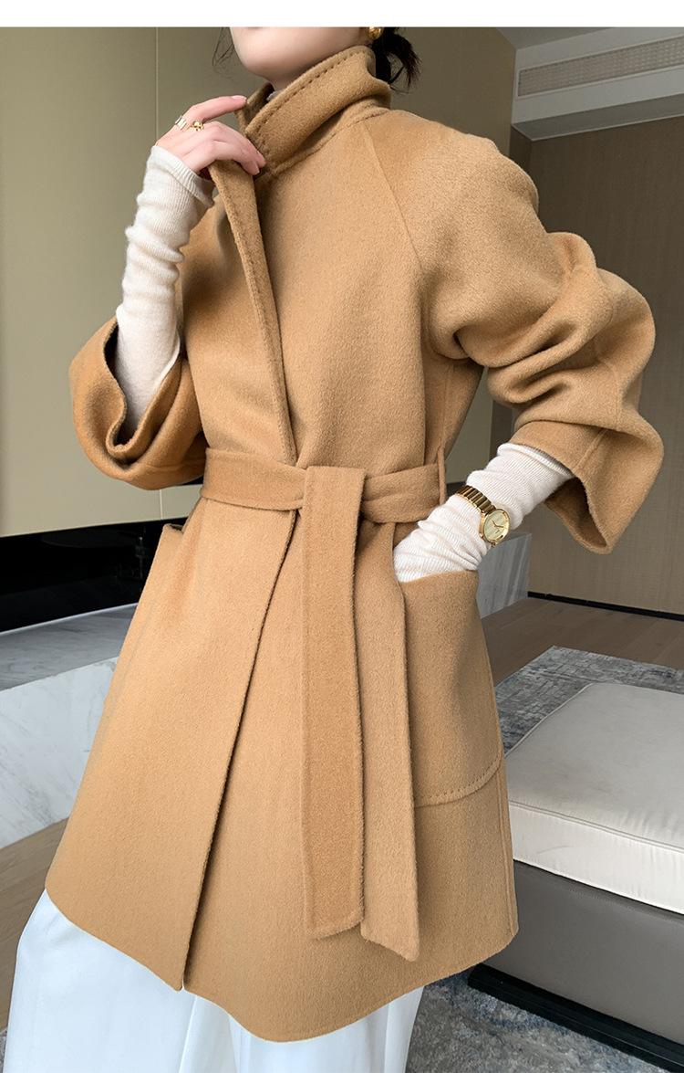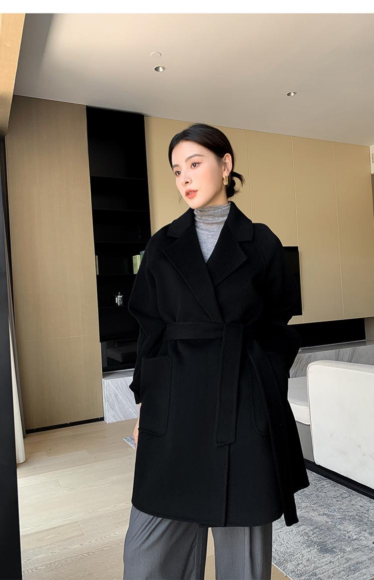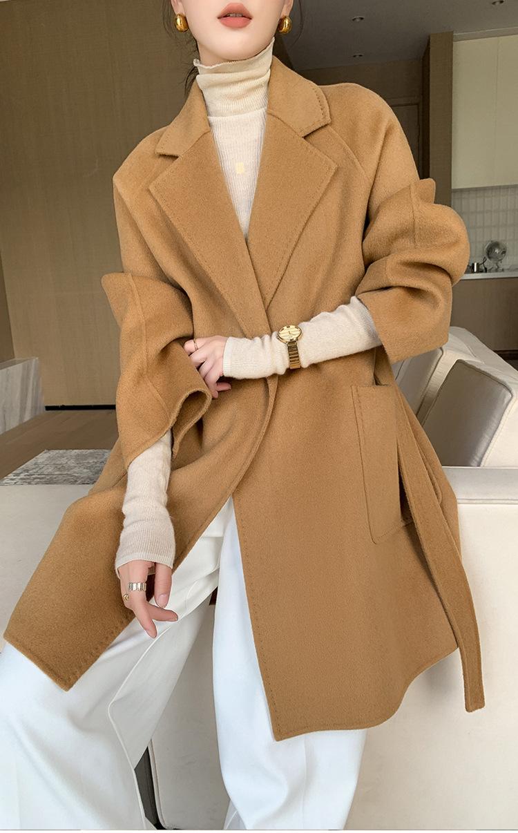 Abrigo de lana de doble cara de alta gama para mujer, otoño e invierno, nuevo, holgado, de longitud media, con cordones, 100% lana, abrigo de lana de moda