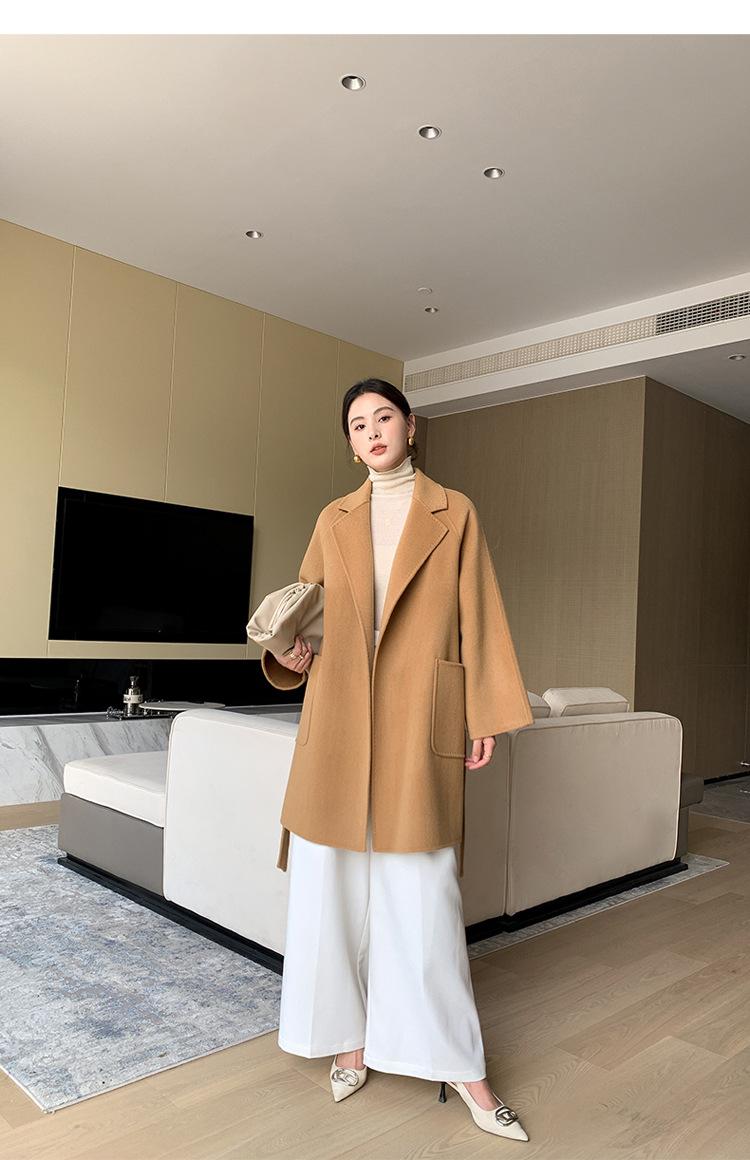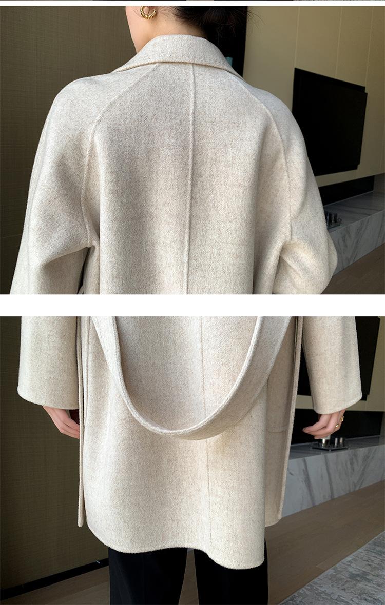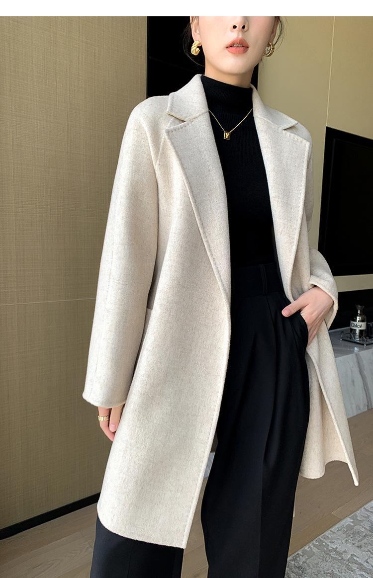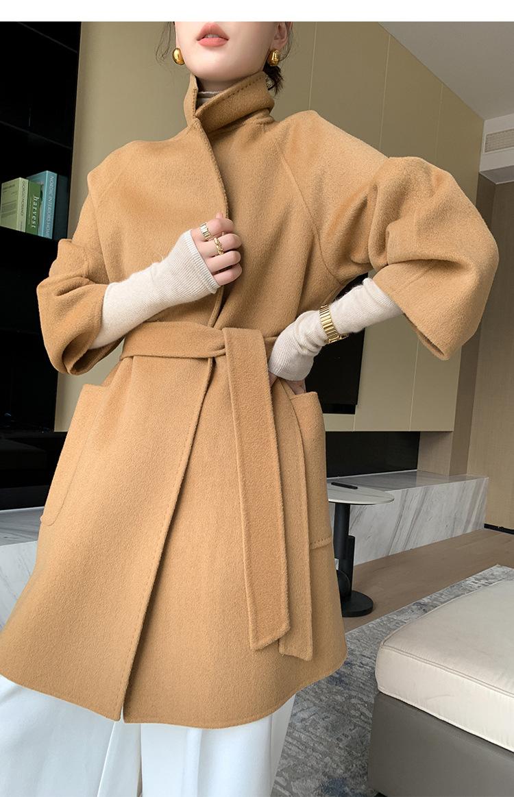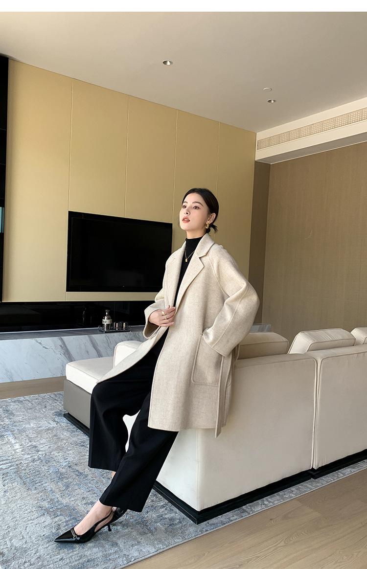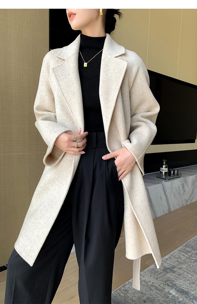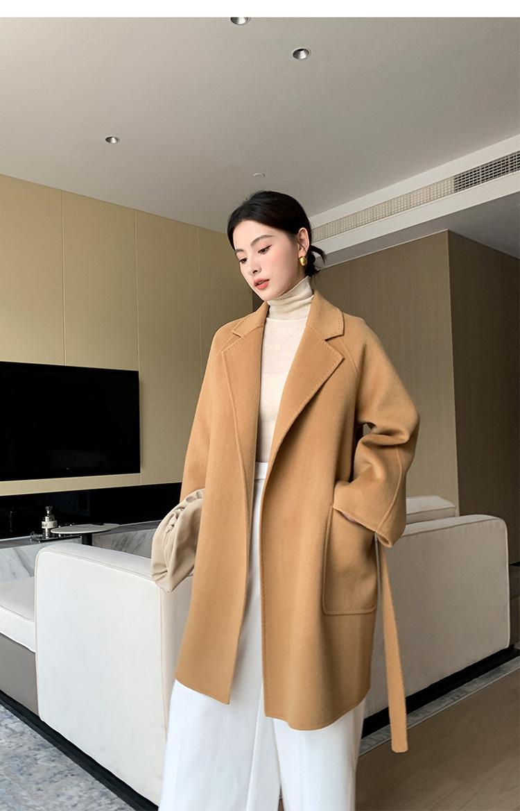 Abrigo de lana de doble cara de alta gama para mujer, otoño e invierno, nuevo, holgado, de longitud media, con cordones, 100% lana, abrigo de lana de moda