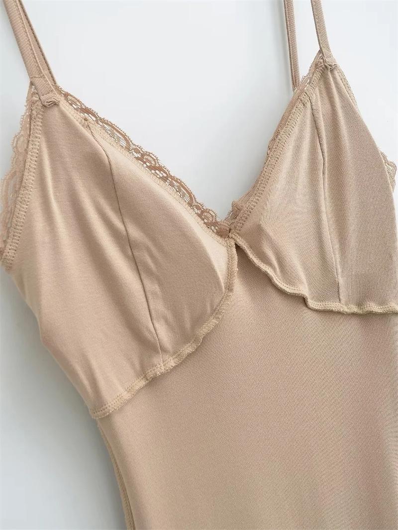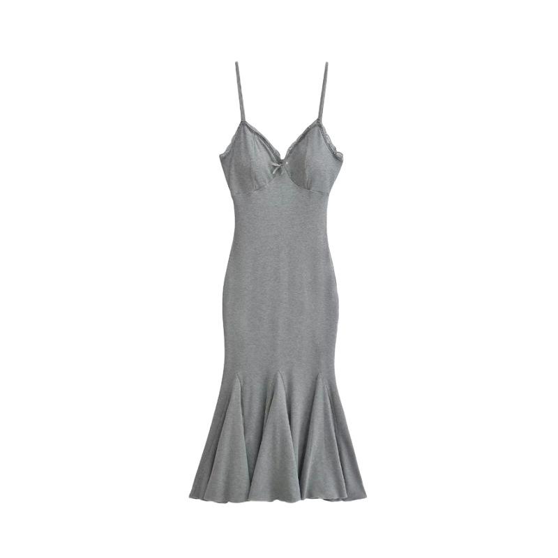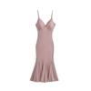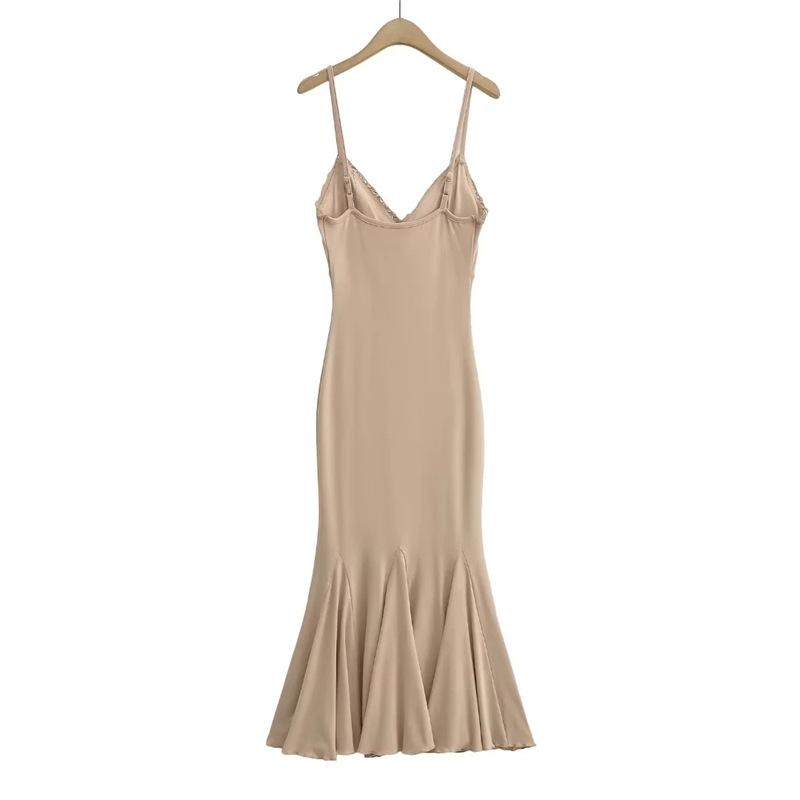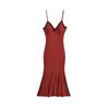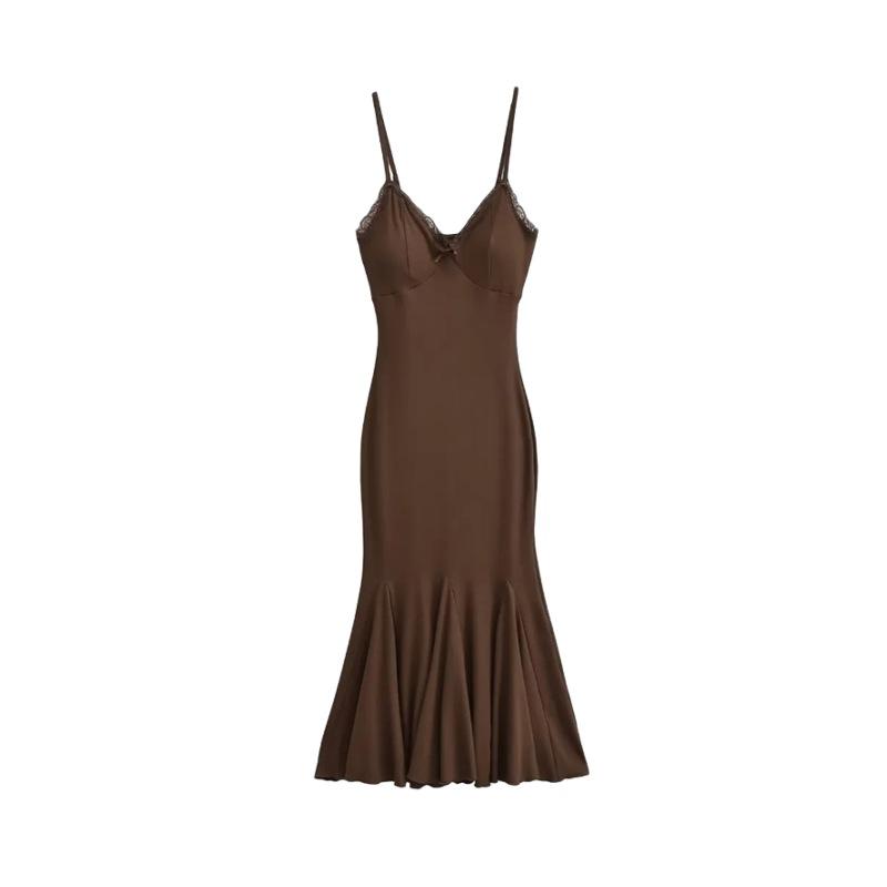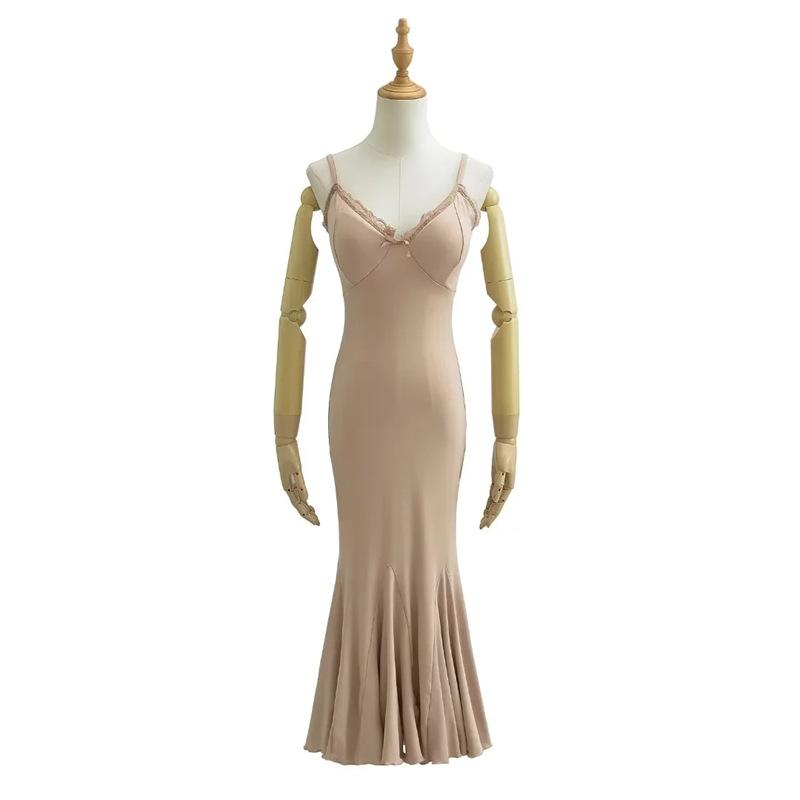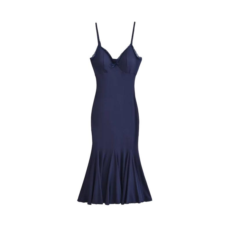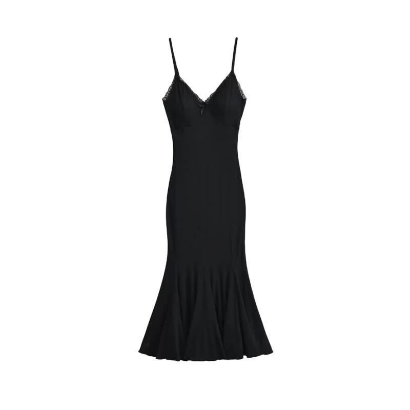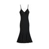 Vestido de mujer con escote en V, encaje, costuras, tirantes finos, diseño sexy, acolchado en el pecho, cola de pez plisada