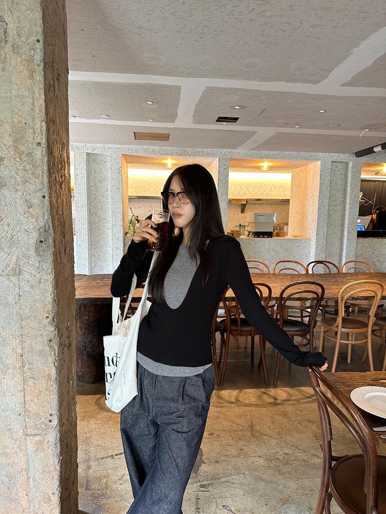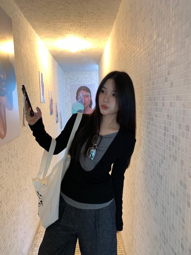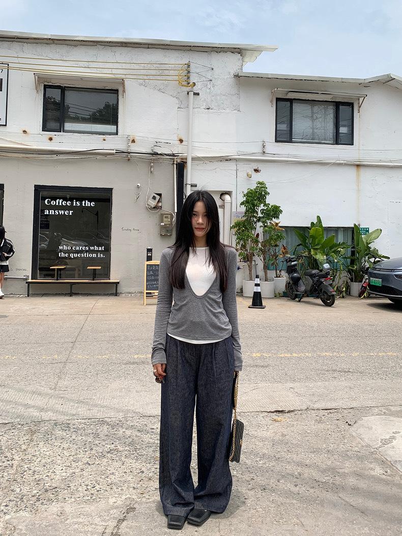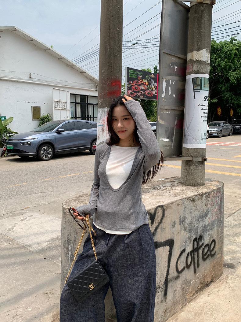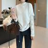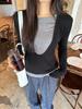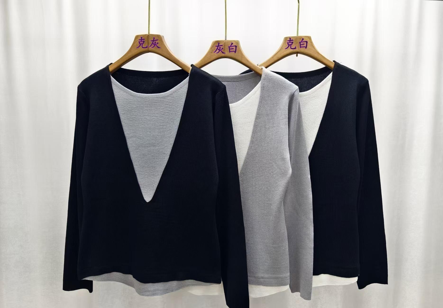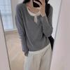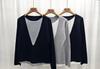 Suéter de punto de dos piezas con cuello redondo y manga larga, estilo coreano, holgado, con costuras falsas en contraste de colores otoñales para mujer